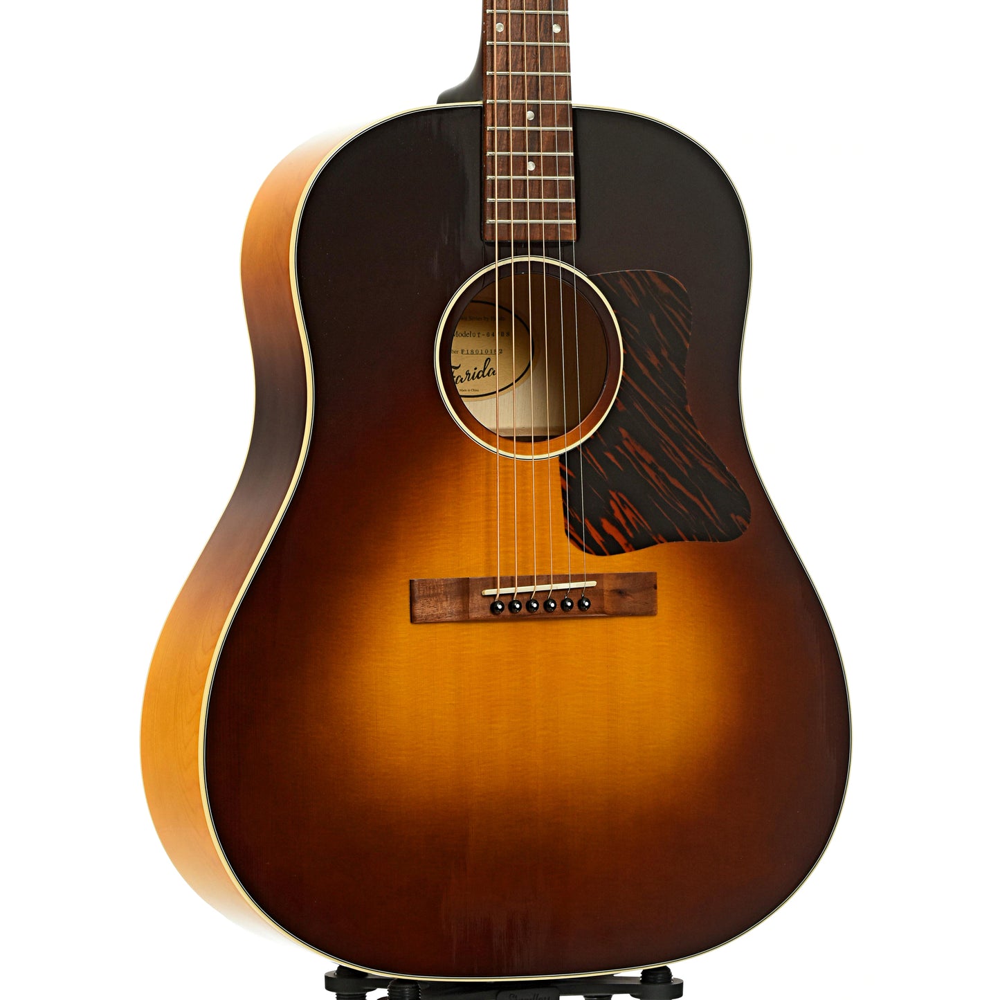 This excellent OT-64 VBS acoustic has a gloss sunburst finish on a solid Sitka spruce top, maple back and sides, and a nato neck. This guitar has both the look and the sound of a coveted vintage instrument. Features include an acacia fingerboard and bridge, and vintage-style 3-on-a-plate tuners. Love at first strum! NO CASE. Import.