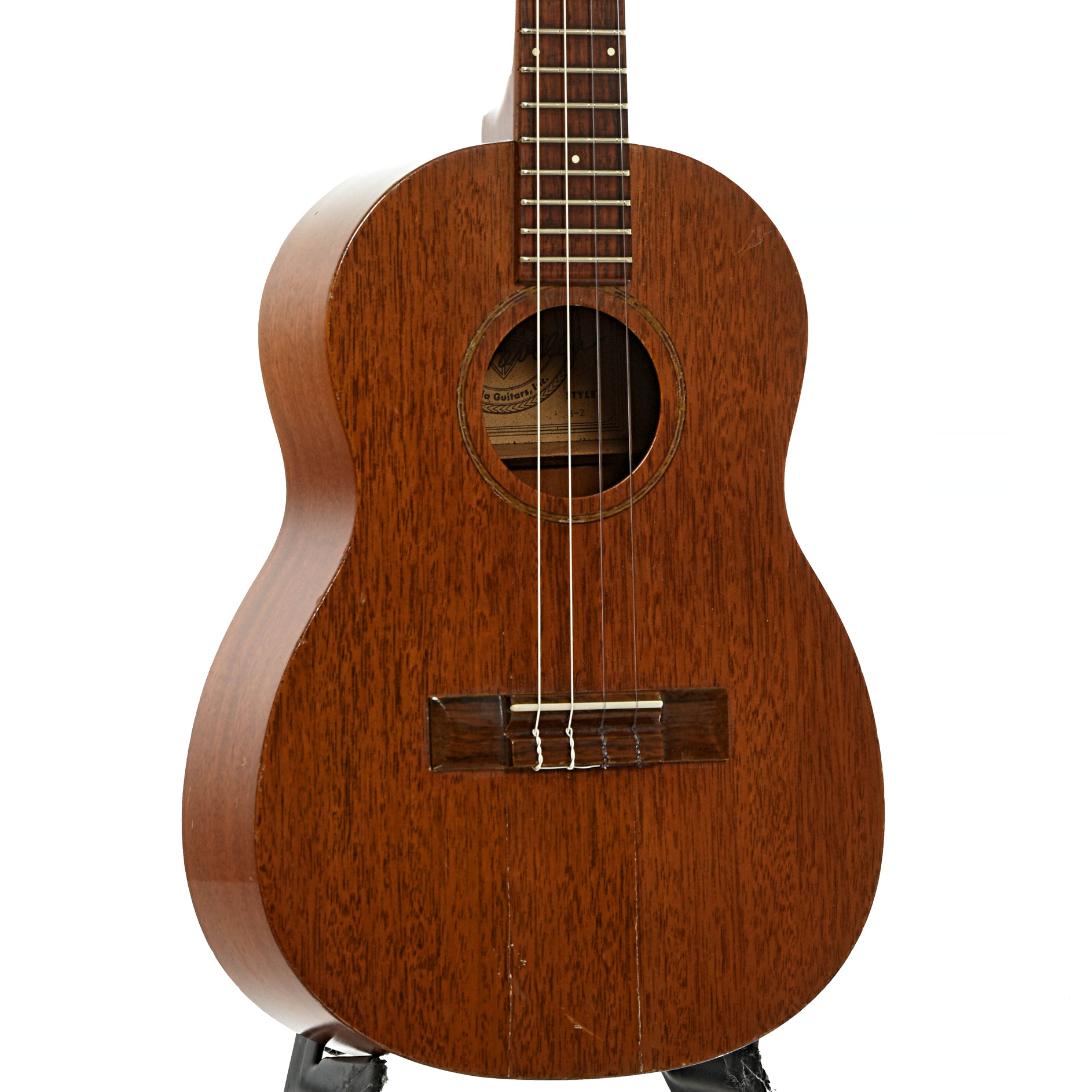 The Favilla brothers were one of the first companies to build baritone ukuleles. This circa 1960 model, the B-2, features a solid mahogany body and 14-fret neck, a Brazilian rosewood fingerboard and bridge, and guitar-style open-gear tuners. Fun to play, sweet tone! Gigbag. Made in USA. On consignment.