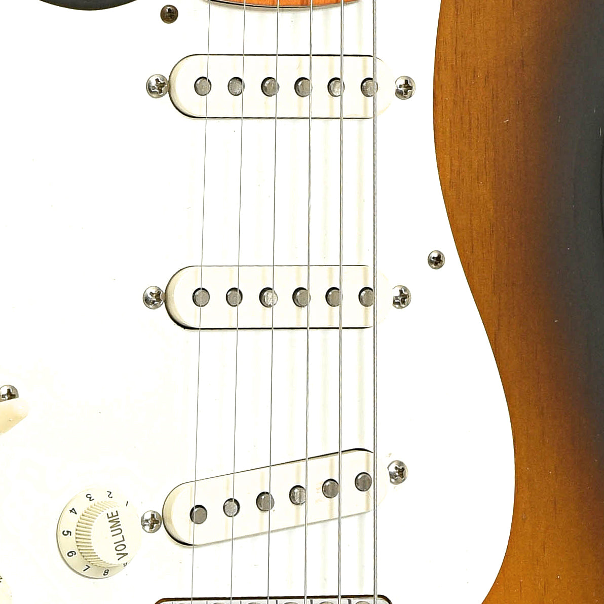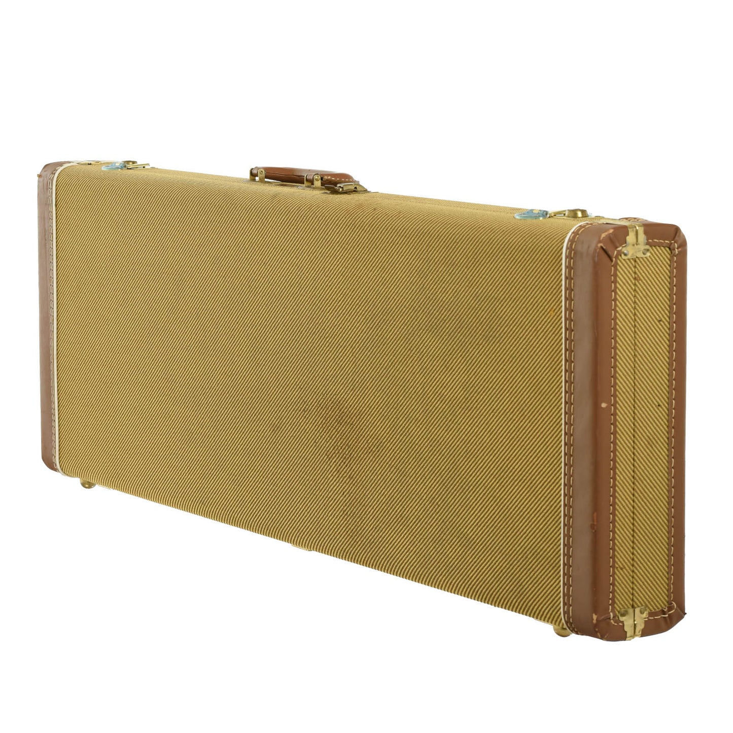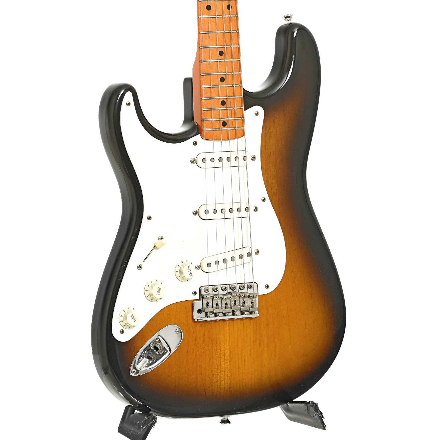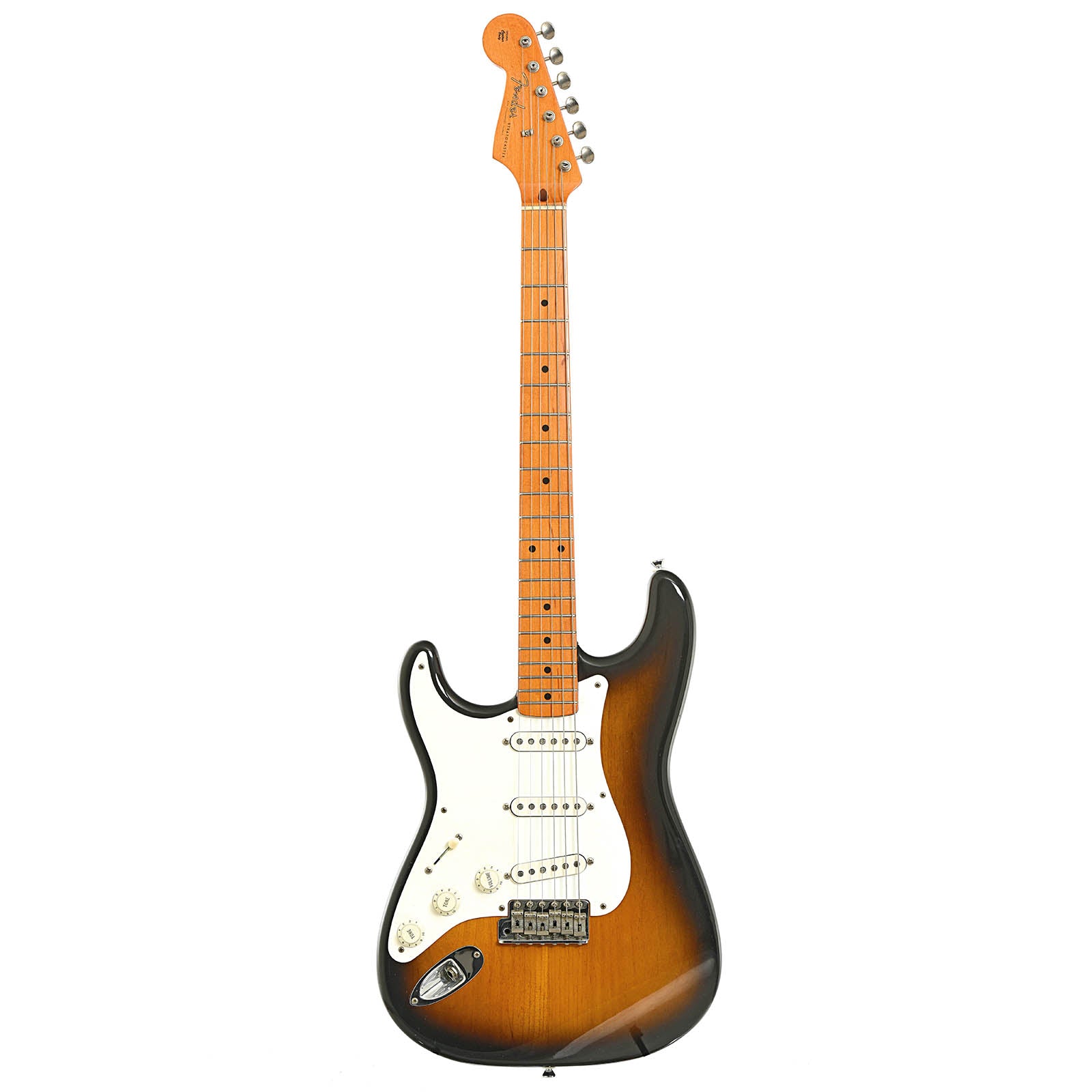 A recreation built by Fender for lefty Strat lovers, this '57 Vintage Reissue Strat features a 2 tone sunburst finish, 1-piece maple neck, 3 single coil pickups, vintage-style tremolo bridge and tuners. Original tweed hard case. Made in USA.