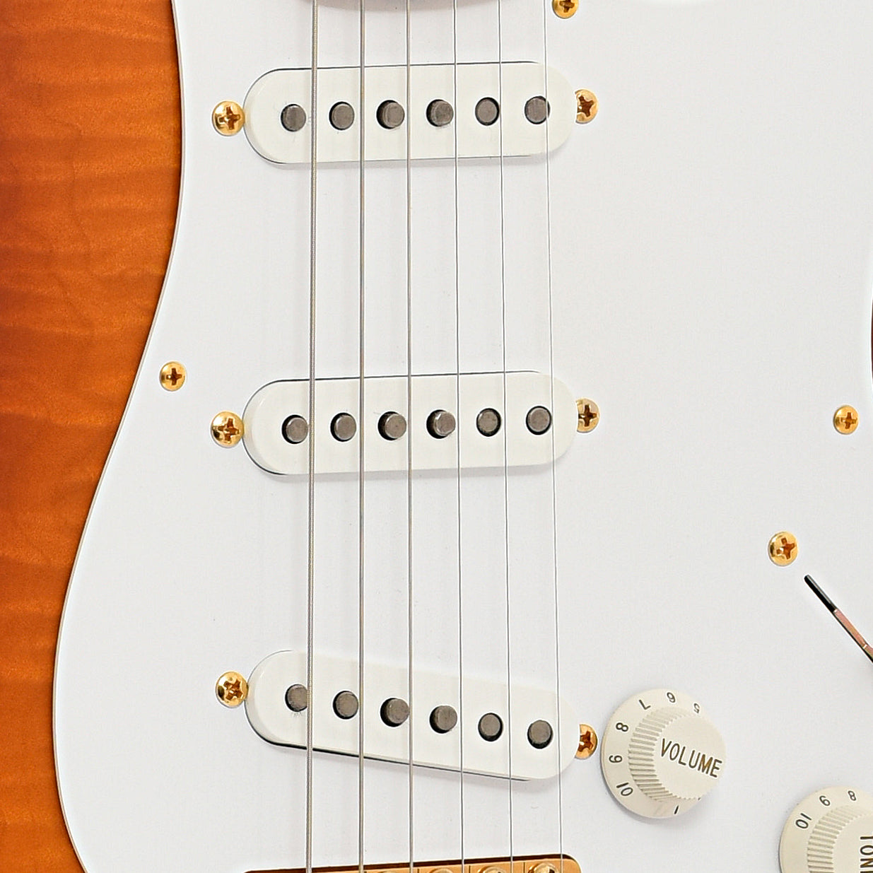 Crafted in the renowned Fender Custom Shop, this Fender 1954 FMT Stratocaster stands out with a cherry sunburst finish, figured maple top on a light ash body and gold hardware. It's equipped with American Vintage tremolo, tuners, and single-coil pickups for that authentic Strat sound. Comes with its original tweed hardshell case. Made in the USA. .