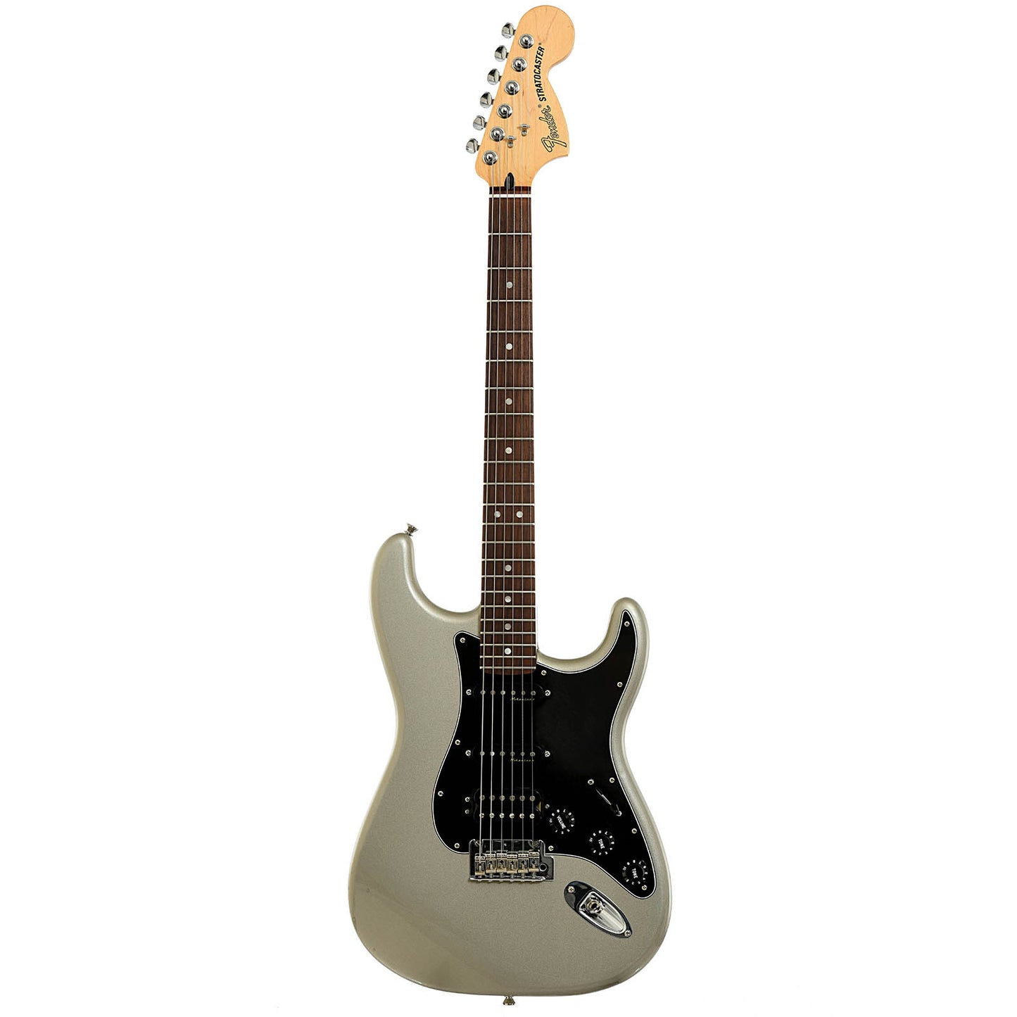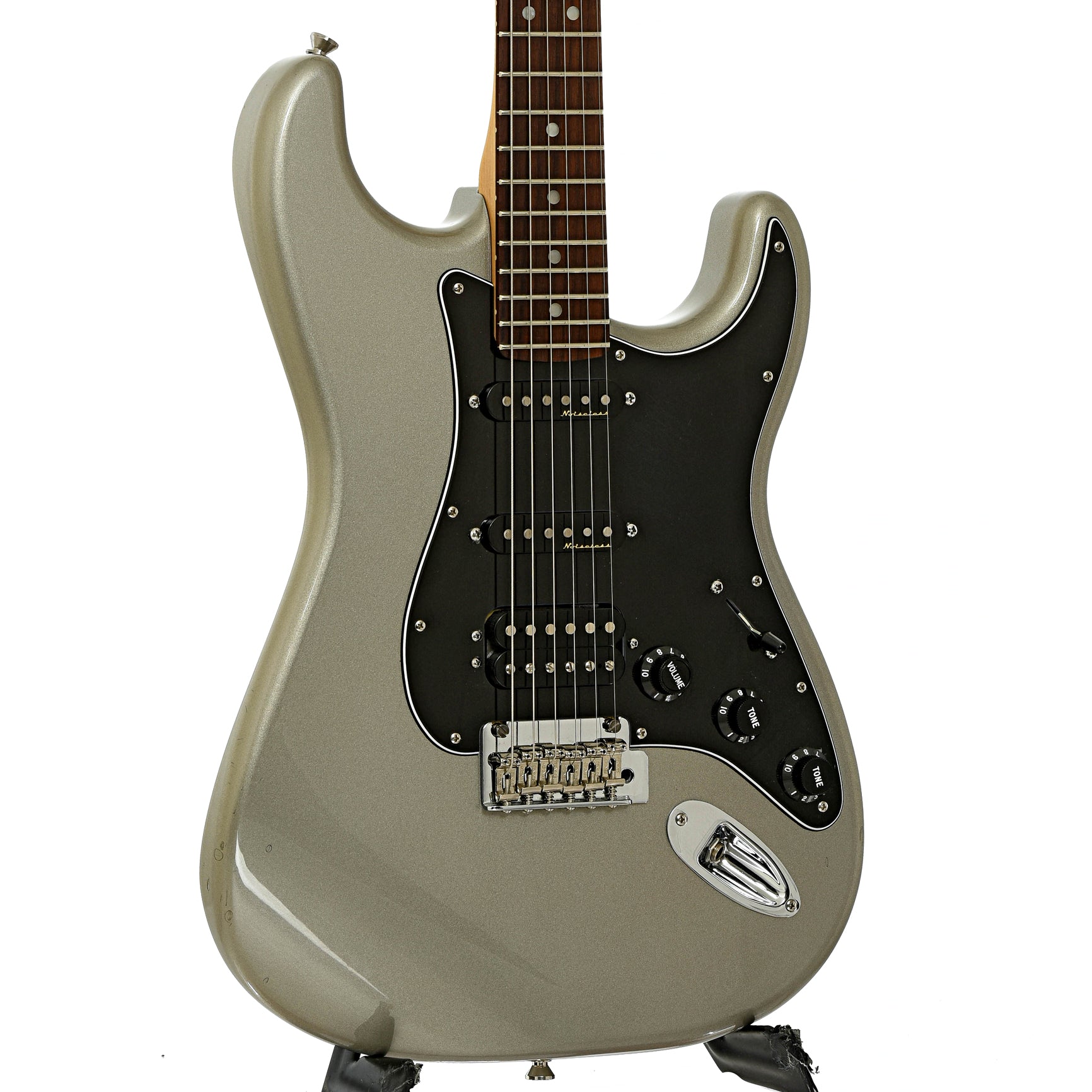 This versatile Deluxe Strat features a Tungsten gloss finish, and a rosewood fingerboard on a maple neck. Equipped with Twin Head Vintage Humbucking and two Noiseless single coil pickups, and a 2-point tremolo bridge with bent steel saddles. The large headstock features sealed locking tuners. Original thermoplastic hard shell case. Import.