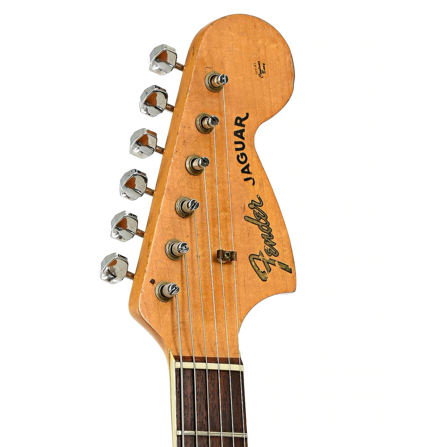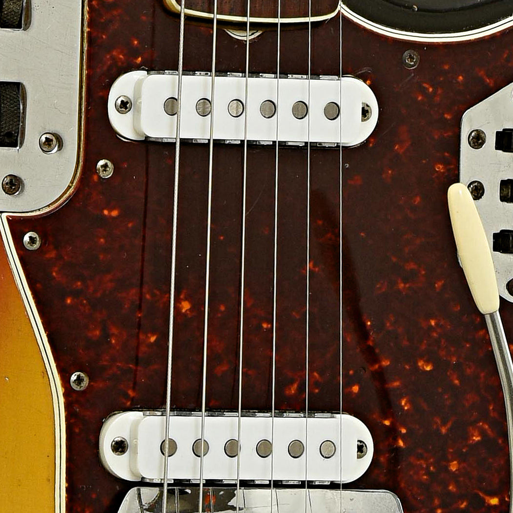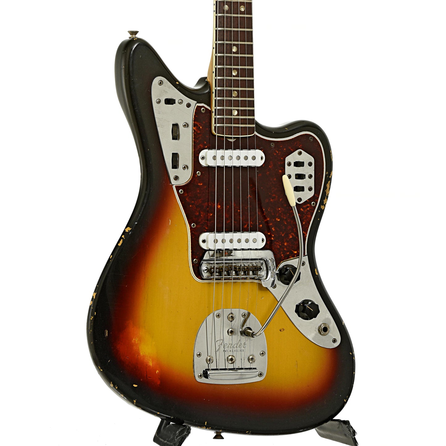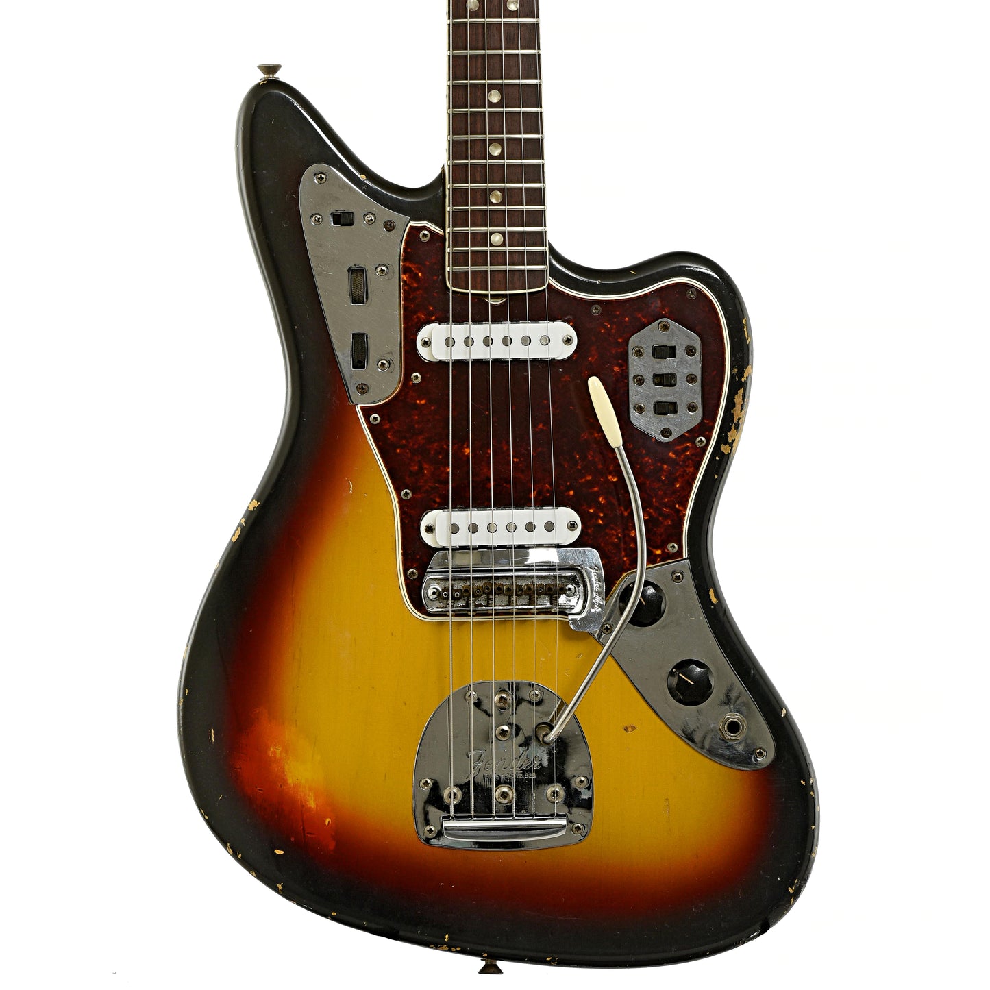 A surf-era classic, this 1966 Fender Jaguar features the original sunburst finish, maple neck stamped "16 FEB 66B", and a bound Brazilian rosewood fingerboard with dot inlays. Equipped with original bridge, tremolo and hardware. Dual Lollar single-coil pickups installed. Original hard shell case. Made in USA. On consignment.