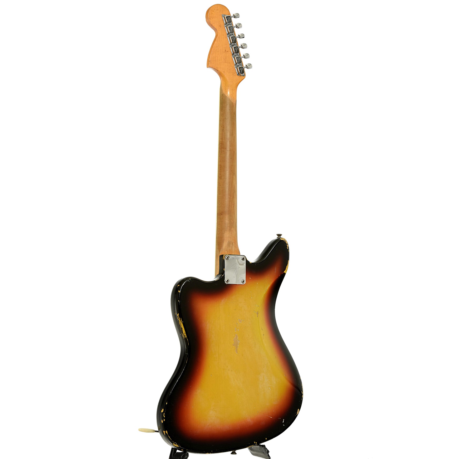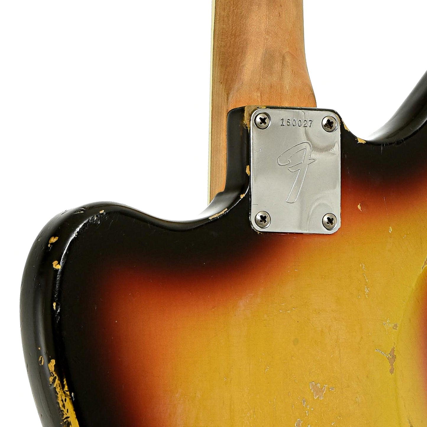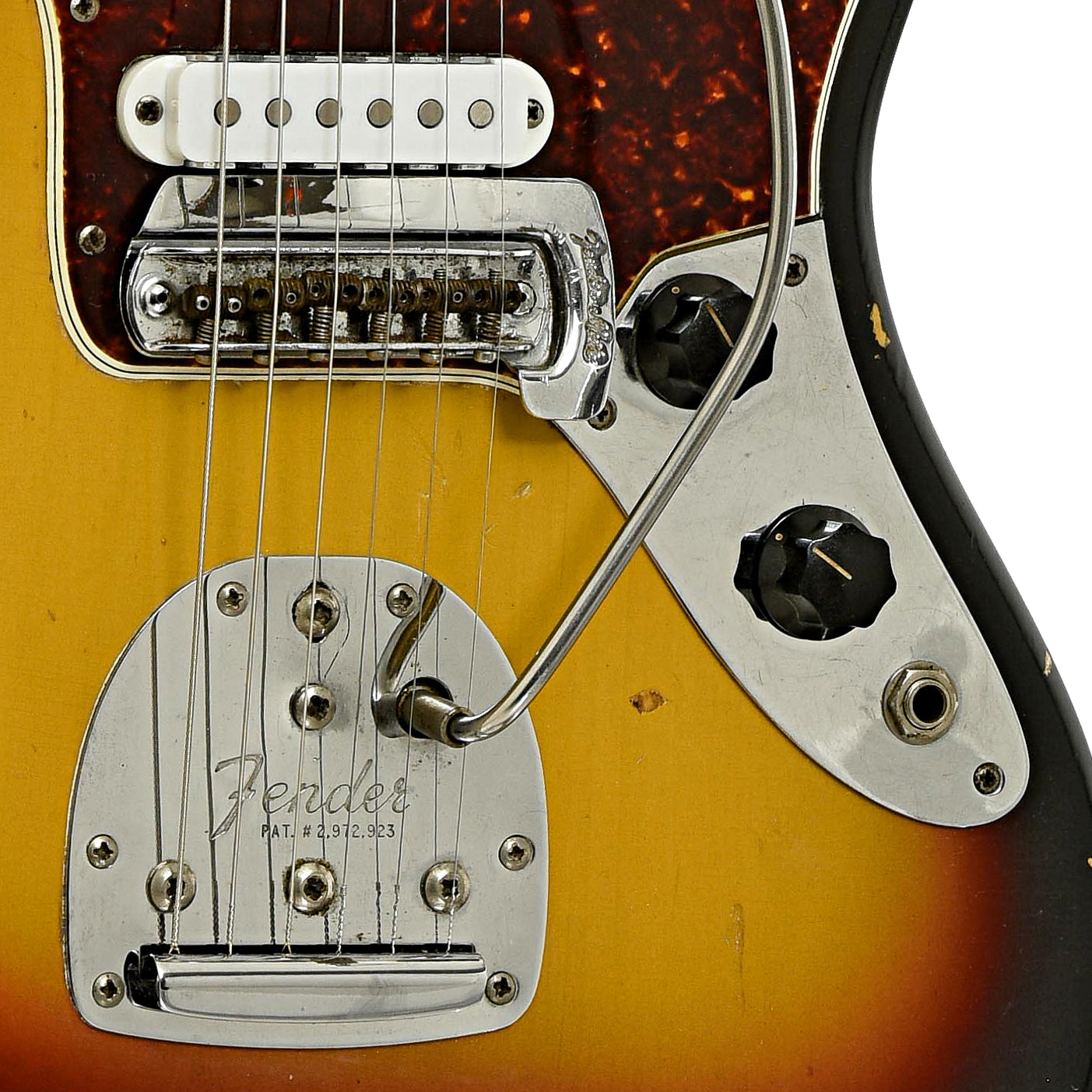 A surf-era classic, this 1966 Fender Jaguar features the original sunburst finish, maple neck stamped "16 FEB 66B", and a bound Brazilian rosewood fingerboard with dot inlays. Equipped with original bridge, tremolo and hardware. Dual Lollar single-coil pickups installed. Original hard shell case. Made in USA. On consignment.