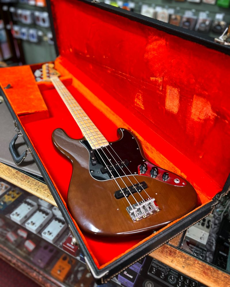 This 1975 Fender Jazz Bass in mocha brown finish is classic all the way. It features a 4-bolt bound maple neck, 22 frets with pearloid block inlays, and dual JB single-coil pickups. Pickup and bridge covers are included in the case. Comes with the original hardshell case. Made in the USA. On consignment.