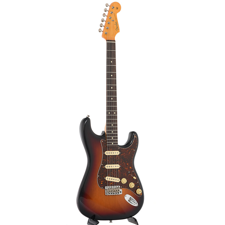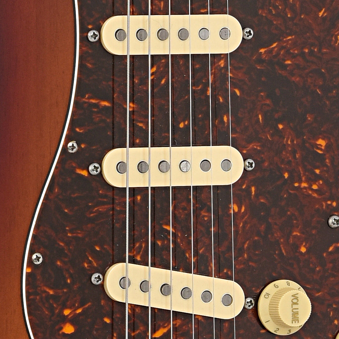 One special Strat, this John Mayer model sports a gloss 3-tone sunburst finish, chunky maple neck, and vintage-style tuners and bridge. Equipped with replacement D. Allen AP Echoes single coil pickups. Bridge pickup coil tap. Great feel, great Strat sounds! Fender Incase padded gig bag. Made in USA.