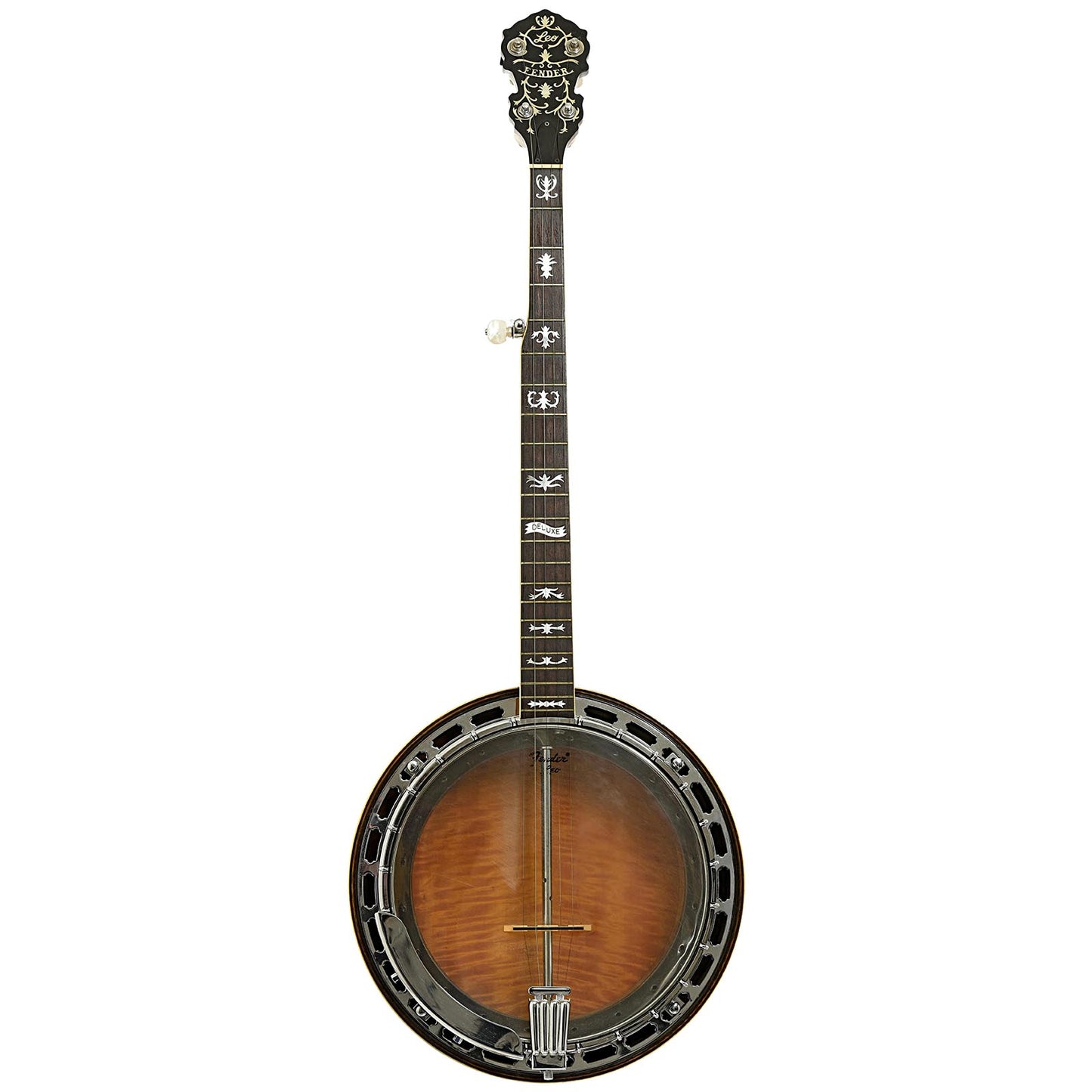 This Fender Leo Deluxe resonator banjo has a double bound flame maple resonator in a sunburst finish. The 3-piece maple neck has a bound rosewood fingerboard with fancy inlays. The multi-ply rim is equipped with a 20-hole flathead tone ring. 2 Keith "D" tuners installed. Period hard shell case. Import model.