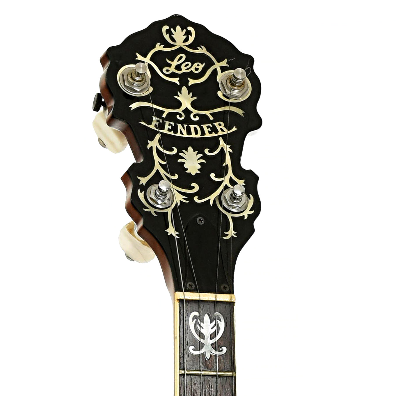 - Black peghead overlay features floral and logo inlays