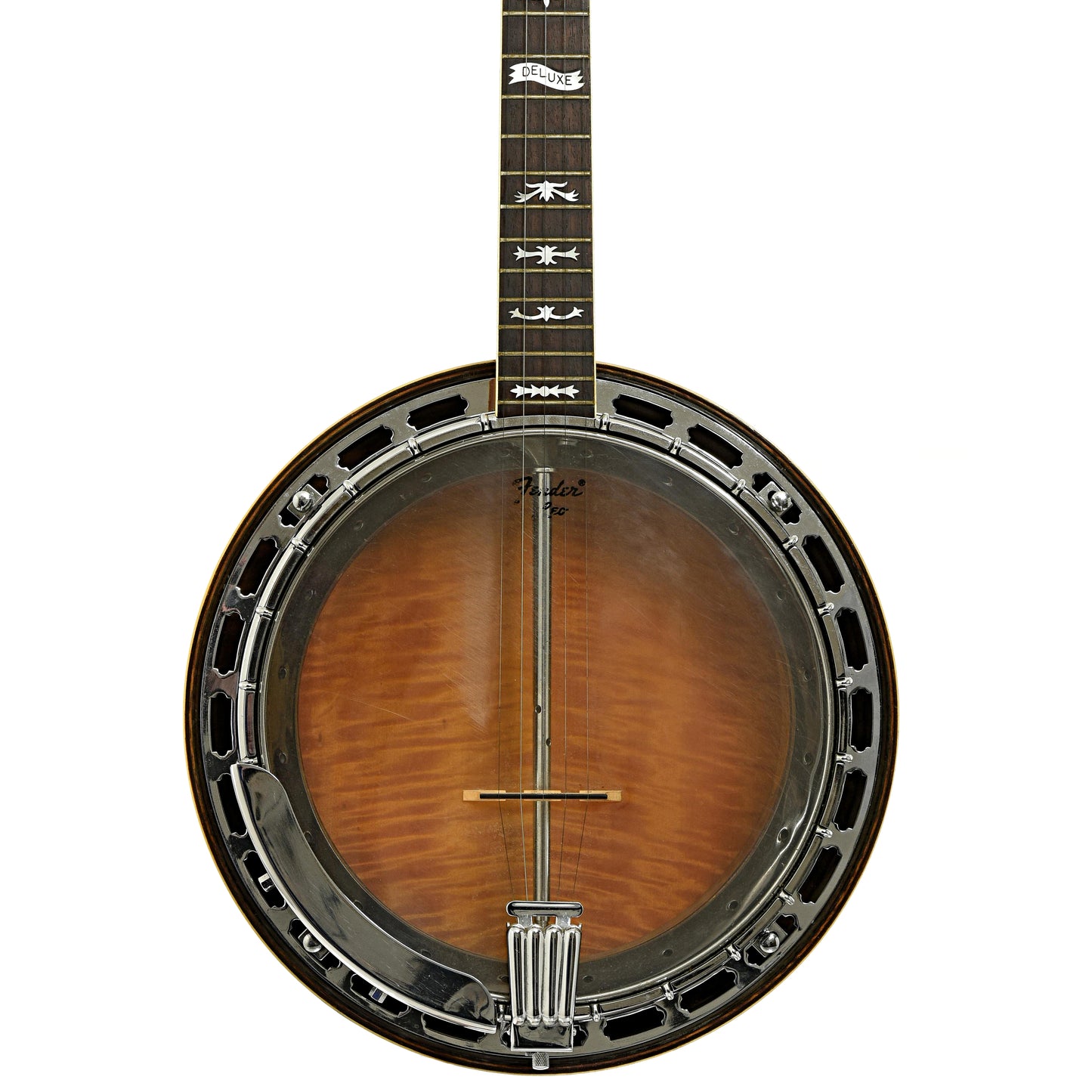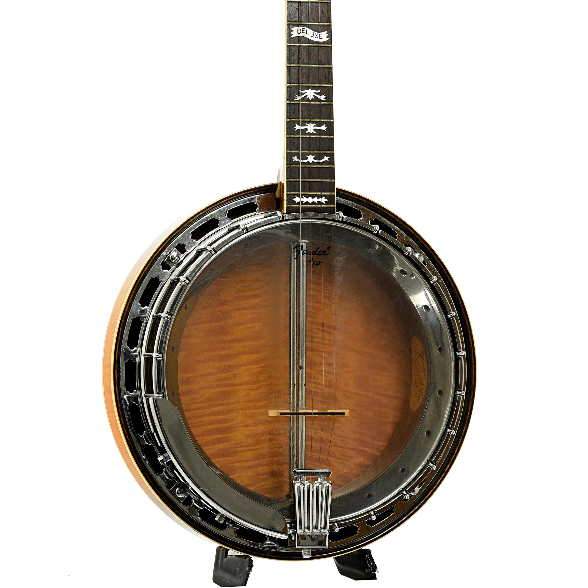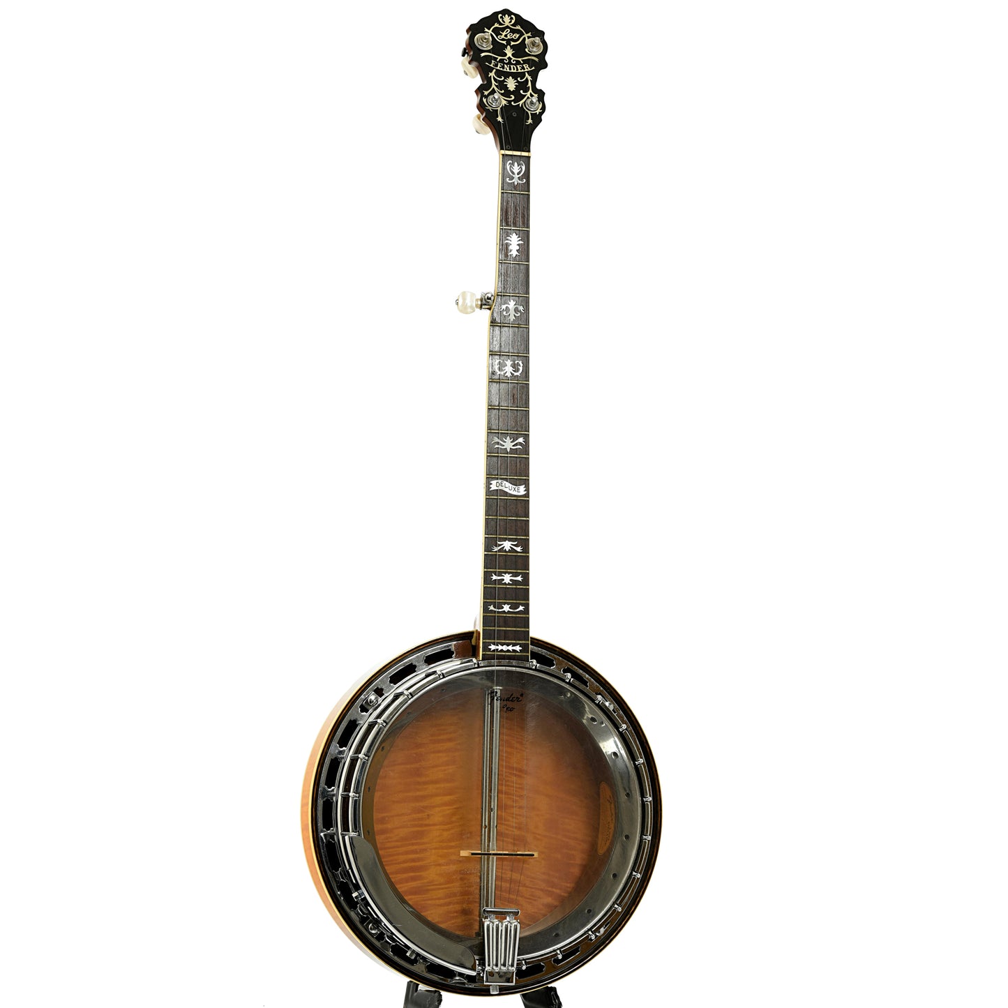 This Fender Leo Deluxe resonator banjo has a double bound flame maple resonator in a sunburst finish. The 3-piece maple neck has a bound rosewood fingerboard with fancy inlays. The multi-ply rim is equipped with a 20-hole flathead tone ring. 2 Keith "D" tuners installed. Period hard shell case. Import model.