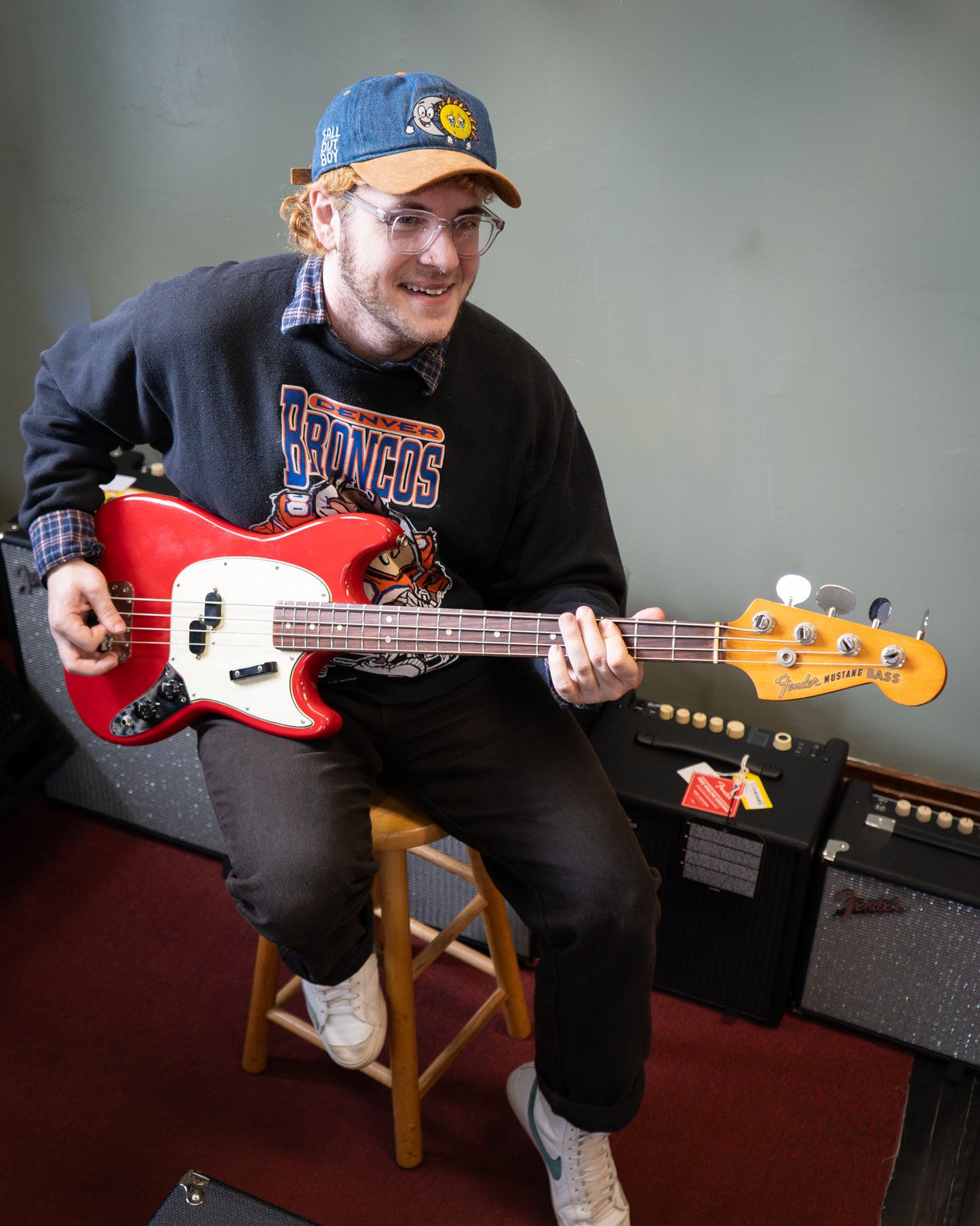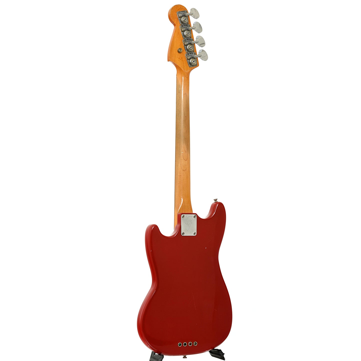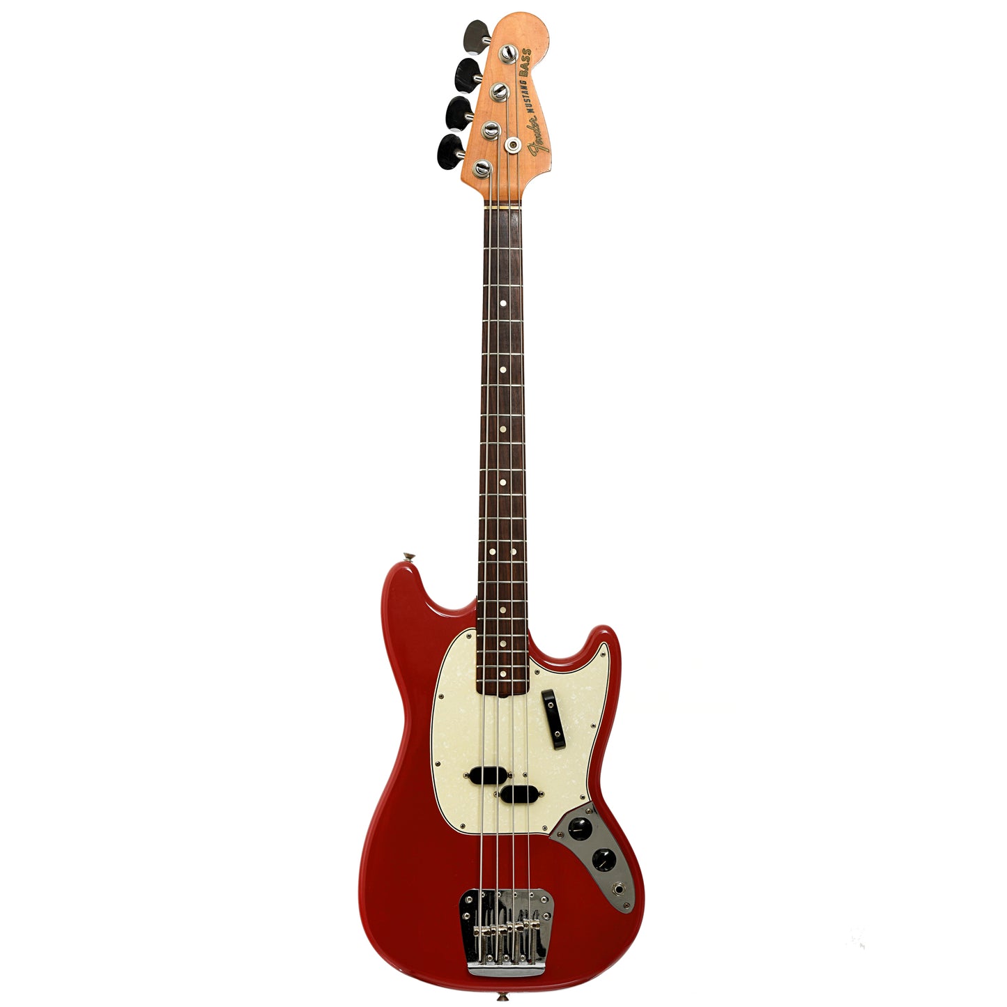 This '66 Mustang Bass thumps! It has the split coil pickup, Brazilian rosewood fingerboard on maple neck, and a string-thru-body bridge. Era-specific features include a tug bar, "hootenanny" peghead-mounted strap button, and "lollipop" tuner buttons. Refinished lighter shade of Dakota Red. Original hard shell case. Made in USA. On consignment.