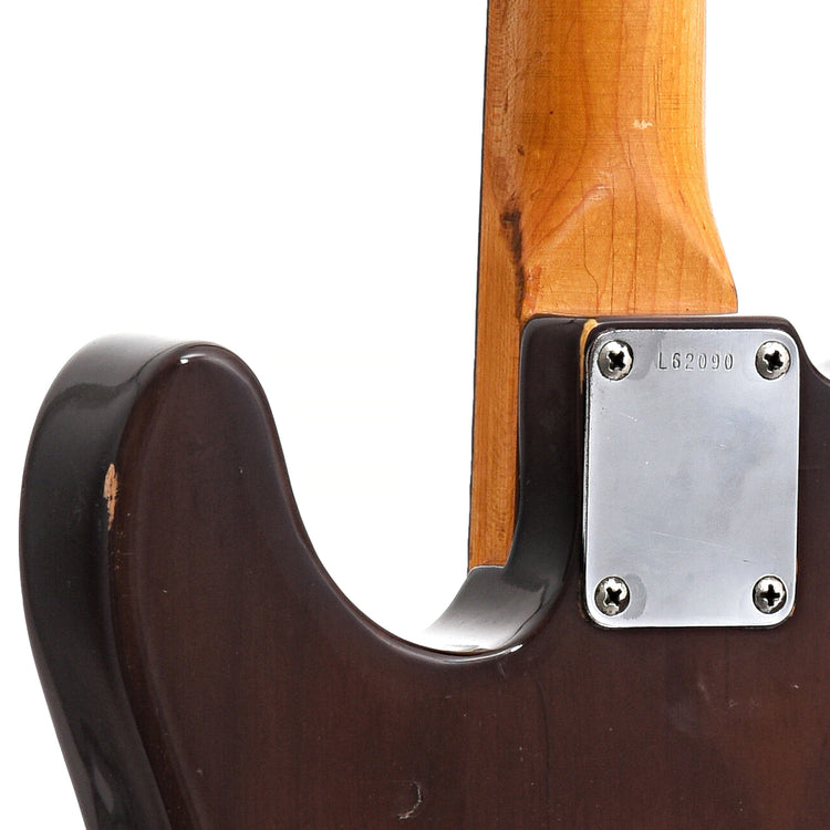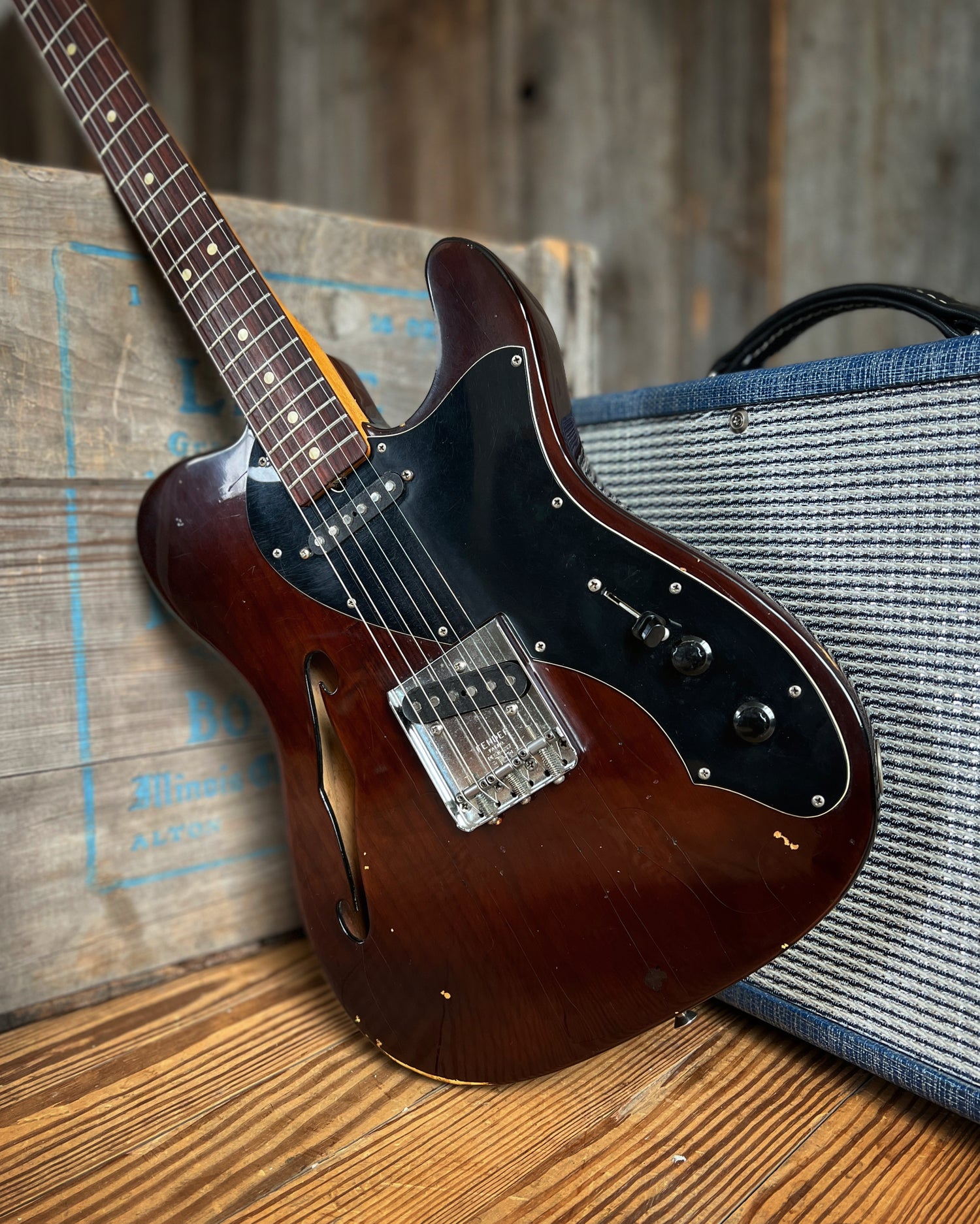 A great player’s guitar built from vintage Fender parts. It features a Thinline body (c.1969) refinished in walnut brown, with several extra routs (largest one plugged). The Esquire neck is dated 1965, with a Brazilian rosewood fretboard, dot markers, and a 1-5/8" nut. Equipped with replacement single-coil pickups (bridge pickup is an import, neck is a Fender Strat pickup), an original bridge, and original tuners. Includes a ’60s Fender hard case. On consignment.