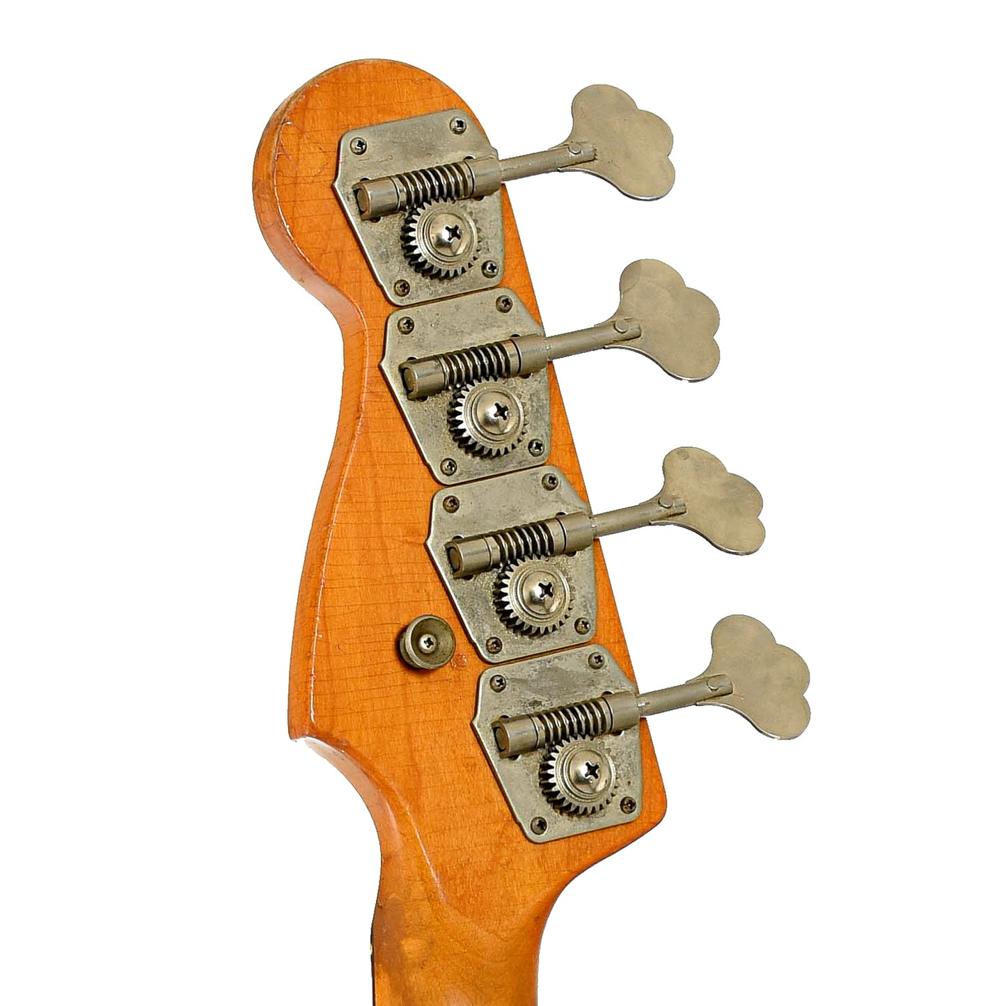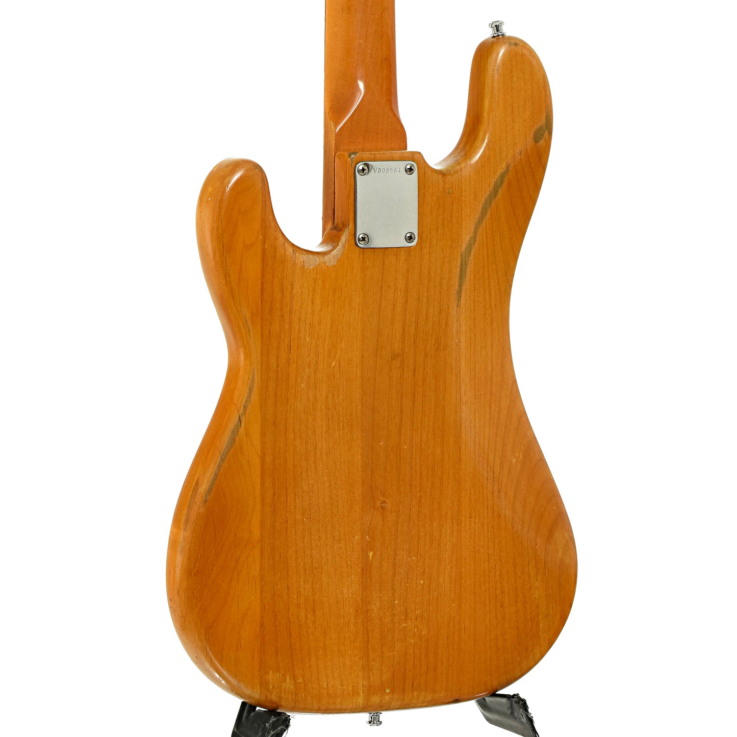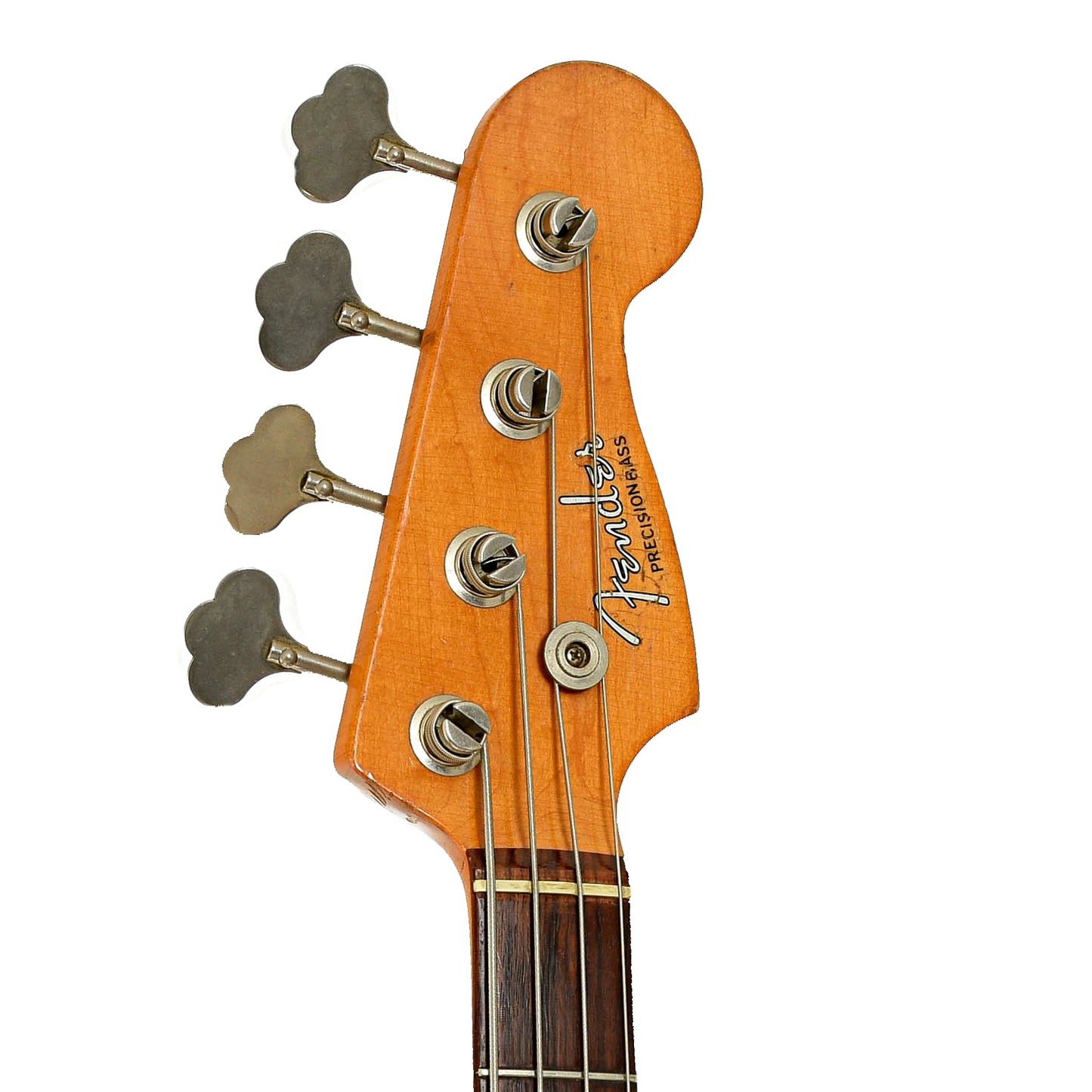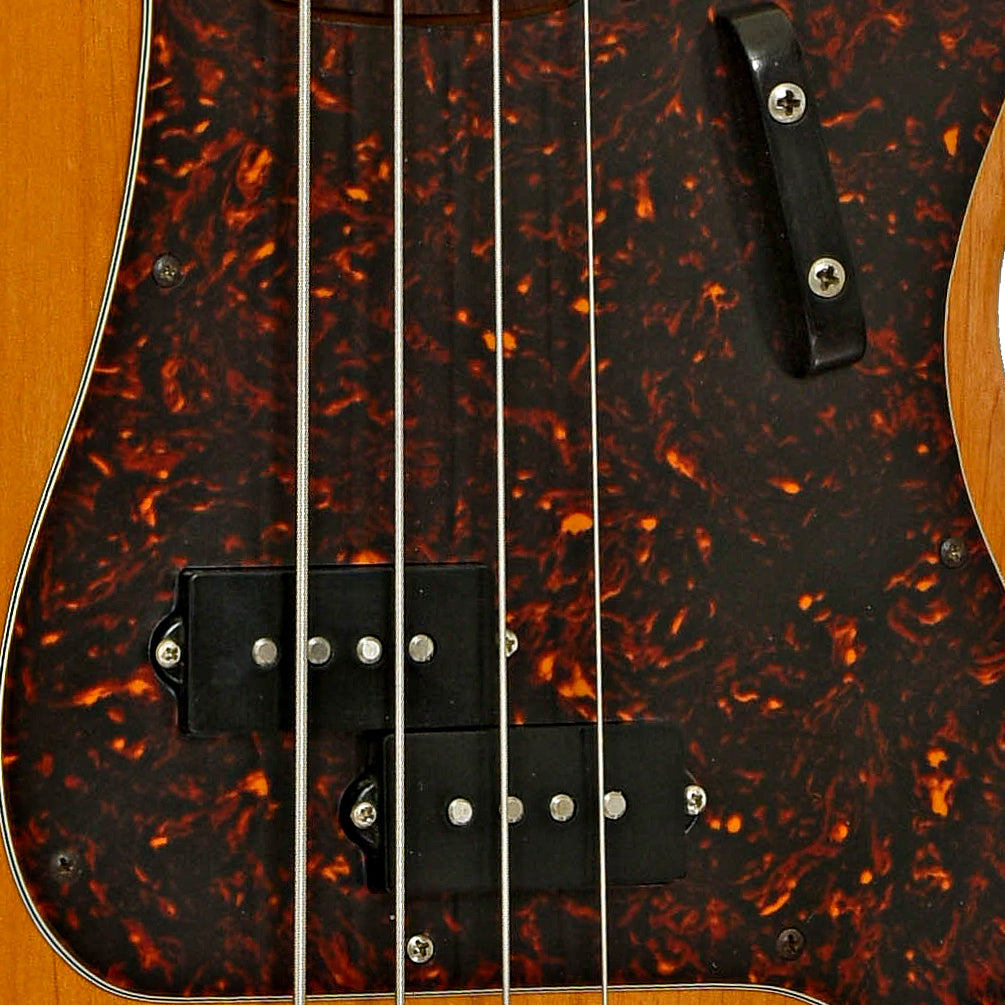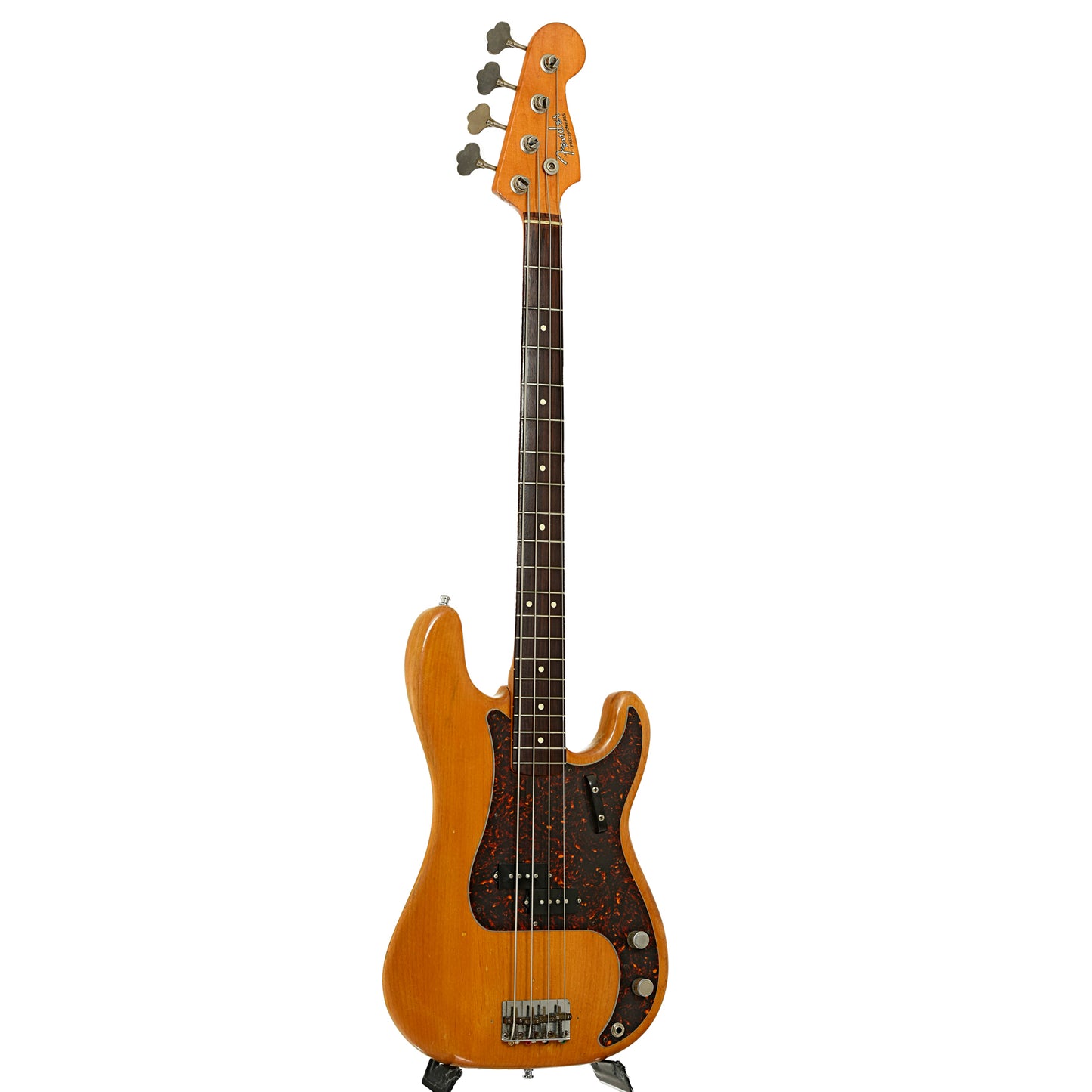 This Vintage Reissue Precision Bass features an ash body refinished in clear lacquer, a bolt-on maple neck, and a rosewood fingerboard with a wide 1-3/4" nut. Replacement split-coil pickup and electronics. Replacement tortoise plastic pickguard. finger-rest installed. Equipped with a top-loading bridge and open-gear tuners. Original hard shell case (broken latch). Made in USA.