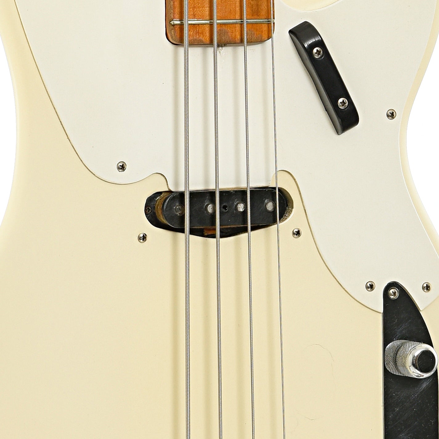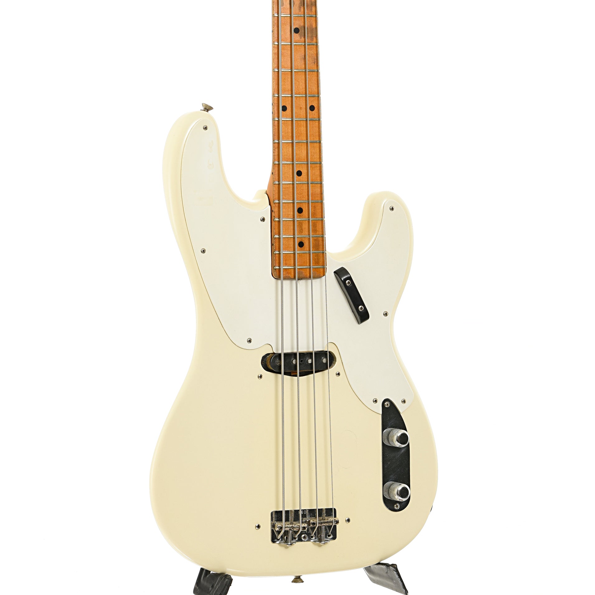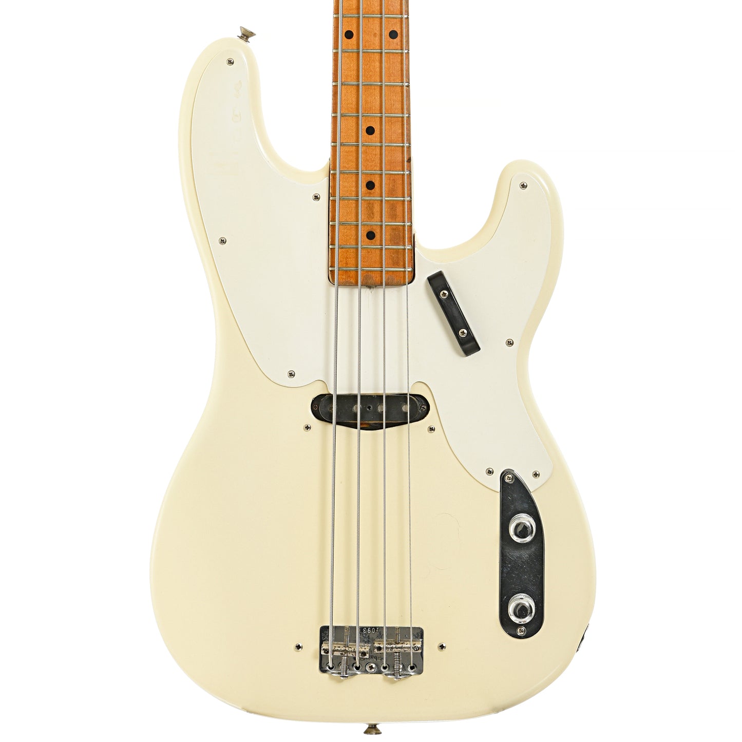 Player grade dandy, a true low end machine, body refinished white, 1 piece maple neck was refinished at Fender (some time ago) where it received a new logo decal, the single coil pickup, electronics, (2 barrel) bridge, tuners, pickguard and metal parts (knobs, etc.) appear all original, original bridge and pickup covers included,