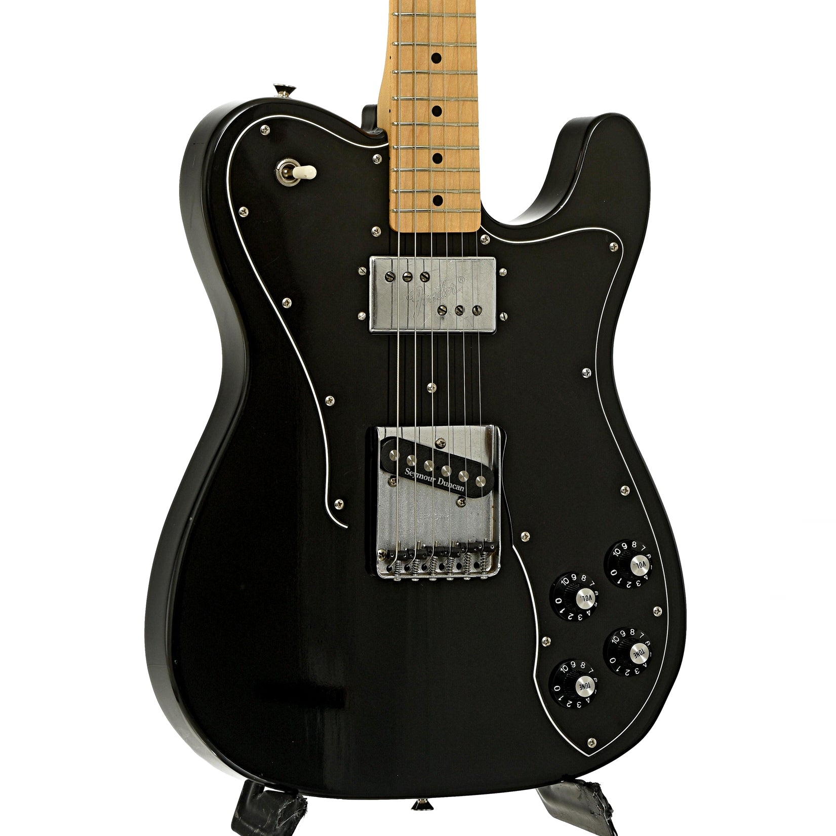 As played by Keith Richards, features on this Tele Custom include a gloss black finish, and 21 frets on a 3-bolt maple neck. Equipped with a single-coil and a Wide Range humbucking pickups. It has an ashtray bridge with barrel saddles and Gotoh tuners. NO CASE. Crafted in Japan.