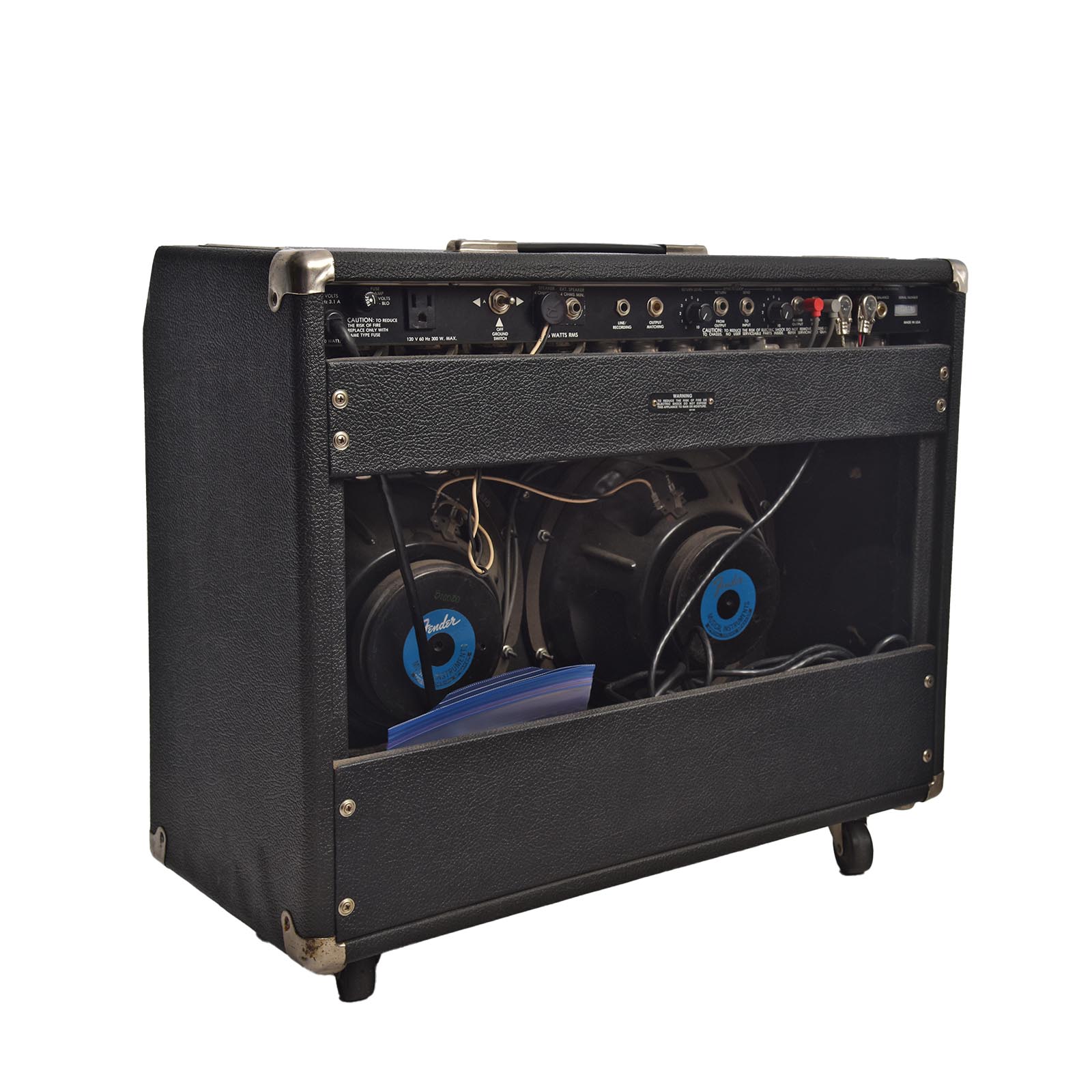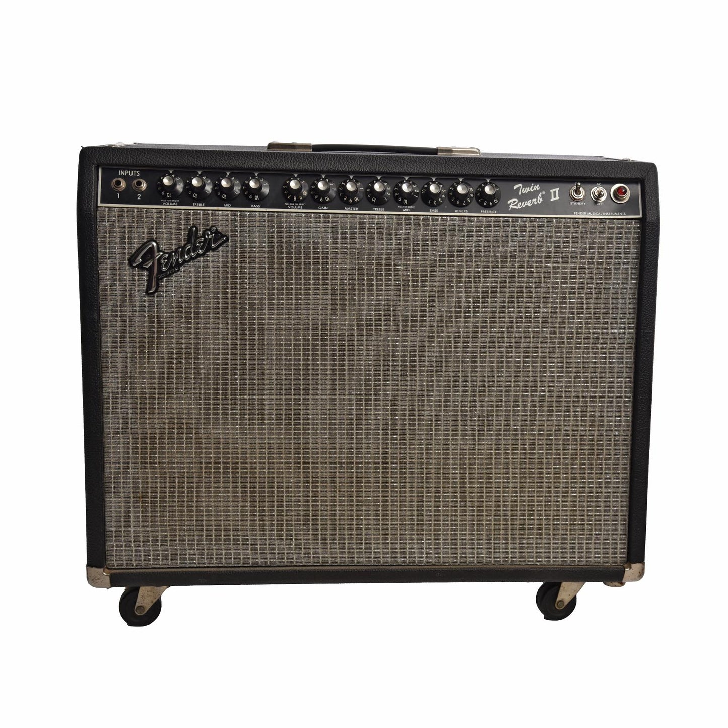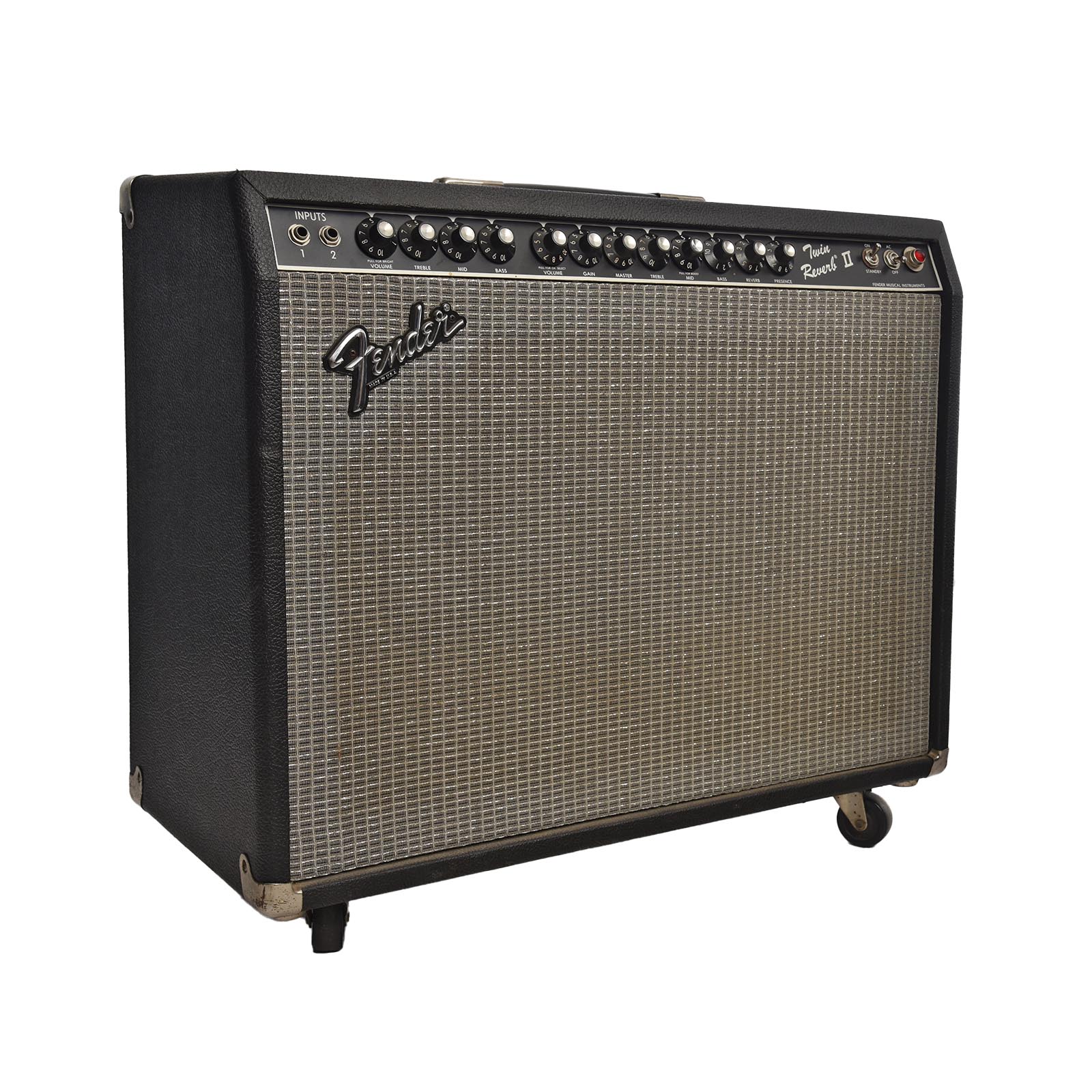 Rivera-era Fender Twin Reverb II from 1983, delivering 100 tube watts through a pair of 12" Fender-labeled Eminence speakers. Features channel switching, reverb, and a mid boost on the lead channel. Plenty of power and punch.