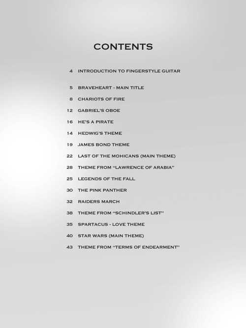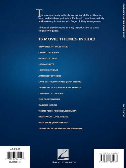 15 famous pieces from blockbuster movies like Braveheart, Harry Potter, The Pink Panther, Pirates of the Caribbean, Star Wars and more, arranged for solo guitar. Each solo is written for intermediate level guitarists, combining melody and harmony in one superb fingerpicking arrangement. Note/tab. 47 pp.