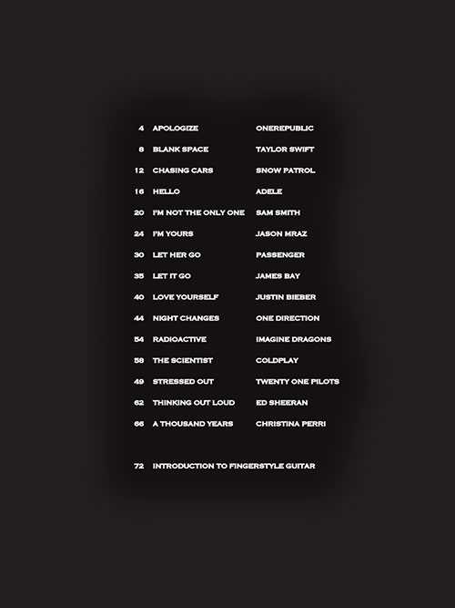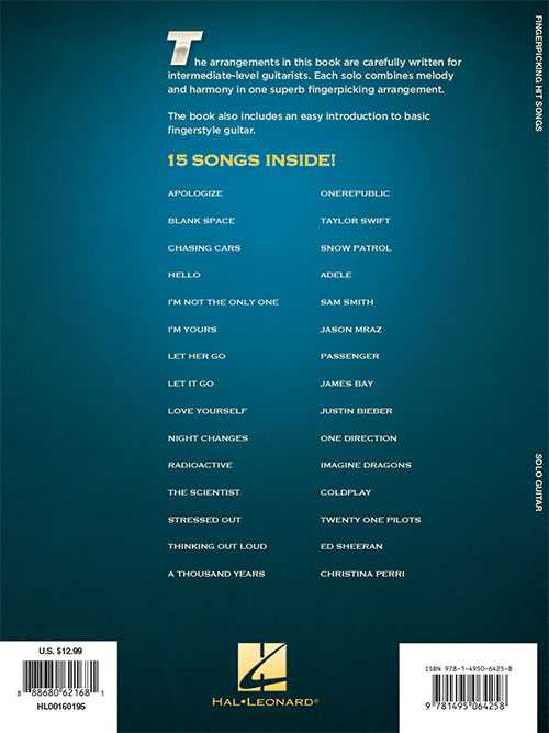 Play 15 recent hits. Each intermediate level solo combines melody and harmony in one superb fingerpicking arrangement. "Apologize," "Blank Space," "Chasing Cars," "Hello," "I'm Not the Only One," "I'm Yours," "Let Her Go," "Let It Go," "Love Yourself," "Night Changes," "Radioactive," "The Scientist," "Stressed Out," "Thinking Out Loud" and "A Thousand Years." Note/tab. 72 pp.