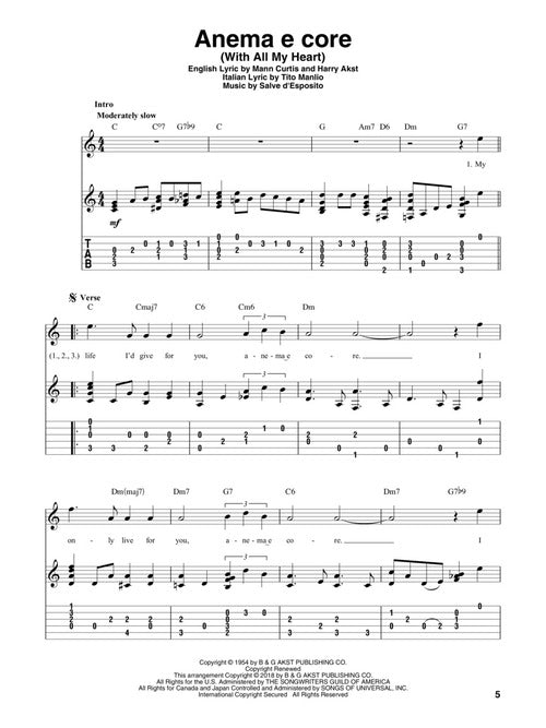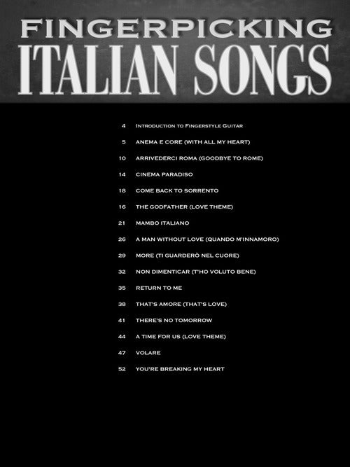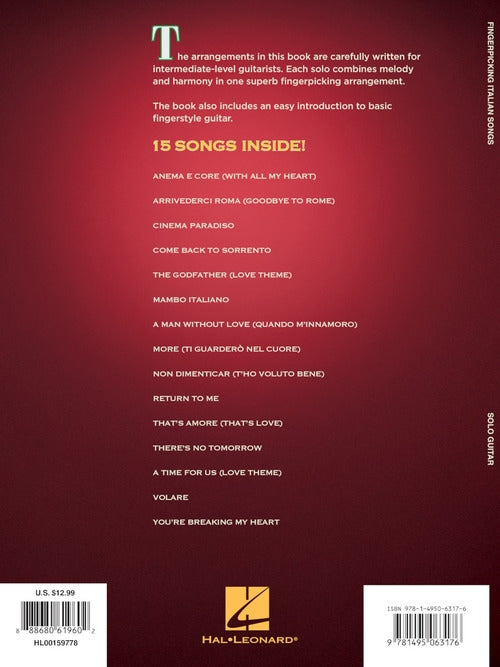 Sound like a pro with these 15 solo guitar arrangements carefully written for intermediate-level guitarists. Each solo combines melody and harmony in one superb fingerpicking arrangement. Also includes an easy introduction to basic fingerstyle guitar. Anema E Core (With All My Heart), Cinema Paradiso, The Godfather (Love Theme), Mambo Italiano, A Man Without Love (Quando M'Innamoro), Return to Me, That's Amore (That's Love), A Time for Us (Love Theme), Volare, and more. Note/tab. 53 pp.