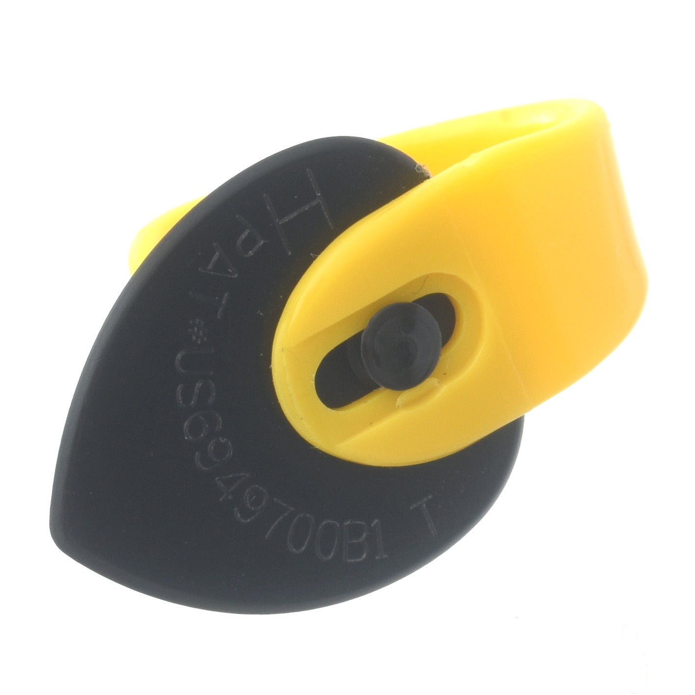 A more commodious version of the Kelly Bumblebee tear drop pick. Adjustable, combo flat / thumb pick, medium gauge Delrin.