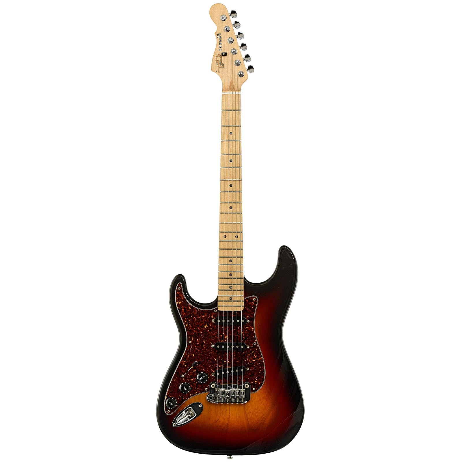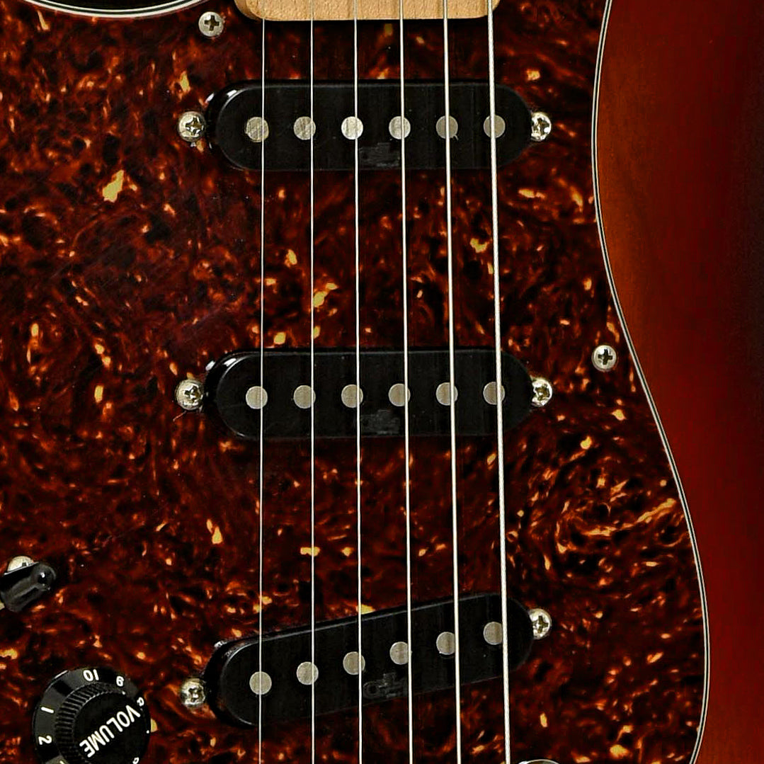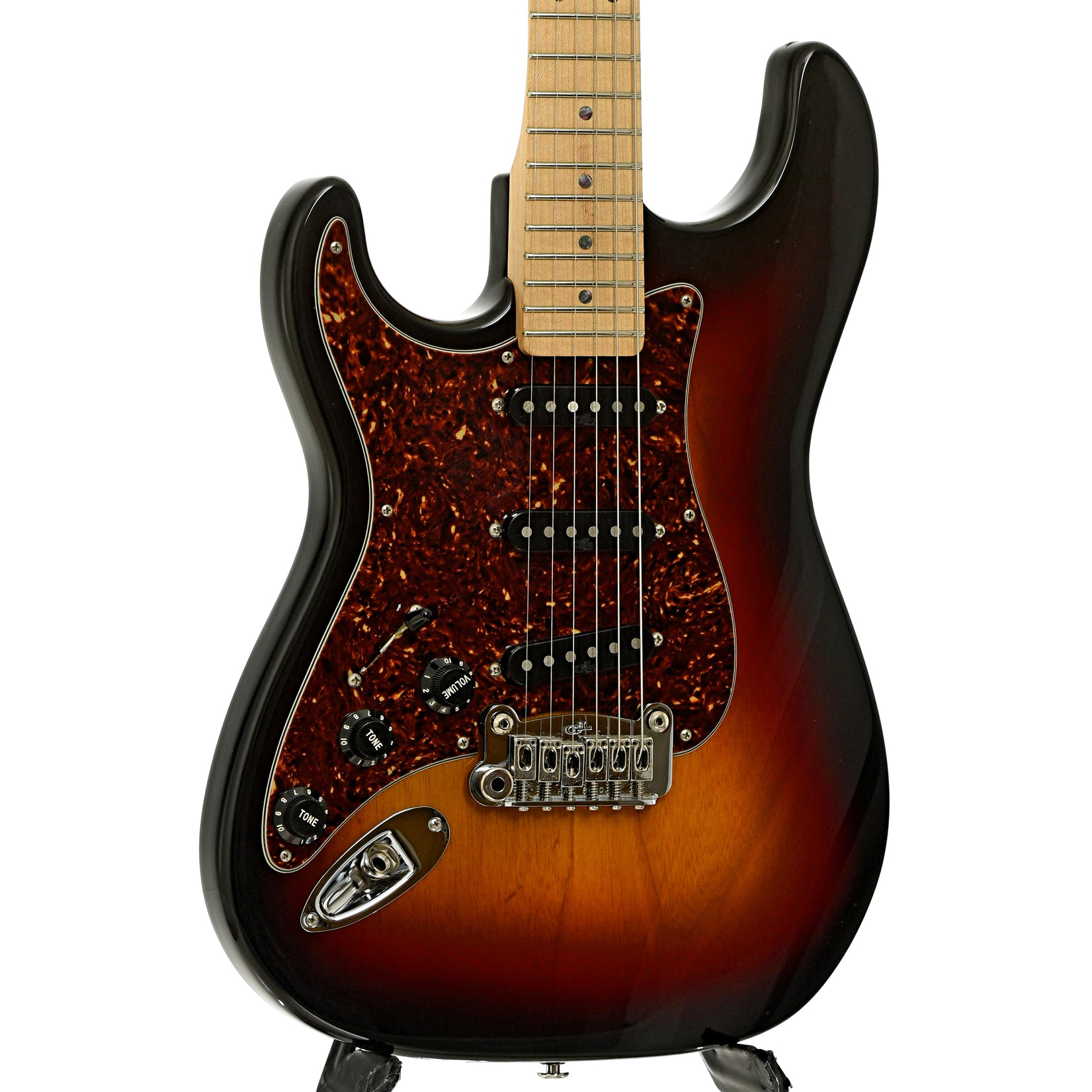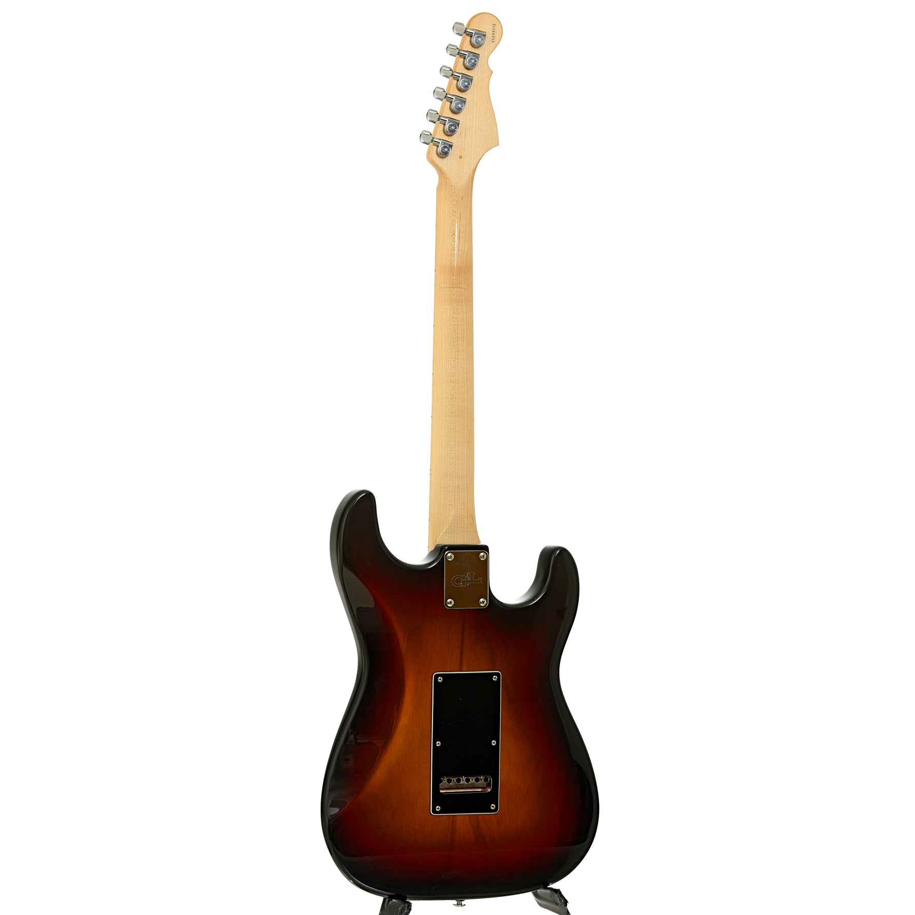A left-handed G&L Legacy with plenty of snap and twang. This model features a 3-tone sunburst finish on an ash body, a 2-point tremolo bridge with block saddles, and three single-coil pickups. Includes a thermoplastic hard shell case. Made in USA.