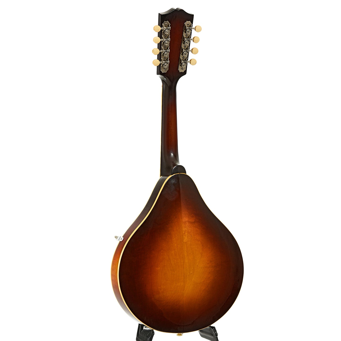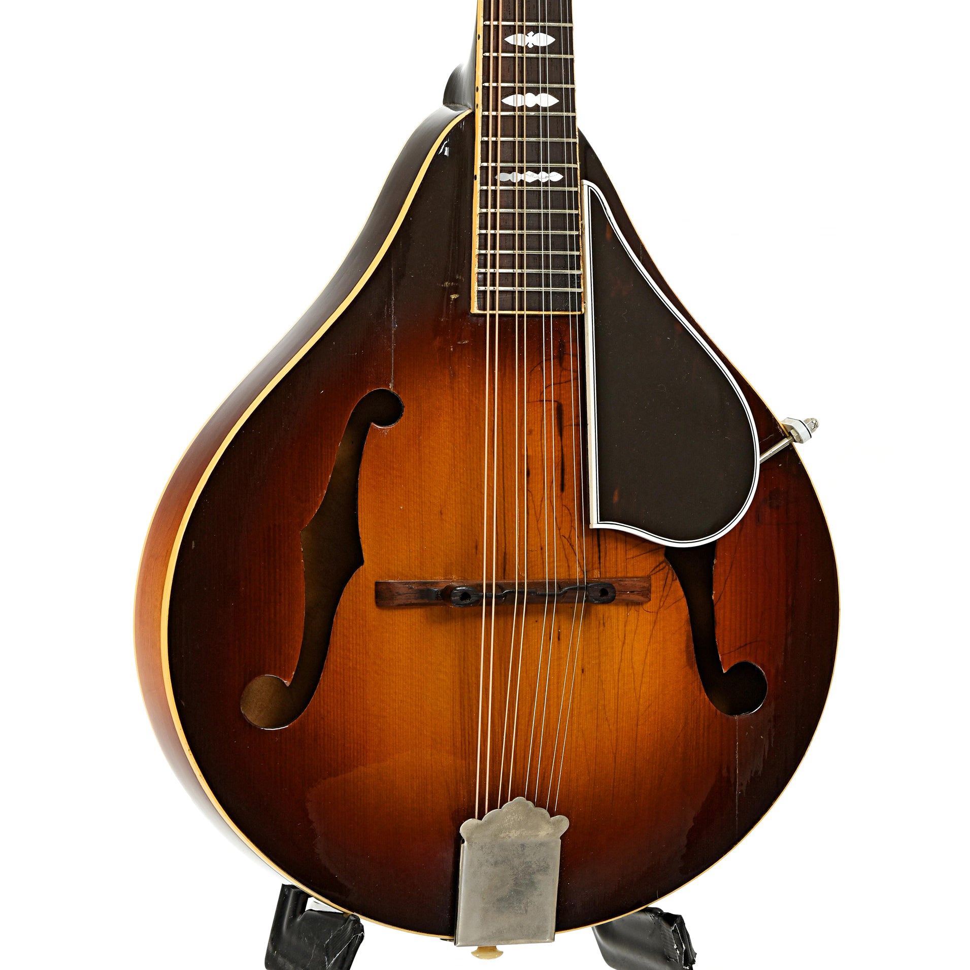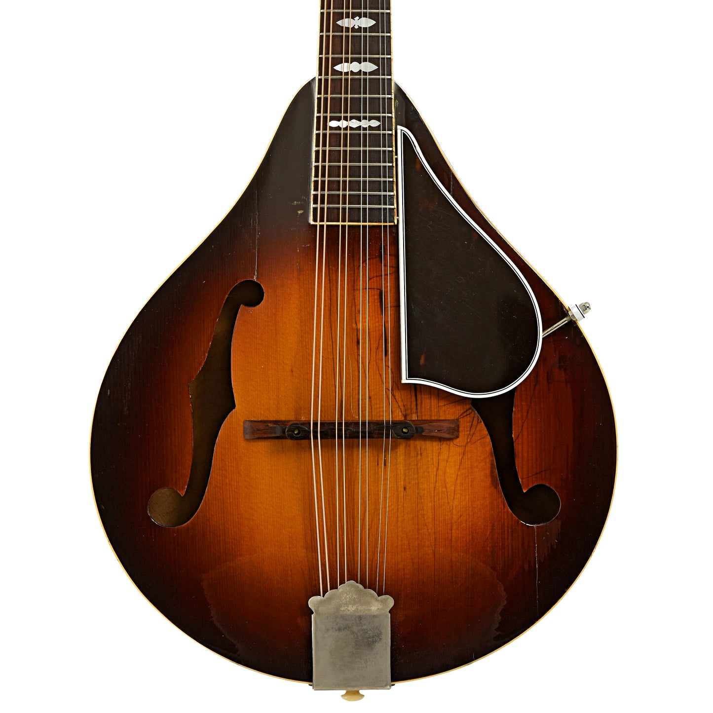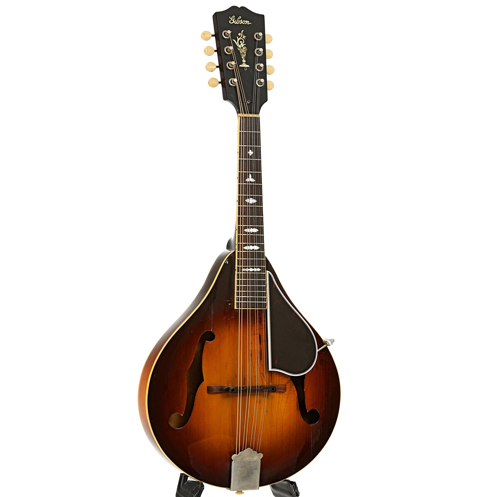 This A-50's unique and larger 11" "bell" shaped bound body was a short-lived variation on a sought-after model. It has a sunburst finish, spruce top with large f-holes, highly figured maple back and sides, mahogany neck with paddle peghead features "Gibson" logo and flowerpot inlay, and a bound 20-fret Brazilian rosewood fingerboard with pearl varied pattern inlays (similar to Nick Lucas). Hiscox thermoplastic hard shells case. Made in Kalamazoo, USA.