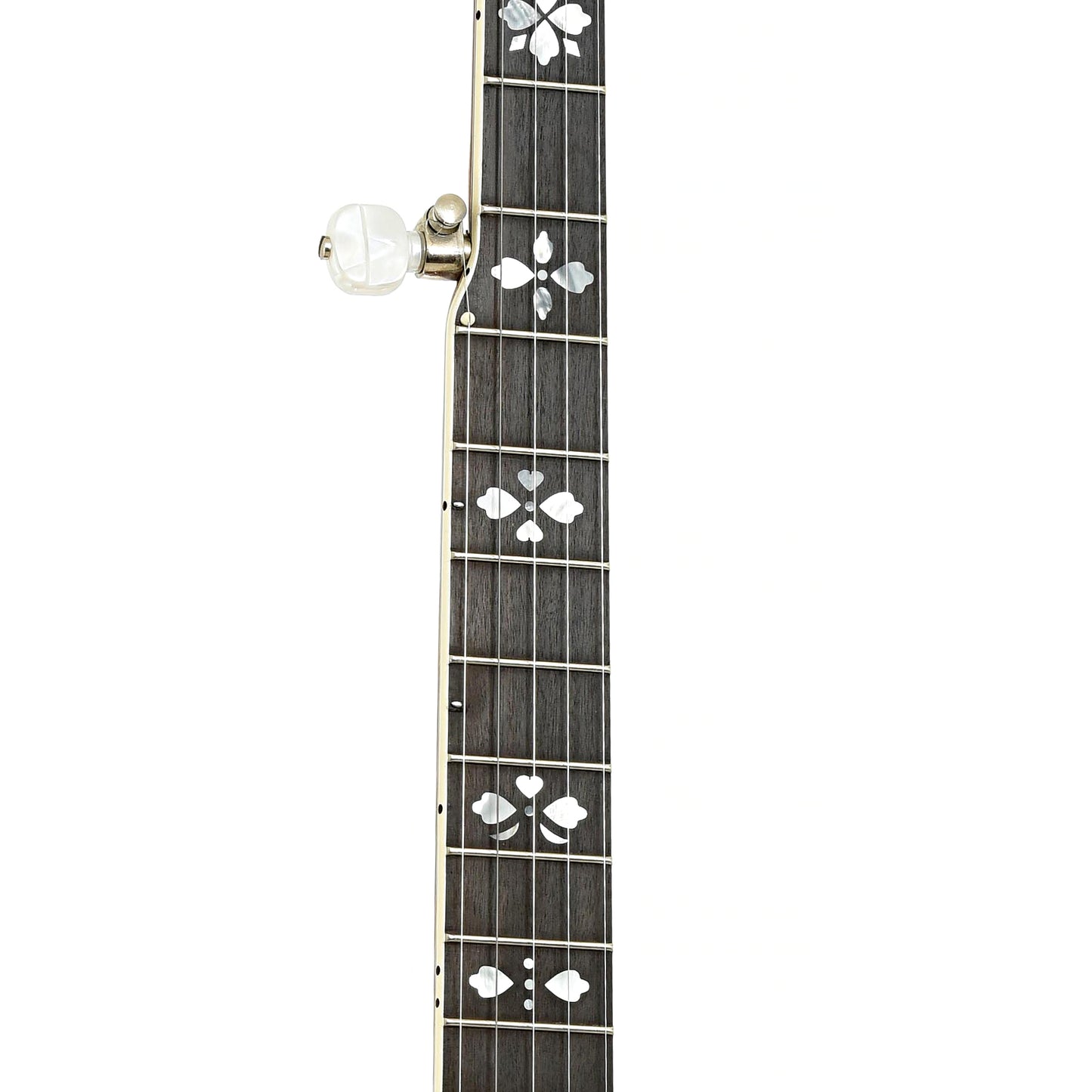 - Peghead overlay features pearl script logo, flowers and curlicues inlays