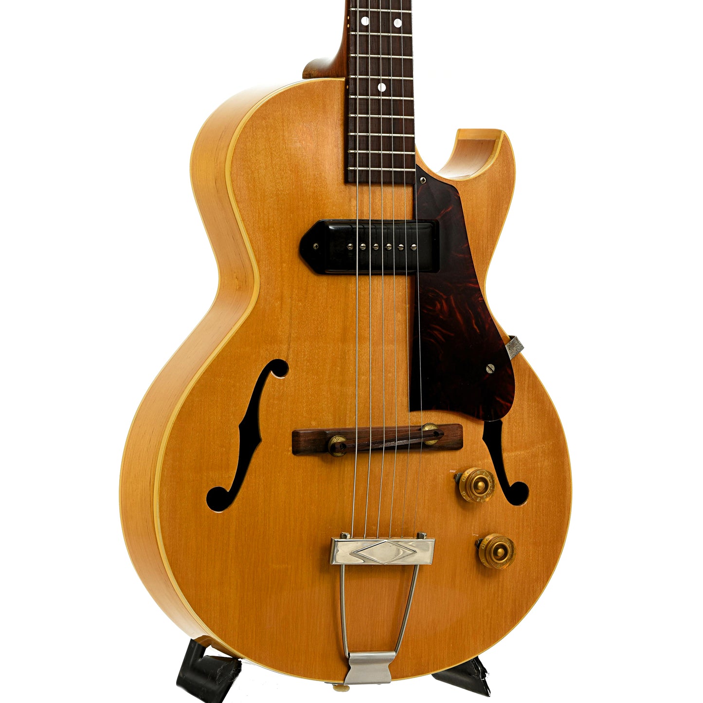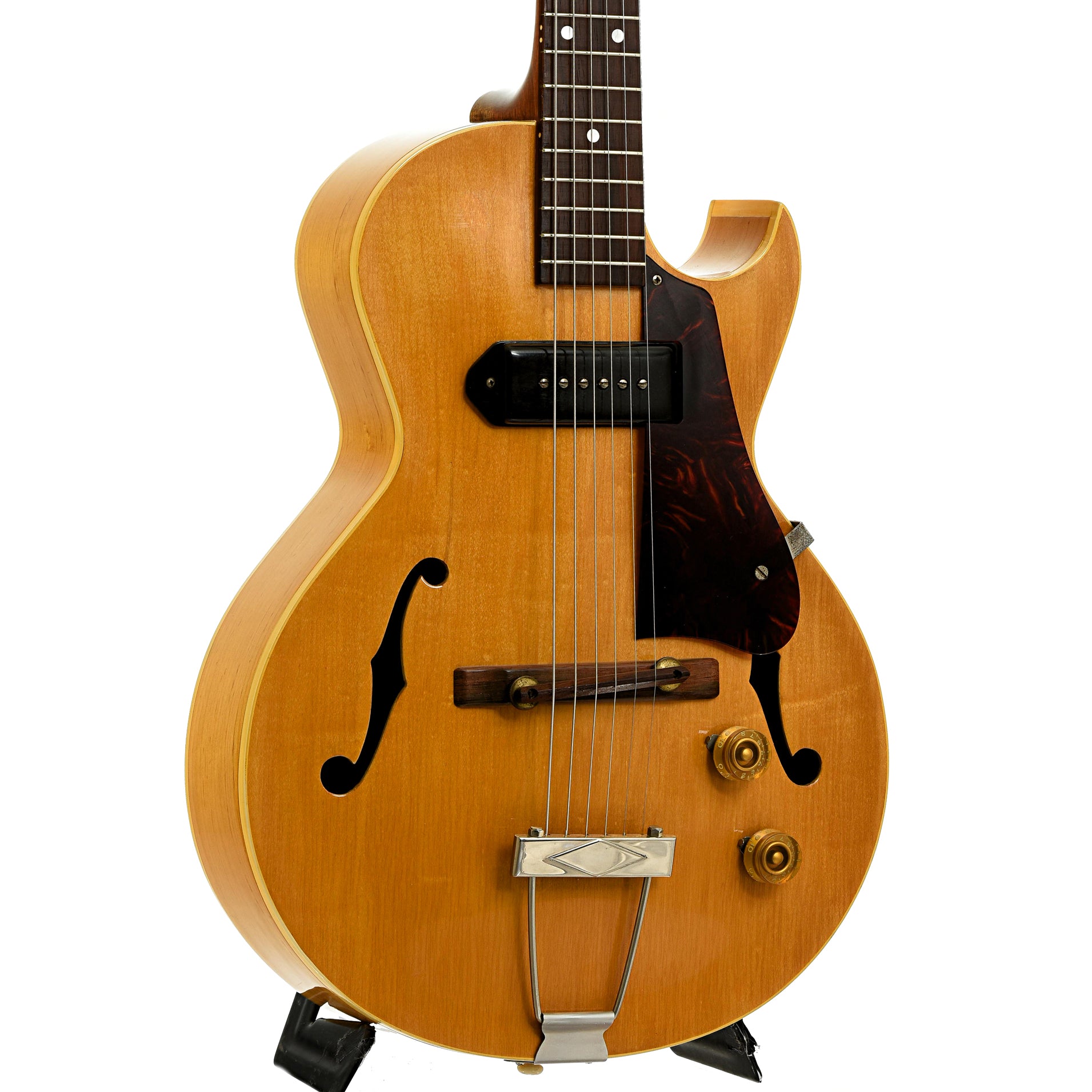 This 1952 Gibson ES-140N 3/4 features a natural finish on its compact maple body with a Florentine cutaway. It has a Brazilian rosewood fingerboard and adjustable bridge, a raised tortoise plastic pickguard, and 3-on-a-plate tuners. Equipped with a P-90 pickup for warm, punchy tones. Stamped "2" on the peghead. Includes a tweed chipboard case. Made in USA. On consignment.