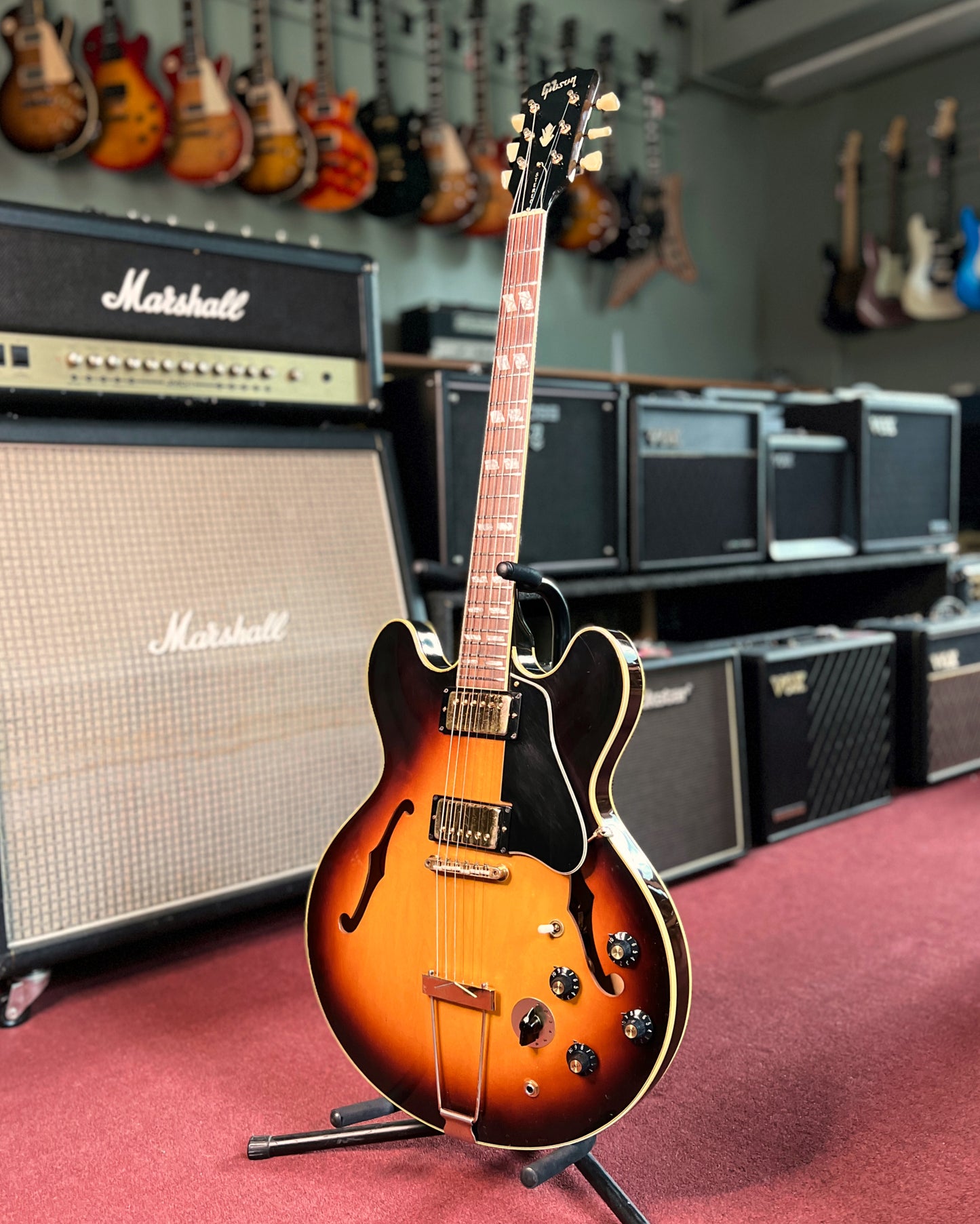 A great 60's blues/rock/jazz machine, this Gibson ES-345TD has an all maple body with a sunburst finish and f-holes. The slim mahogany neck has a Brazilian rosewood fretboard with dual parallelogram inlays. Equipped with two patent number humbucking pickups and a Varitone switch. Outfitted with gold hardware, including a trapeze tailpiece and Kluson tuners with keystone buttons. Stereo Y cord in case. Original hardshell case. Made in USA. On consignment.