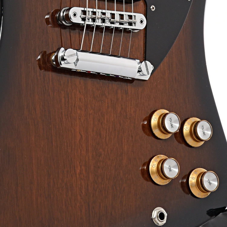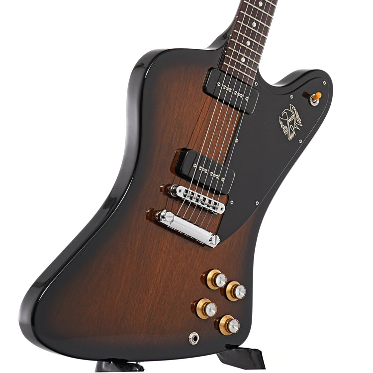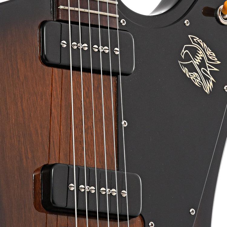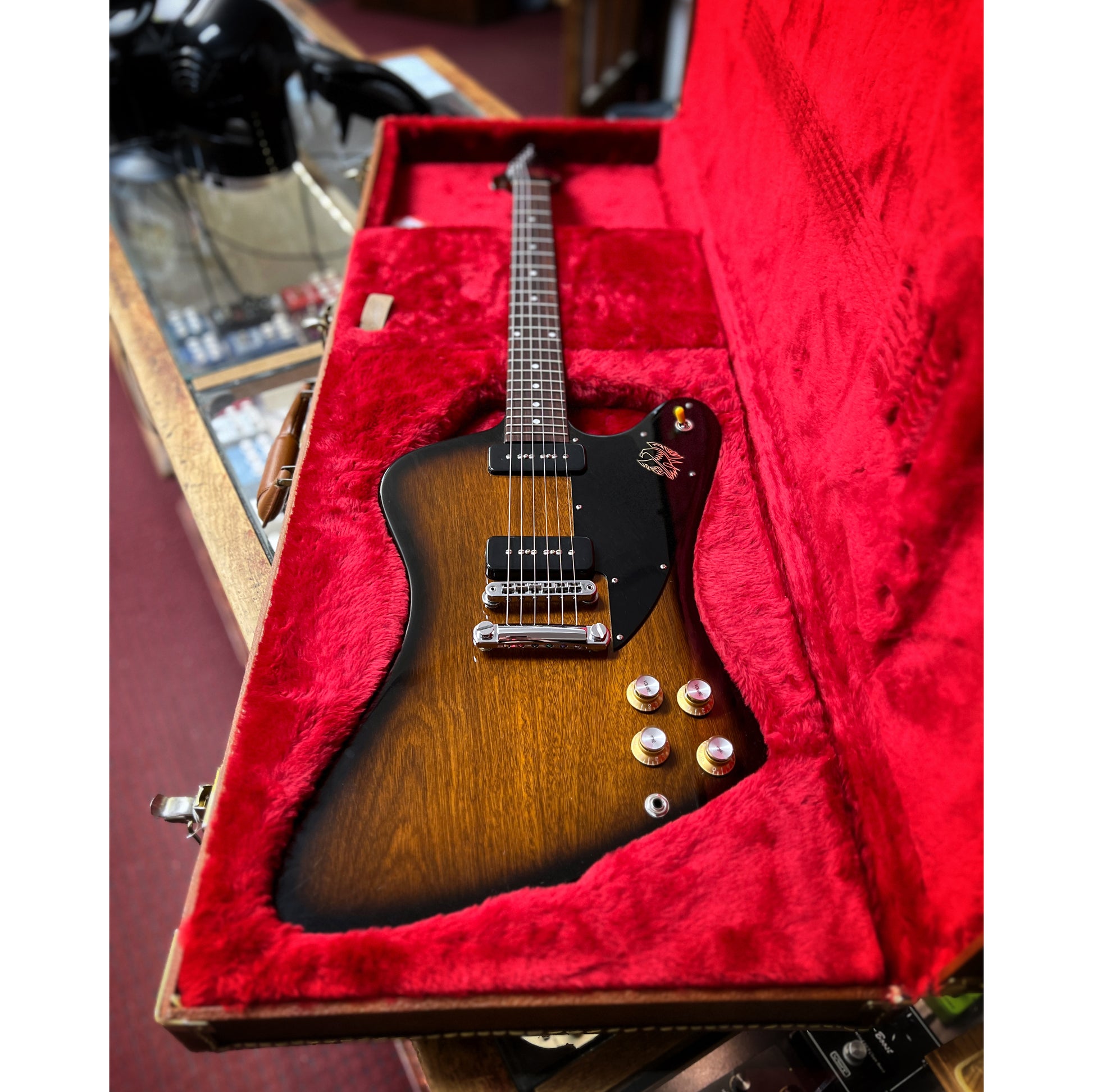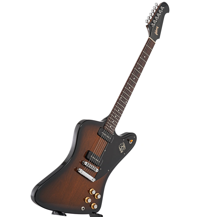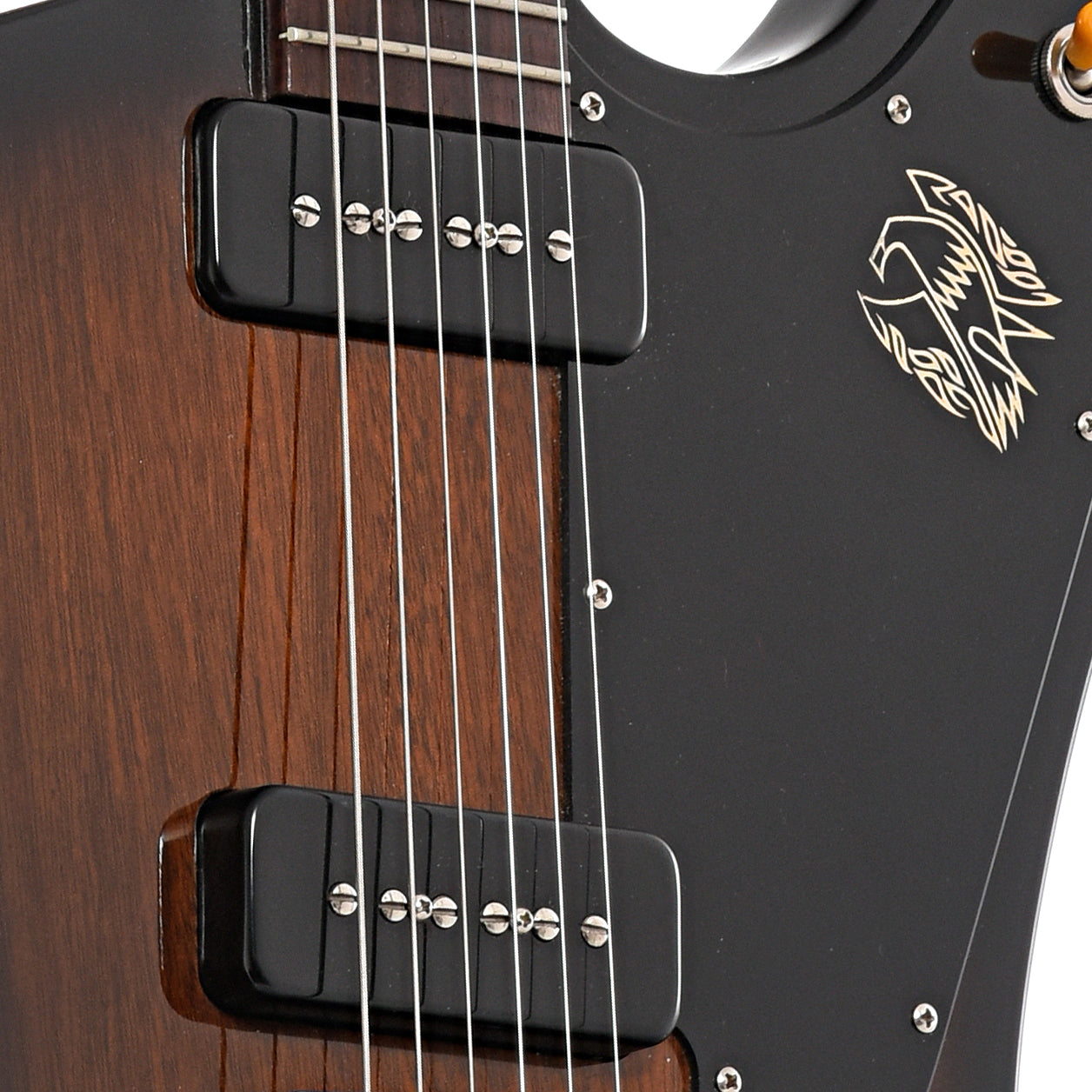 Very cool instrument, sunburst finish, reverse mahogany body, set mahogany neck, non-reverse headstock, rosewood fretboard, dot inlays, 2 P-90 pickups, EC