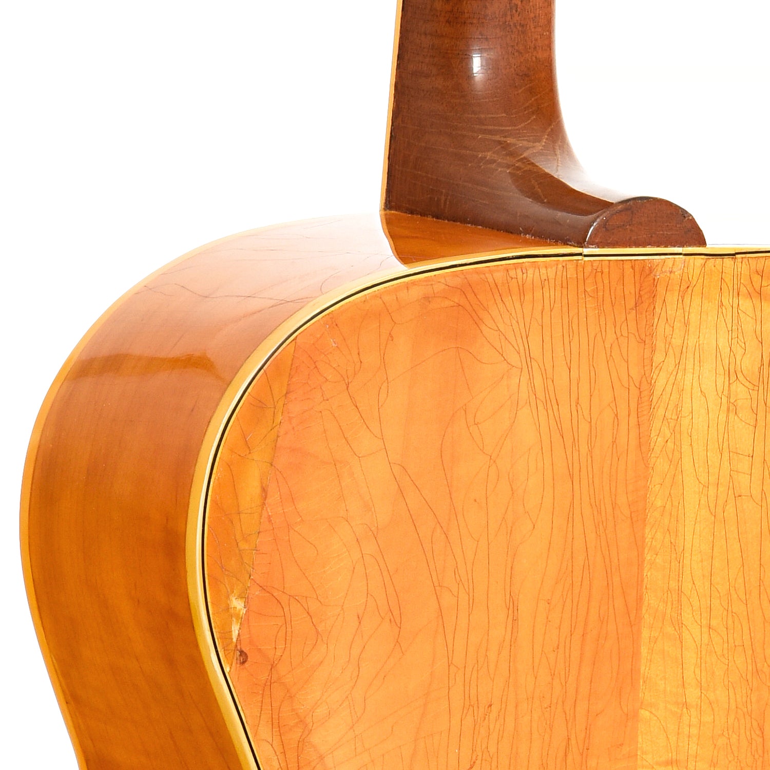Great player's instrument, rare natural finish (several areas of finish touch up), double bound small jumbo body, spruce top, maple sides and back, section of side on treble side upper bout replaced by our shop, 14 fret mahogany neck, lots of work done by our shop, VGC, it's nice, with honest wear! (weather checking, repaired side and back cracks, side repairs)