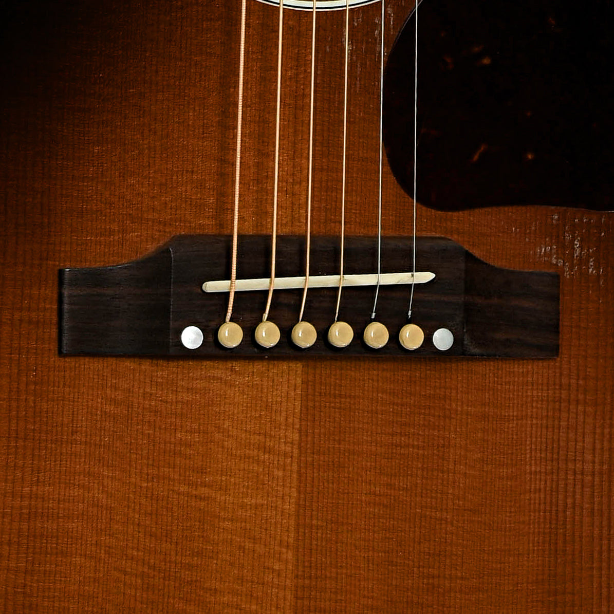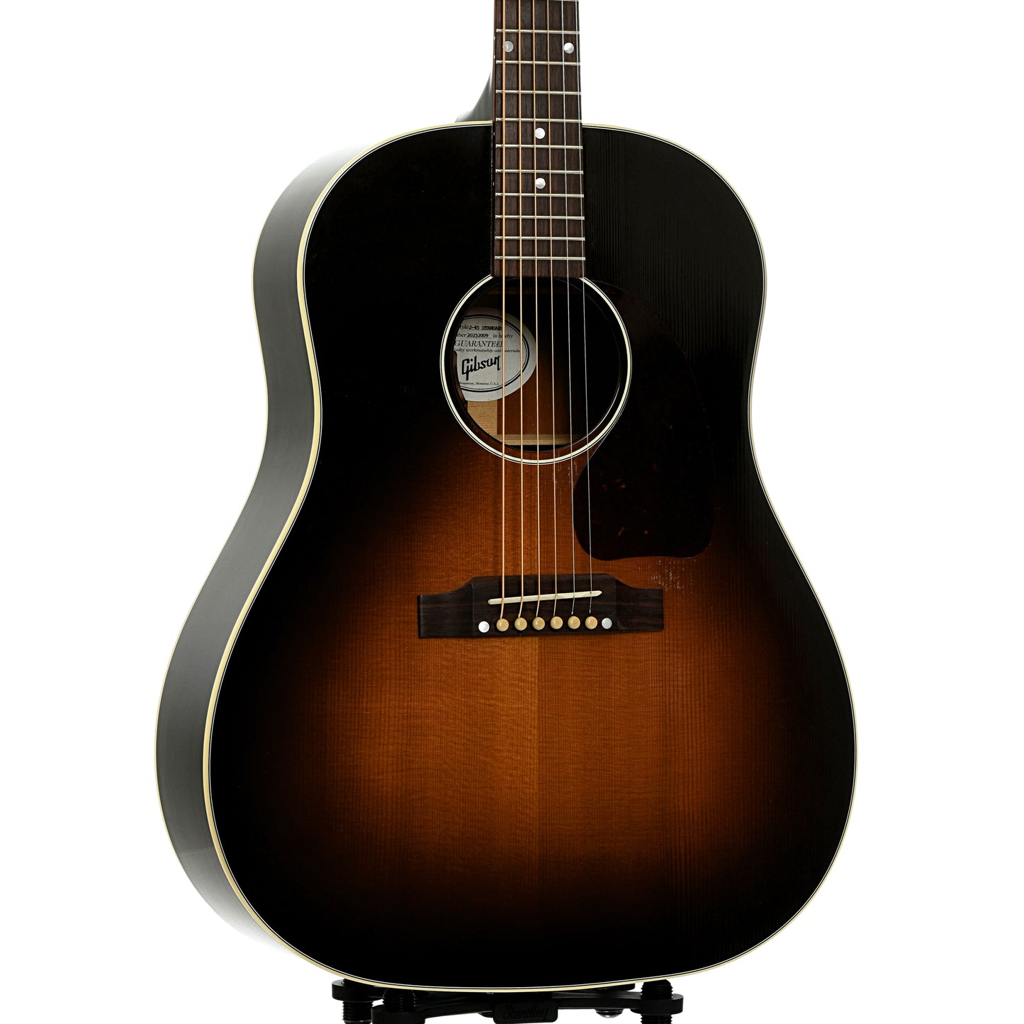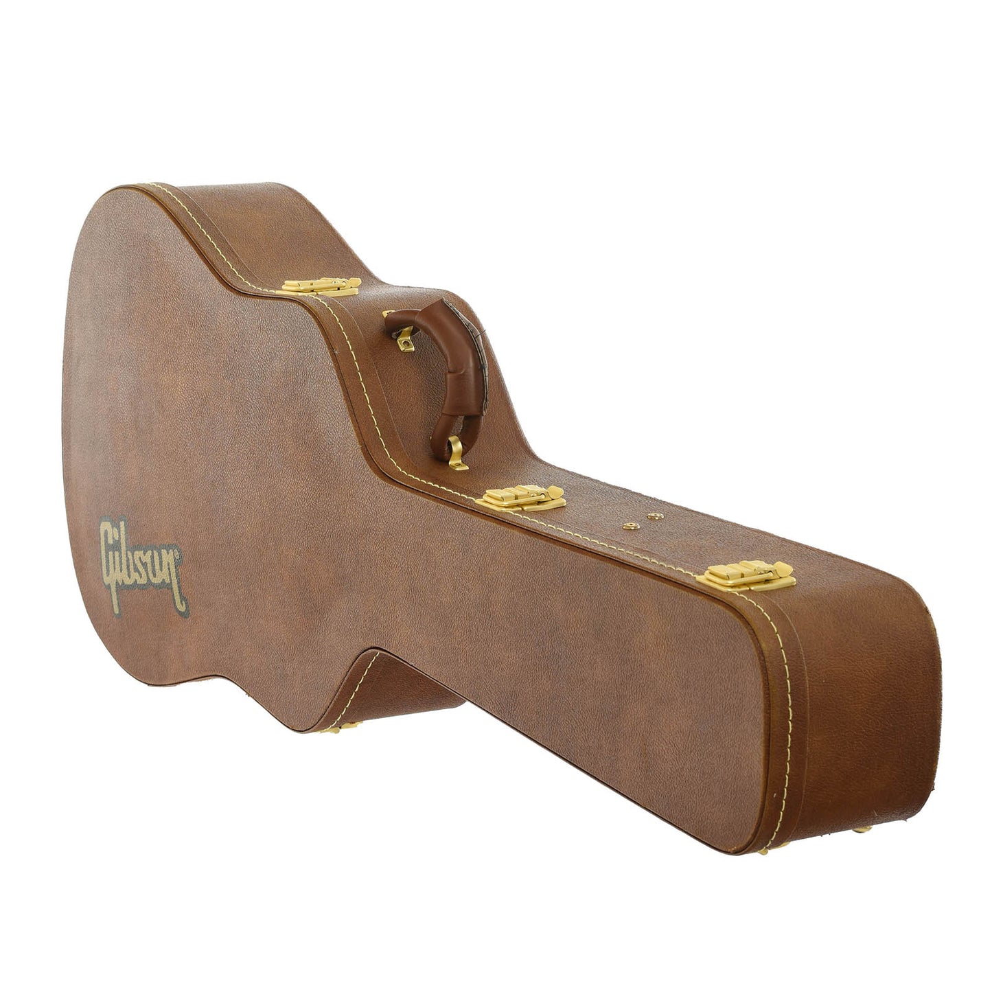 The J-45 is a tried and true workhorse flat-top guitar, with classic features of a vintage sunburst finish on spruce top, a mahogany back, sides and neck, and a rosewood fingerboard. Appointments of pearl dot and logo inlay. Equipped with a factory L.R. Baggs pickup, vintage-style tuners installed. Original brown hard shell case. Built in USA.