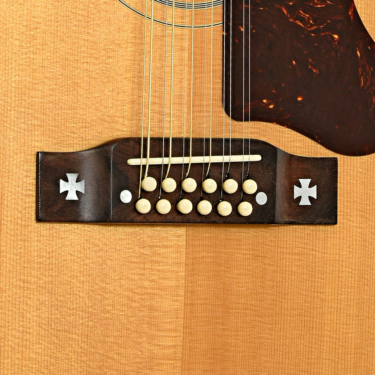 A stunner by Gibson, this J-185 12-string can strum and jangle all day, with its jumbo body of an X-braced spruce top and figured maple back and sides. It has a bound rosewood fingerboard, a big rosewood bridge, appointments of split parallelogram and cross pearl inlays. Equipped with Grover Mini Rotomatic tuners. Original hard shell case. Made in USA. On consignment.