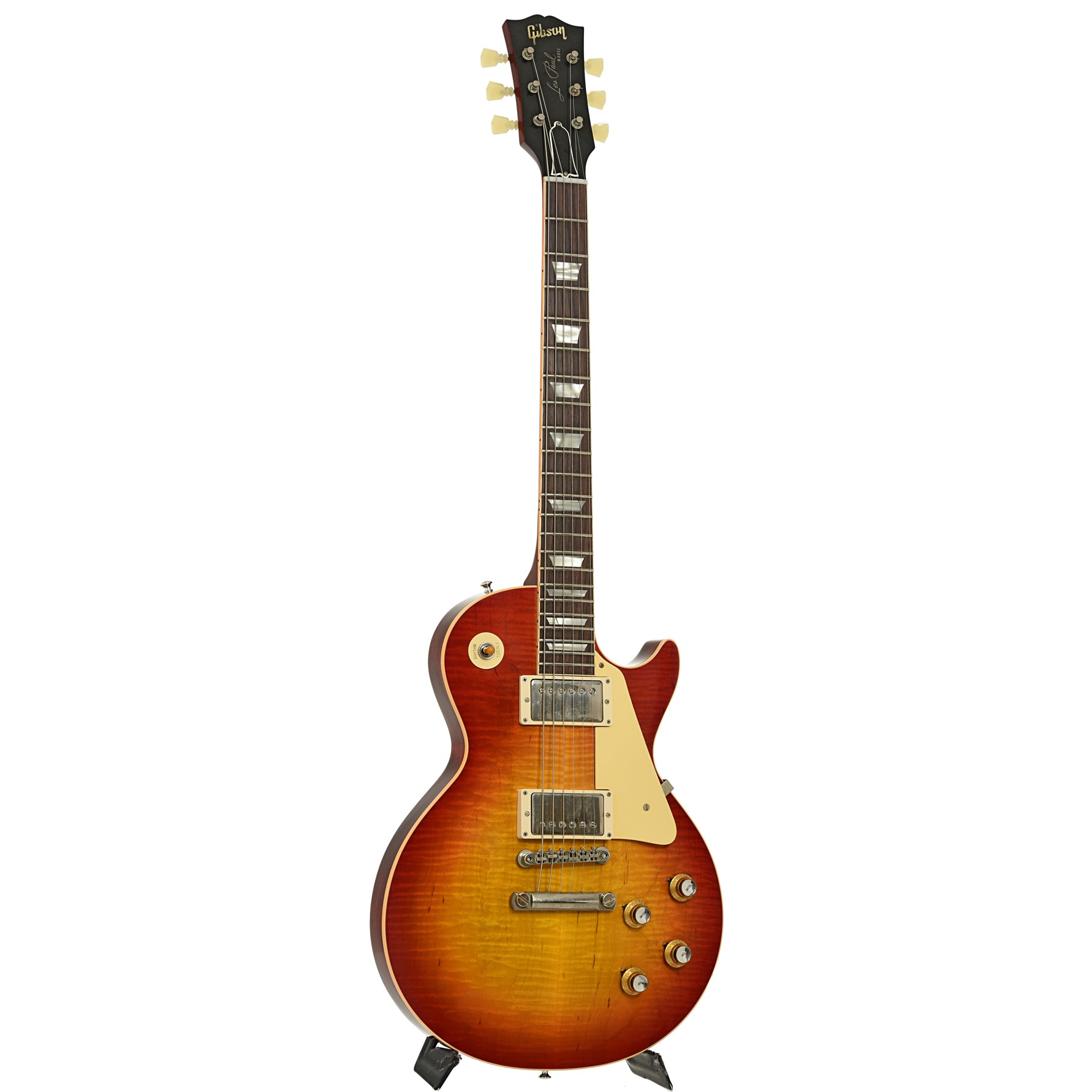 This R-0 '60 Les Paul Standard reissue features a drop-dead gorgeous cherry sunburst finish on a 2-piece flame maple top. It has a mahogany body and set neck, a bound rosewood fingerboard with trapezoid inlays. Equipped with dual PAF decal humbucking pickups, a no-wire ABR-1 TOM bridge and vintage-style tuners. Certificate of Authenticity included. Original brown hard shell case. Made in USA.
