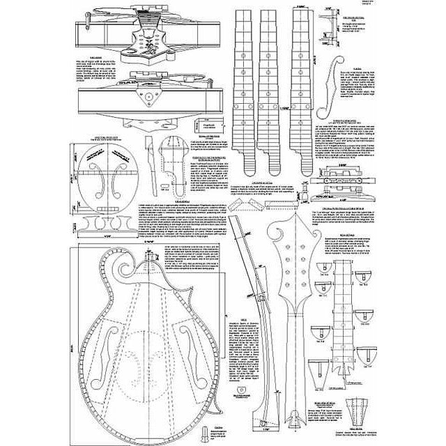 Set of four blueprints. Version 4 contains some major updates: all dimensions are now in both inches and millimeters, completely revised tuners, revised bridge base shape, very slight revisions on arching views, more details in inner construction view, and some small corrections in text and line styles to make them easier to read. Based on a Gibson F-5 mandolin signed by Lloyd Loar in 1923, these full-size, impressively detailed computer generated plans show the instrument from nearly every conceivable angle including front, side, headstock, tailpiece, an inside view showing placement of tonebars, a dramatic view looking down the instrument from headstock to bottom, plus soundboard thicknesses, fret to nut distances, table of materials, and many more annotated drawings. These are accurate full scale, printed for Adrian using an offset technique on offset paper (100g/m2). All lines are smooth and clean, the original arching is shown in a graduation map that reveals typical imperfections, hidden aspects of construction are shown, many of which were previously undocumented or unknown, and Bill Halsey helped put the texts into technical English with clear wording. Shipped rolled in a heavy tube. Suitable for framing. Each plan consists of 4 sheets measuring approximately 23" x 33". //ELDEX//