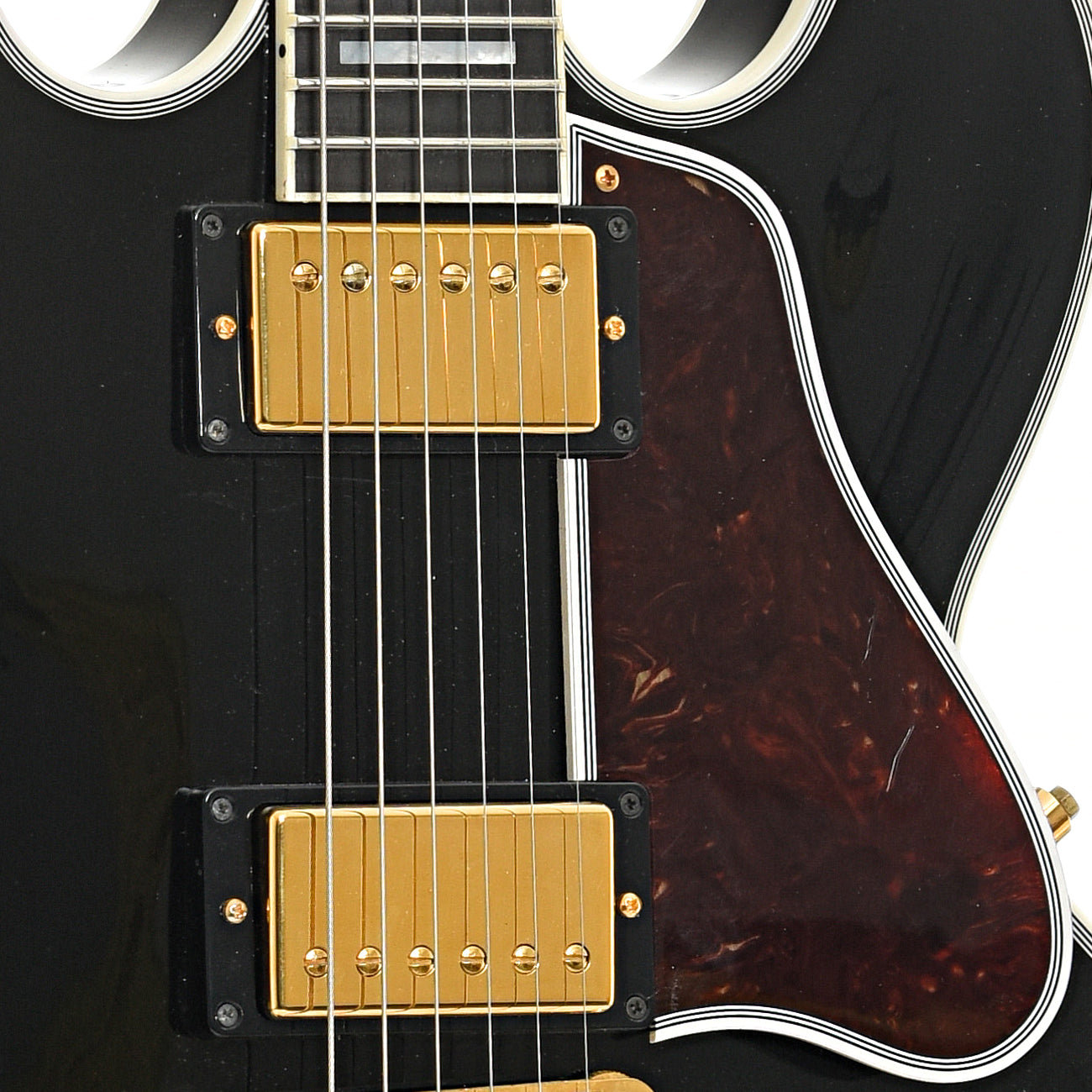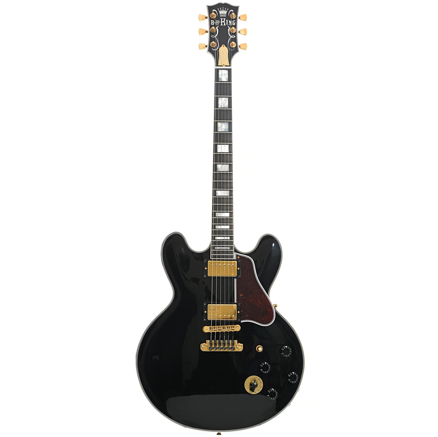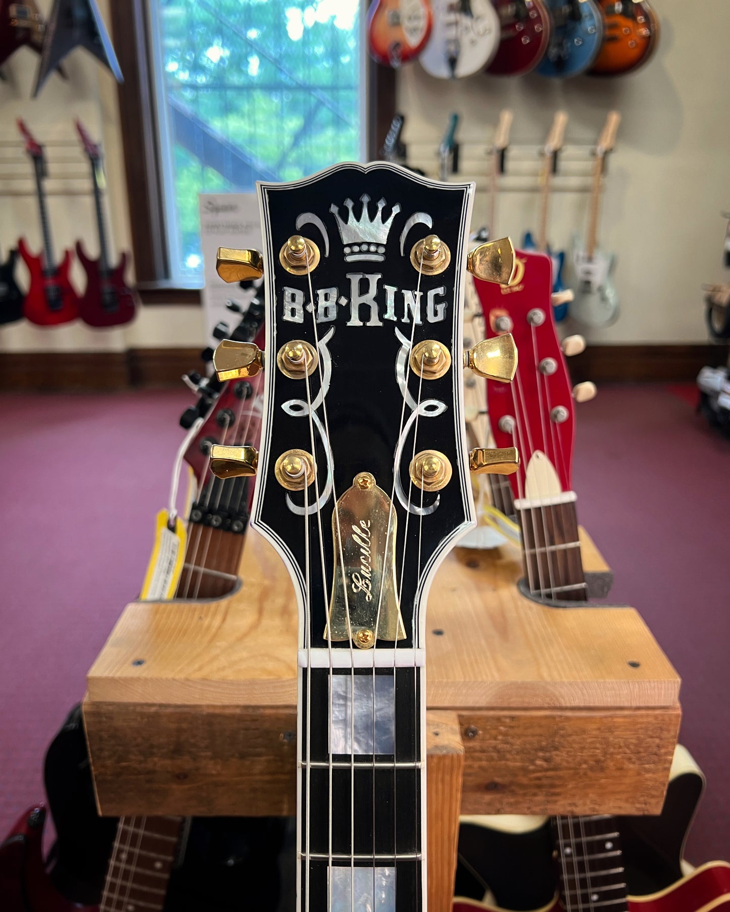 Inspired by B.B. King’s legendary guitars, this Gibson Lucille features a sleek black finish on a double-bound maple body with no f-holes. The bound ebony fingerboard showcases block inlays, adding a touch of elegance. It’s equipped with two humbucking pickups and a Varitone switch. Gold hardware, including a TP6 tailpiece and Grover tuners, completes the look. Includes the original hard shell case. Made in USA. On consignment.