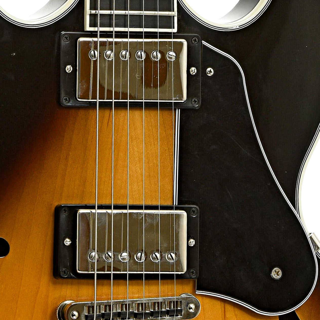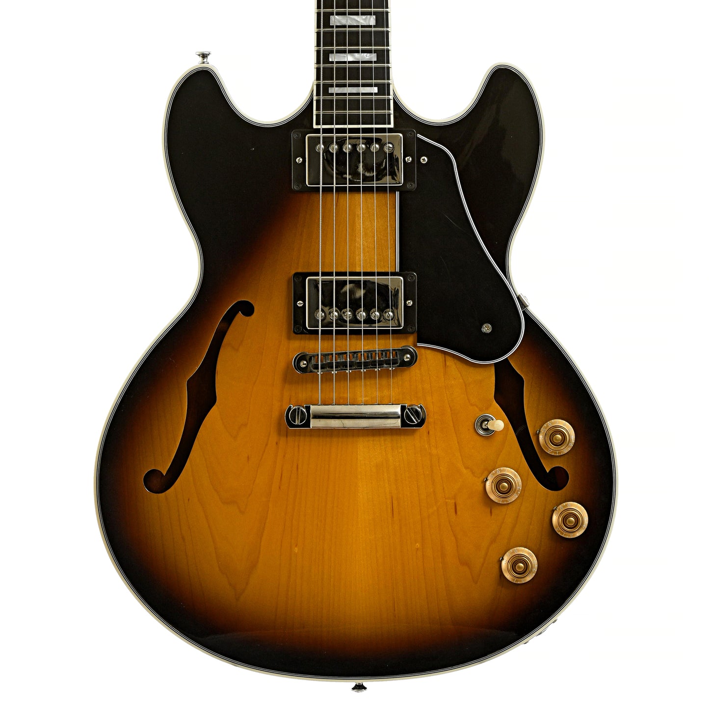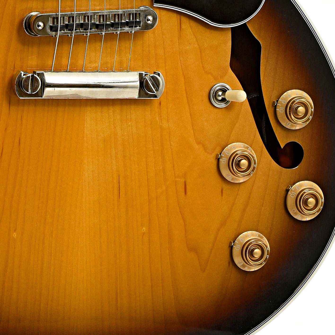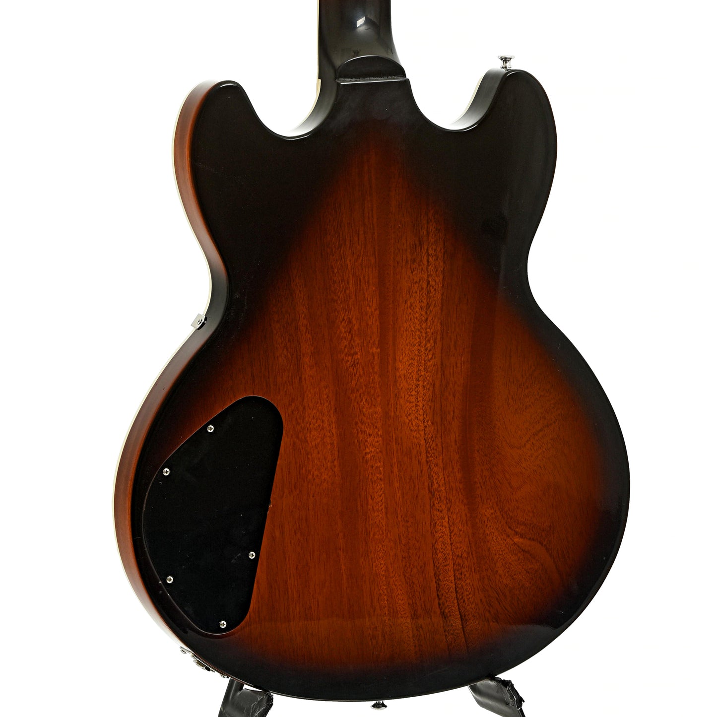 This thinline semi-hollowbody Gibson stands out with a sunburst finish and a flat, bound maple top on a chambered mahogany body. It features a Richlite fingerboard with block inlays, dual '57 Classic humbuckers, and Grover locking tuners. Includes the original hard shell case. Made in the USA.