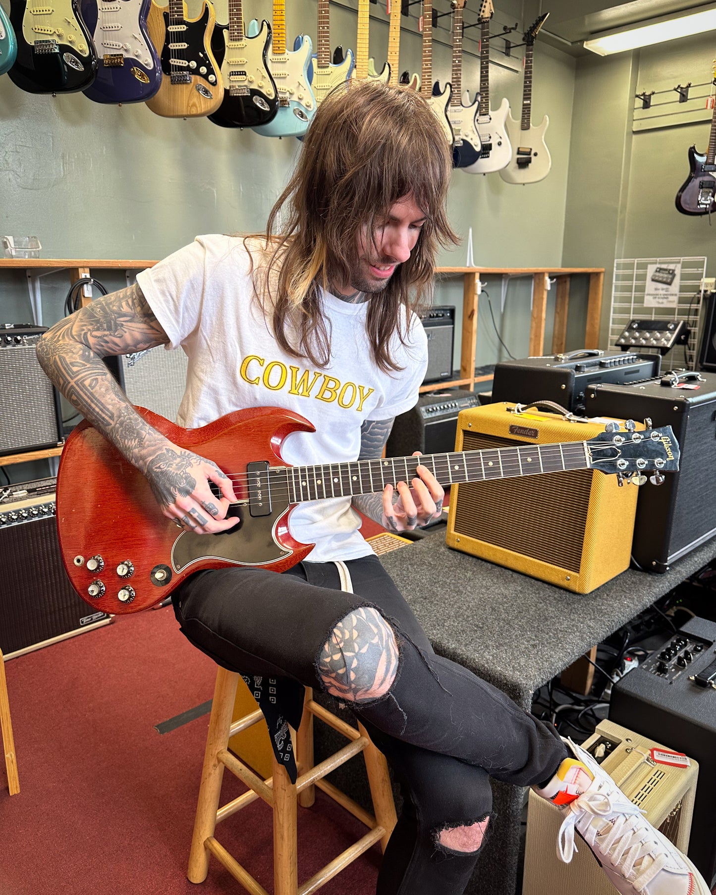 This 1961 Gibson SG Special is a killer example of early SG craftsmanship. The iconic cherry finish graces its mahogany body and neck, paired with a bound Brazilian rosewood fretboard with dot inlays. Two roaring P-90 pickups provide that signature bite, with pots dating to late 1960. A TonePros adjustable wrap-over bridge and Grover tuners have been installed. Includes a newer Gibson hard case. On consignment.