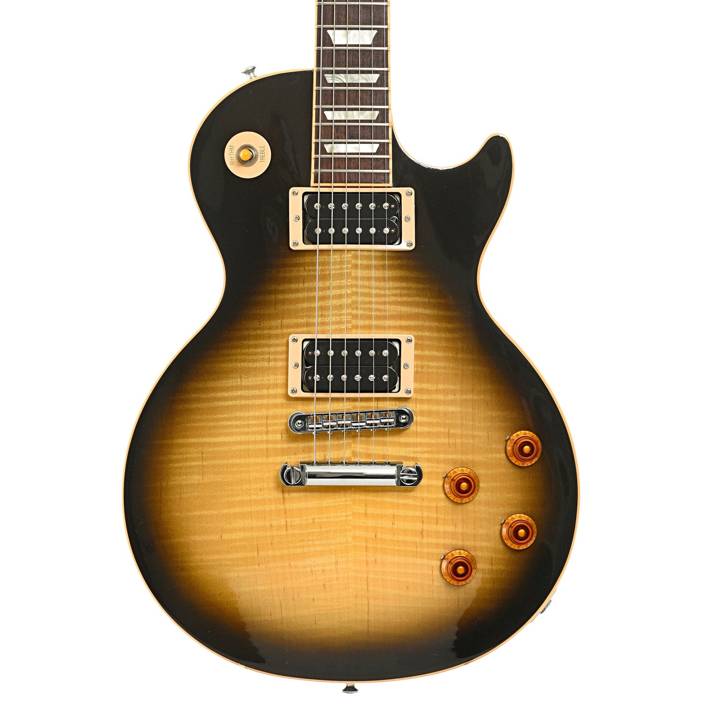 This 2008 Gibson Slash Les Paul Standard is a standout limited edition model built for rockers. It features a tobacco burst finish over a figured maple top, paired with a mahogany body and set neck. Equipped with dual Seymour Duncan Alnico II humbucking pickups and a Nashville T-O-M bridge. Includes the original hard shell case. Made in USA. On consignment.