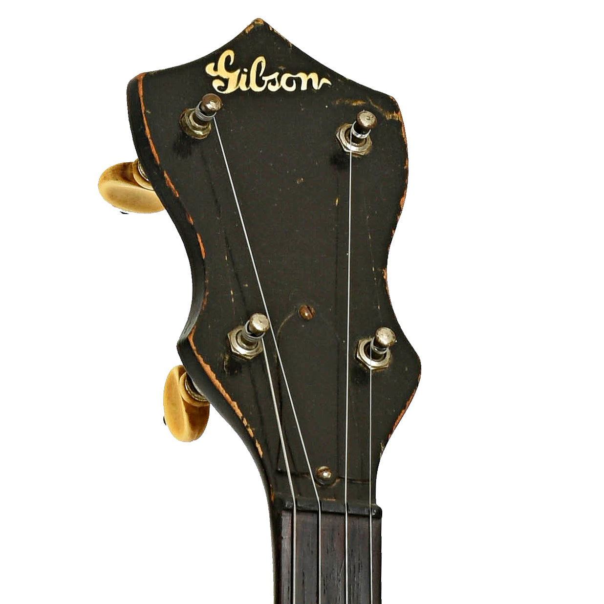 - Black pointy peghead with white silkscreened script "Gibson" logo