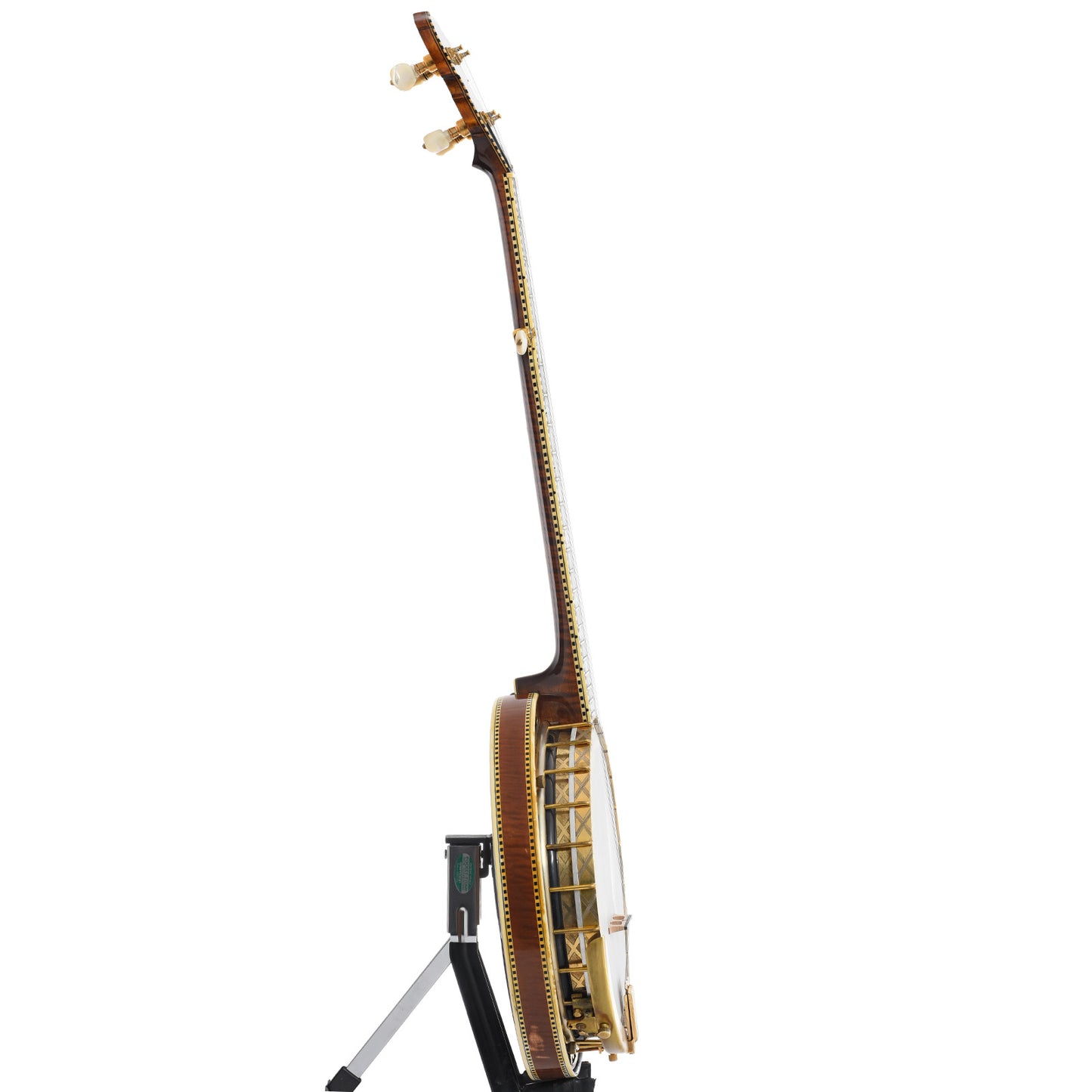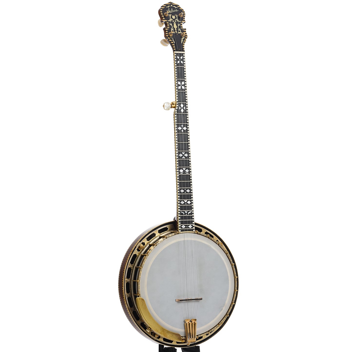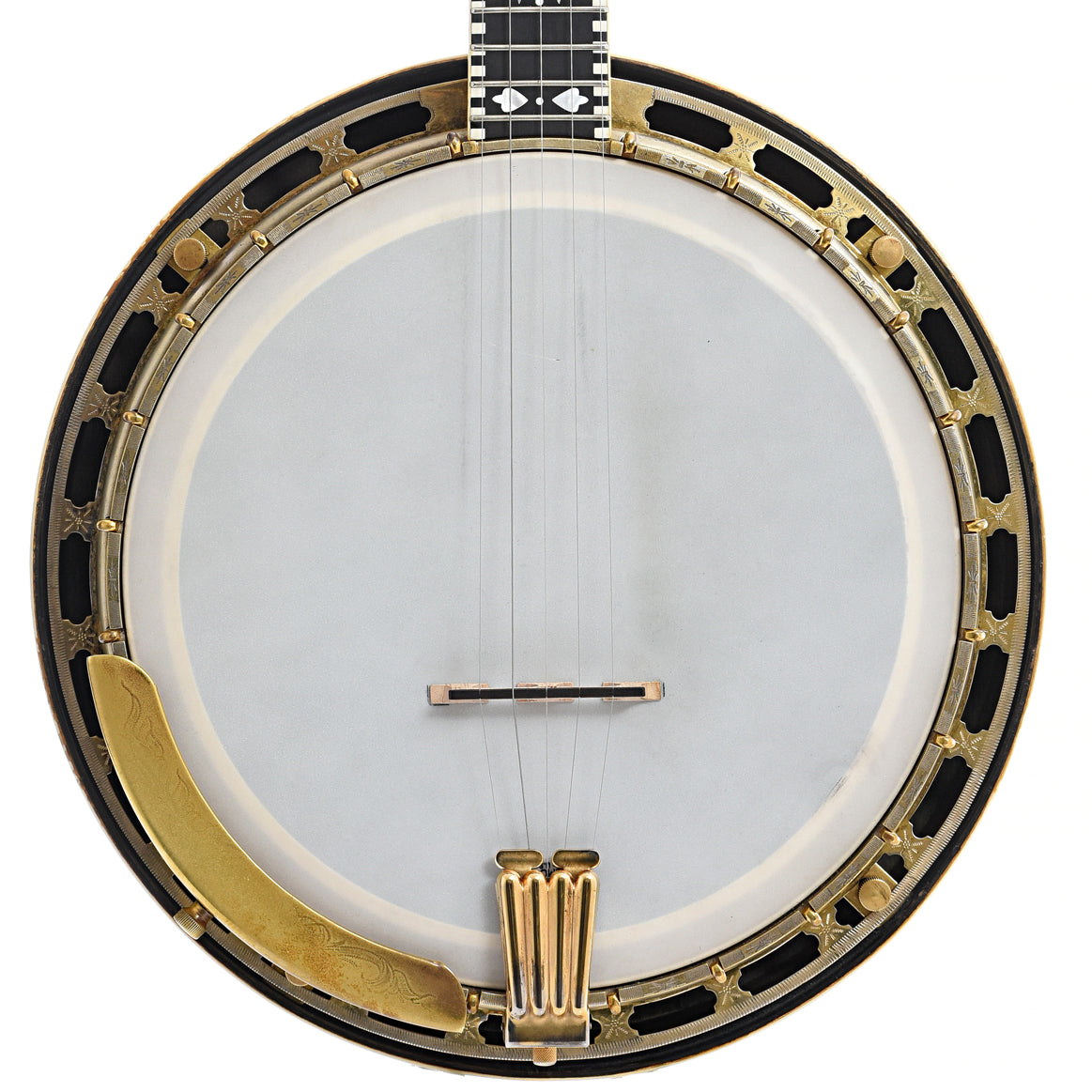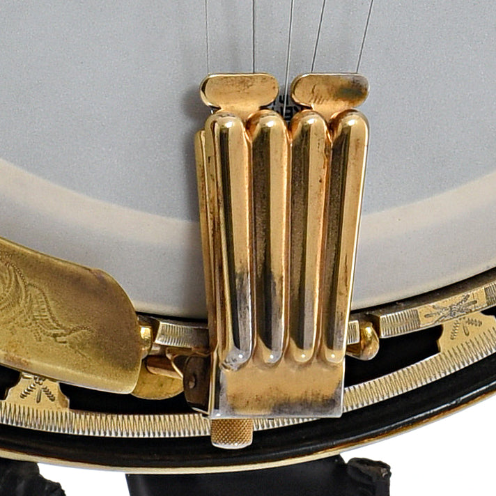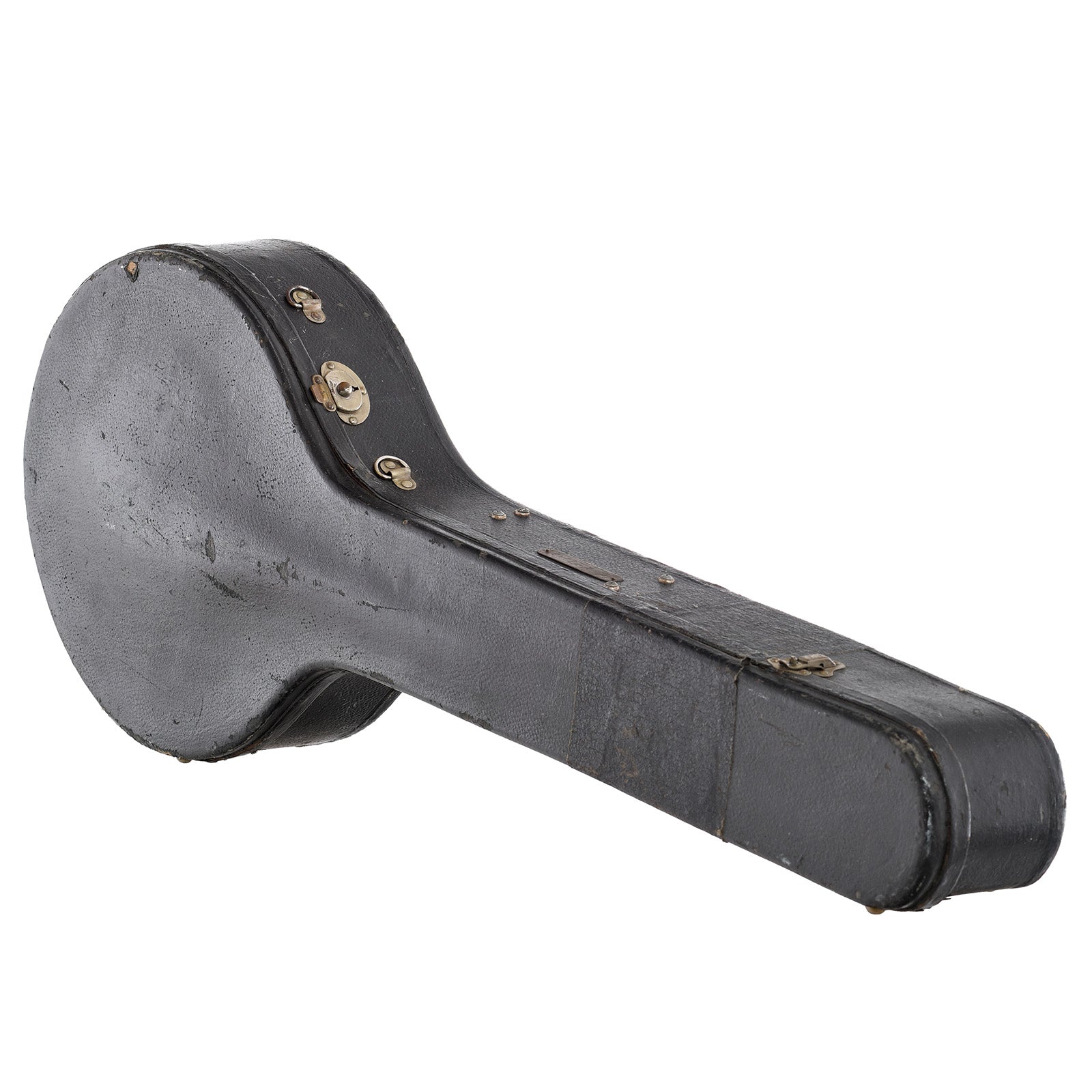 A remarkable example of Gibson’s high-end banjo craftsmanship, this 1928 TB-6 has been expertly converted to a five-string banjo with a conversion neck by Jim Yarboro (c.1980), later reshaped and refined by Chris Cioffi in 2010. It retains its original 40-hole archtop tone ring, gold-plated and engraved hardware, and the distinctive checkerboard purfling found on the headstock, neck, fingerboard, and resonator. The original tenor neck is included. Includes a modified original tenor hard shell case. On consignment.