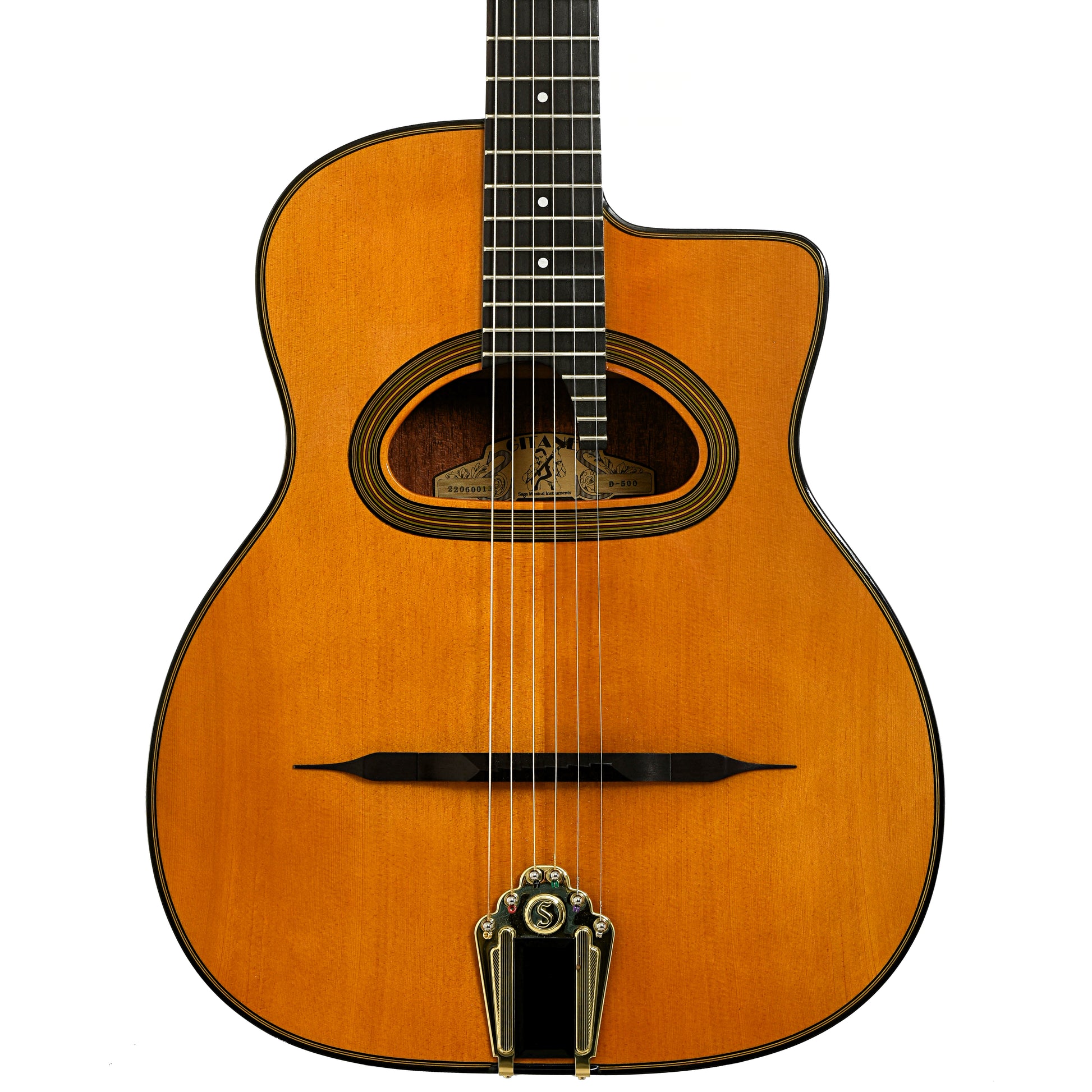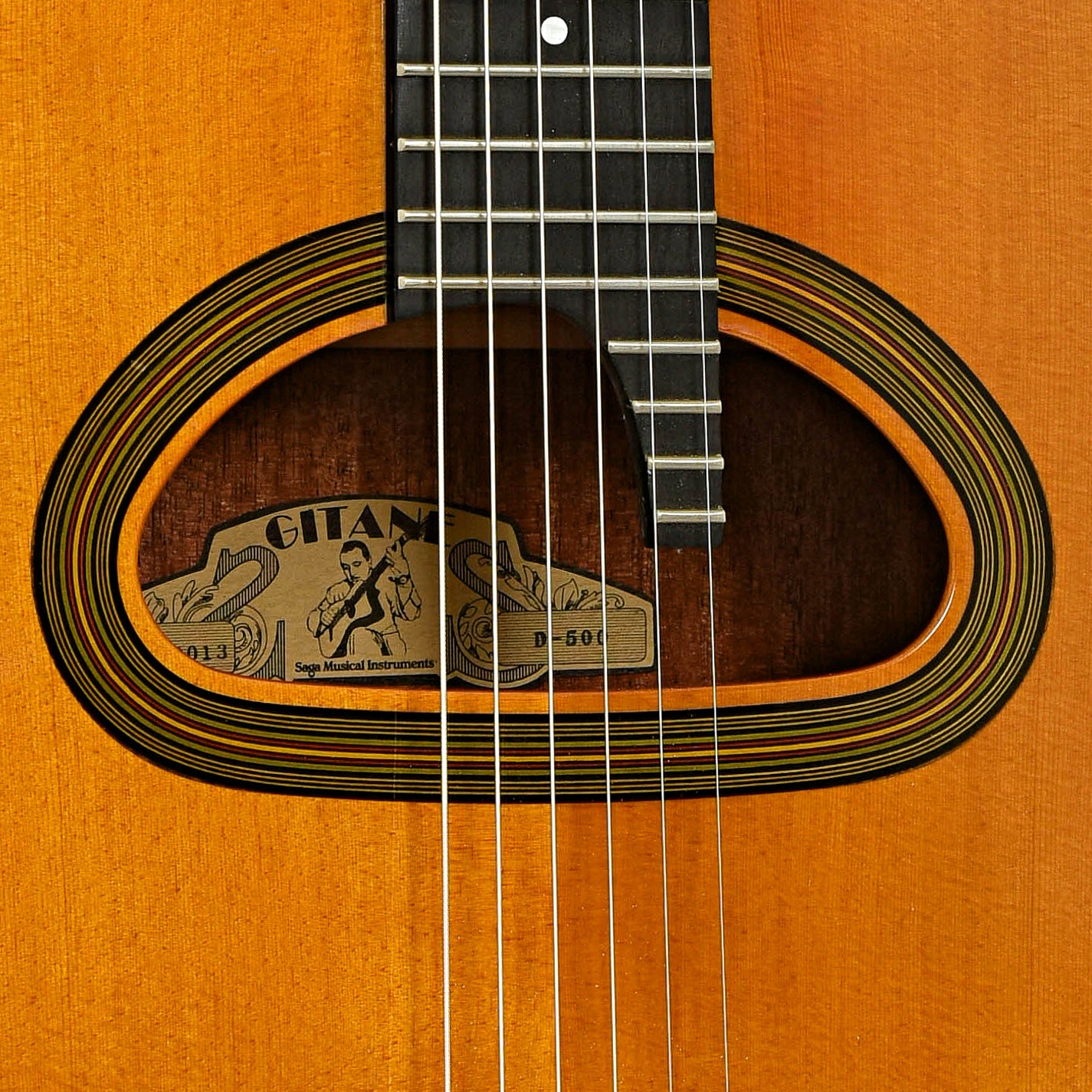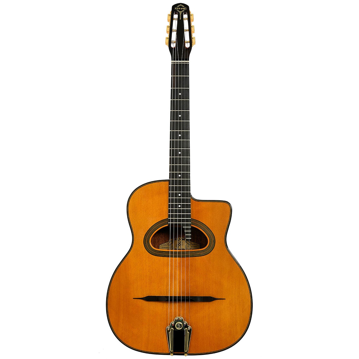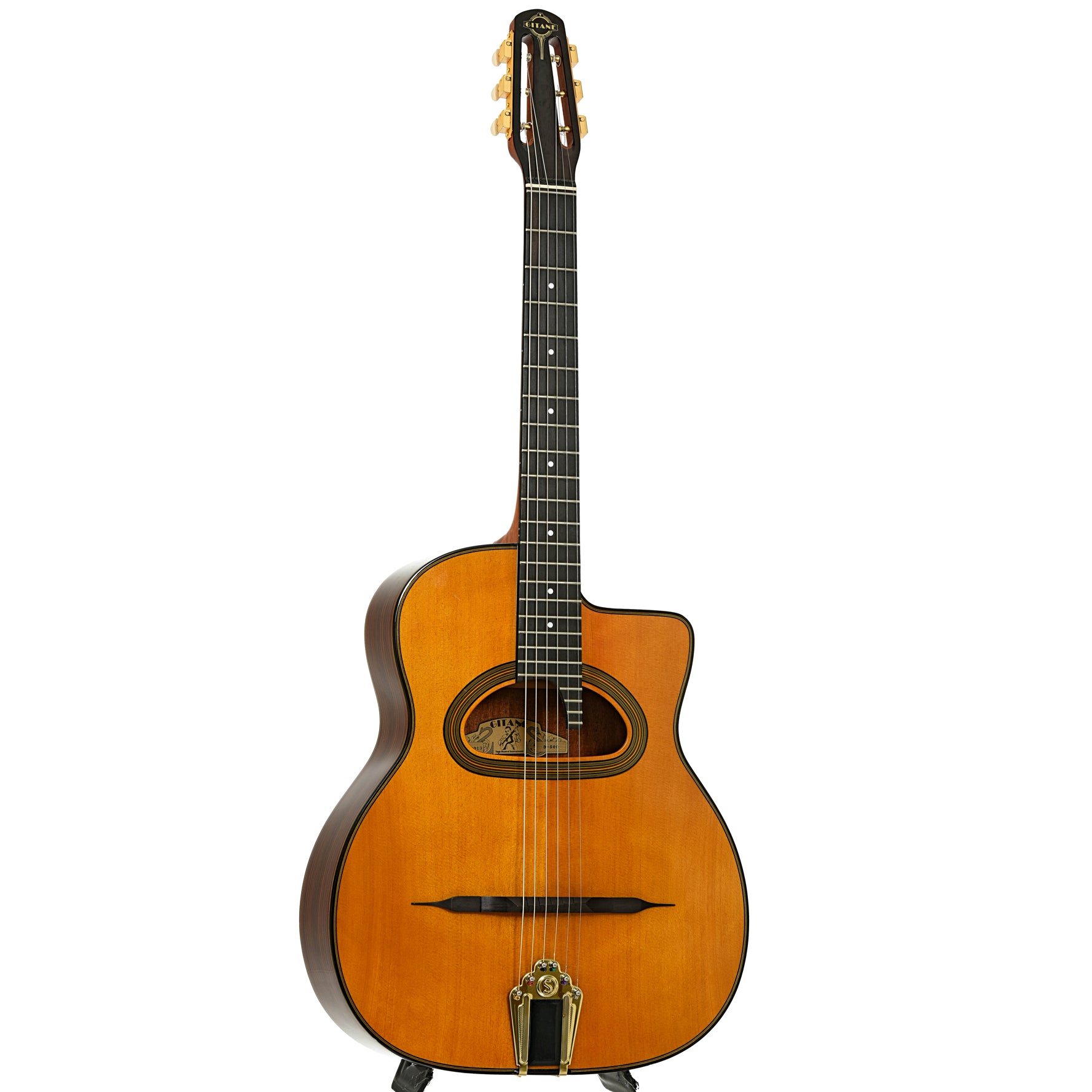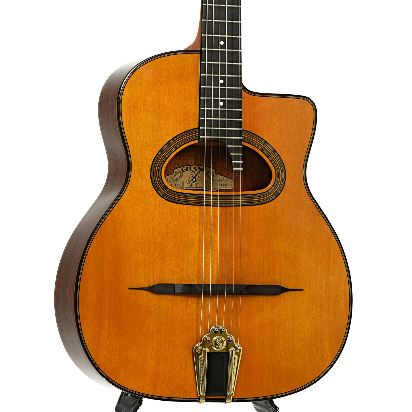 For the Django Reinhardt enthusiast, this Gitane D-500 gets that Hot Club guitar tone. The distinctive body features include solid spruce top, rosewood back and sides, traditional large D-shaped "grande bouche" soundhole, ebony compensated mustache bridge, 24 fret radiused ebony fingerboard with treble extension, traditional brass tailpiece. Hard shell case. Made in Asia.