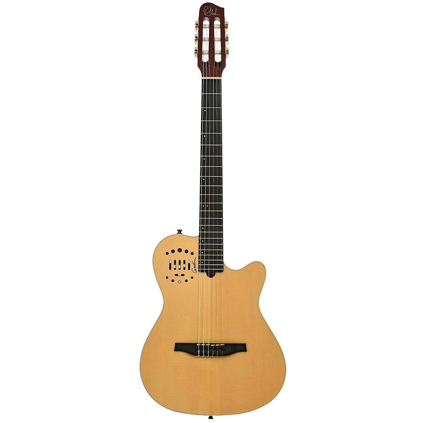 The Multiac is the flagship of the Godin line, and this Deluxe Nylon model features a spruce top on chambered mahogany body with a Venetian cutaway, and a Richlite fingerboard and bridge. Equipped with individual HEX pickup saddles, Lyric microphone, LR Baggs electronics and EQ controls. Gigbag. Made in Canada.