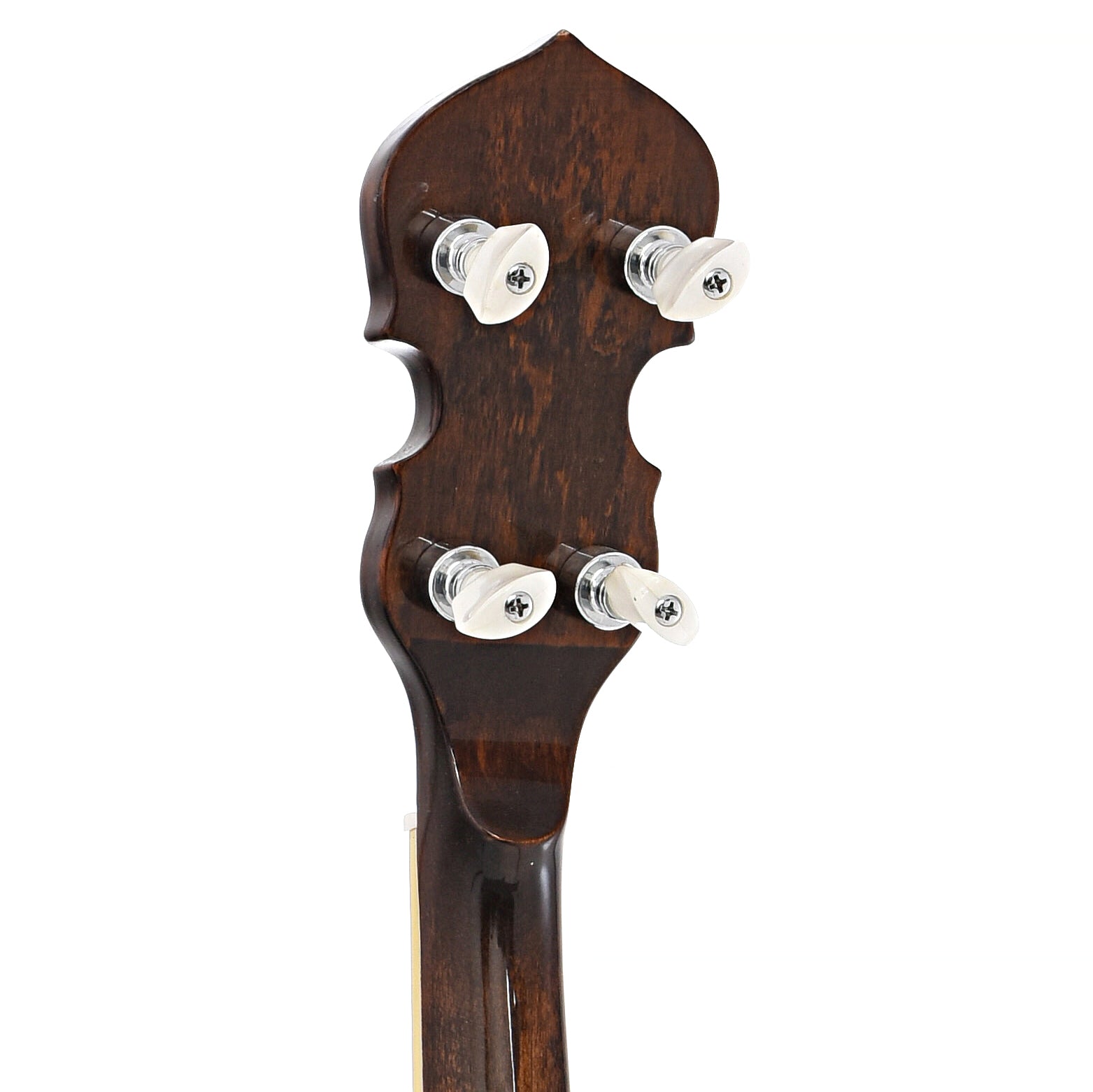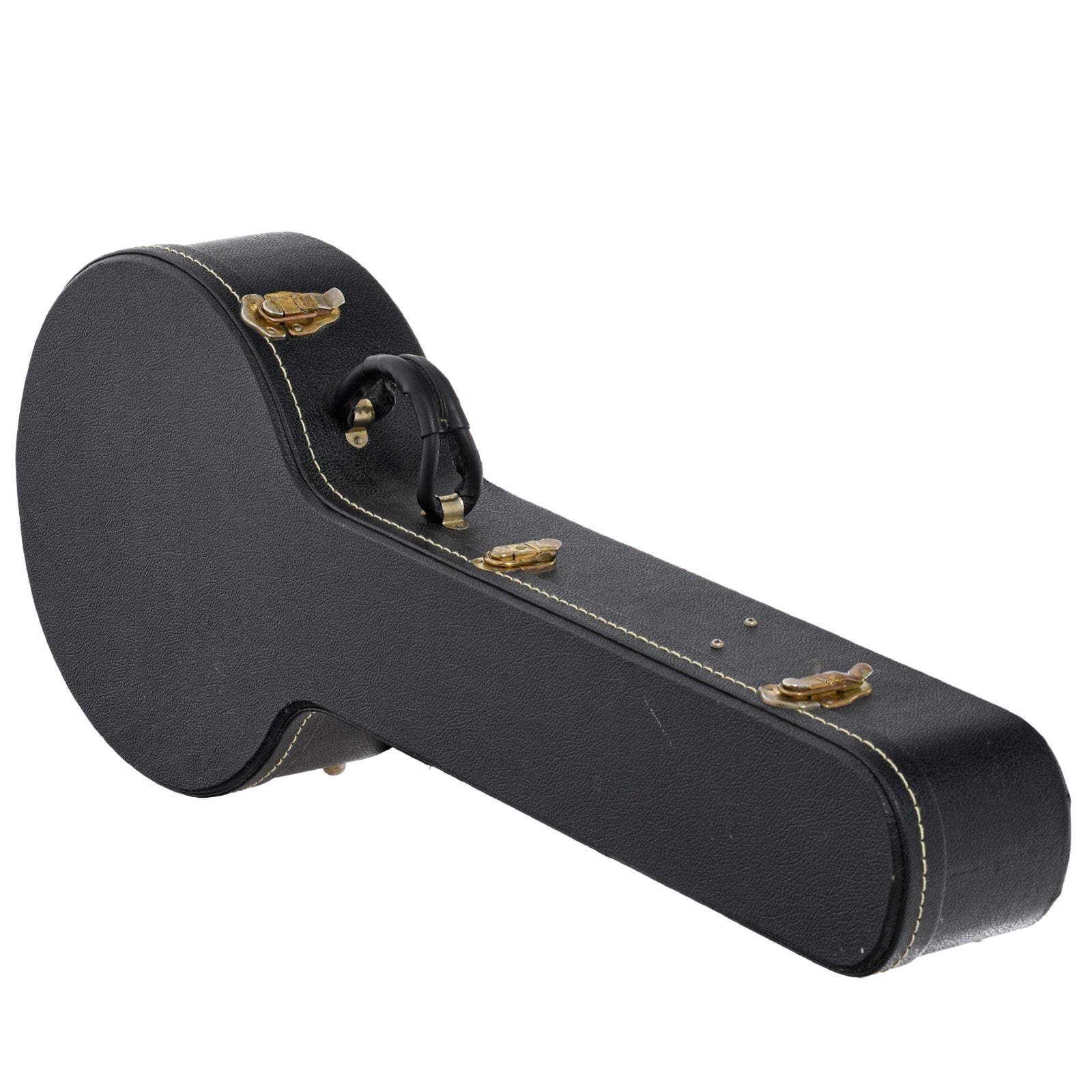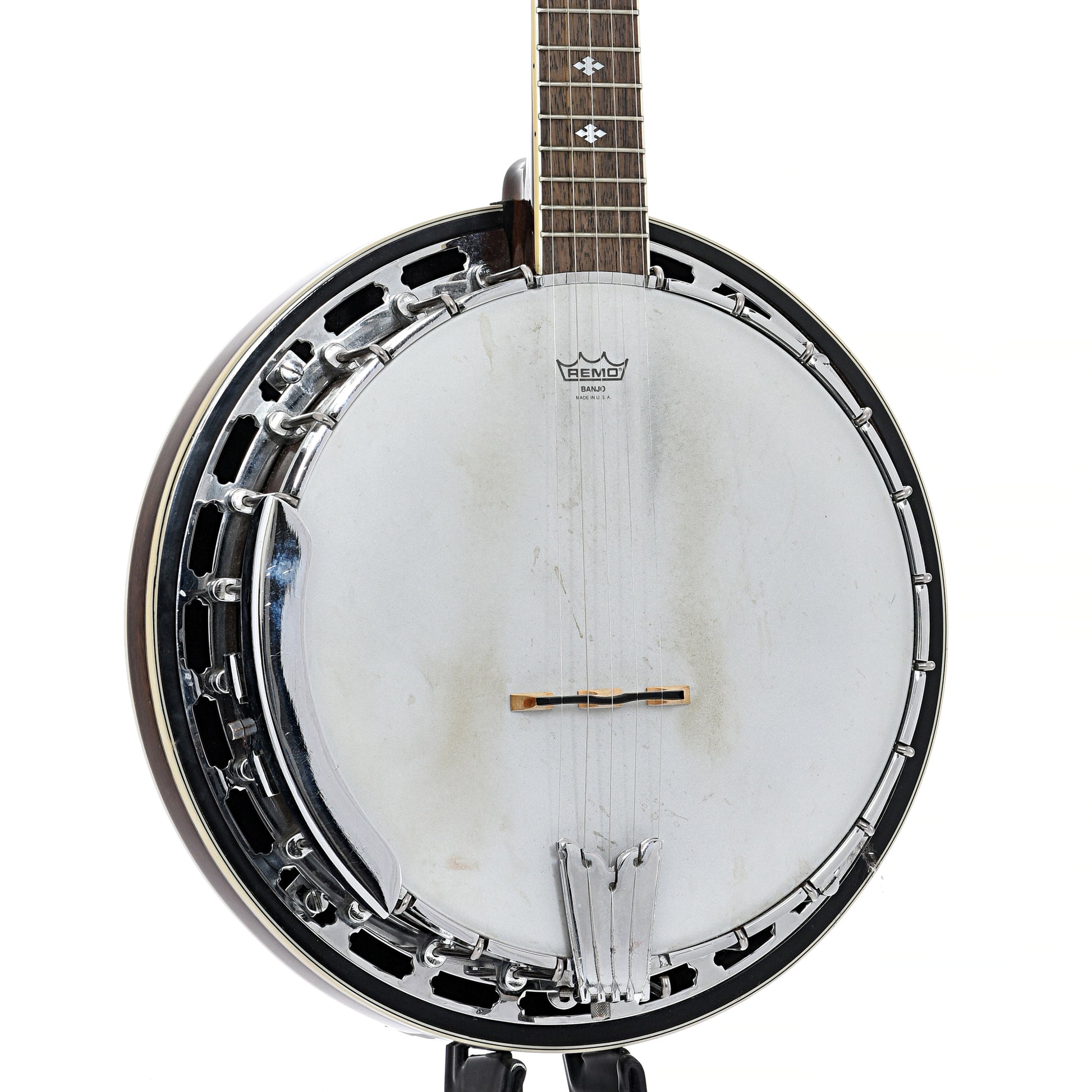 This Gold Tone banjo has a mahogany neck and resonator in a dark brown sunburst finish. The 5/8” thick maple rim is equipped with a flathead tone ring. Other features are slotted diamond fingerboard inlays, and geared tuners with pearloid buttons. (needs tailpiece, fret level, remount armrest, cleaning, plays okay - sold AS-IS)