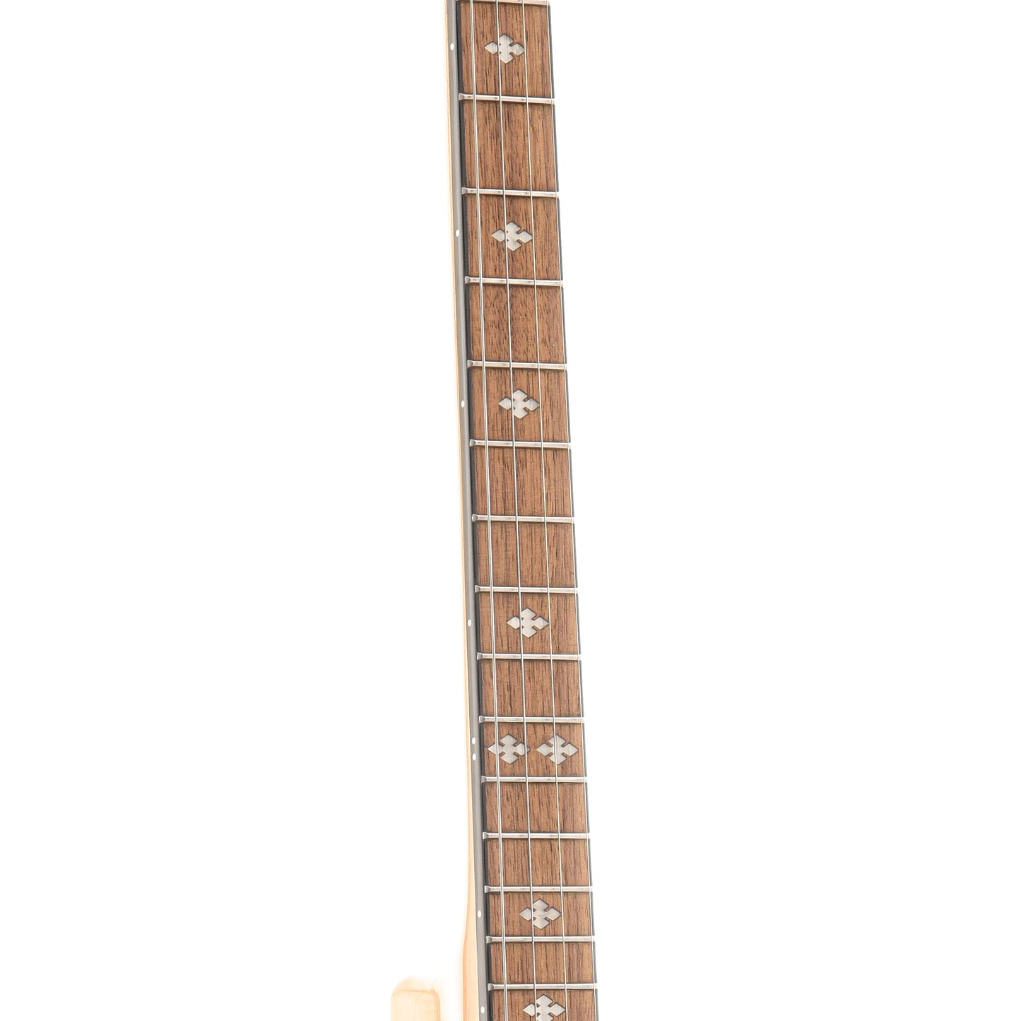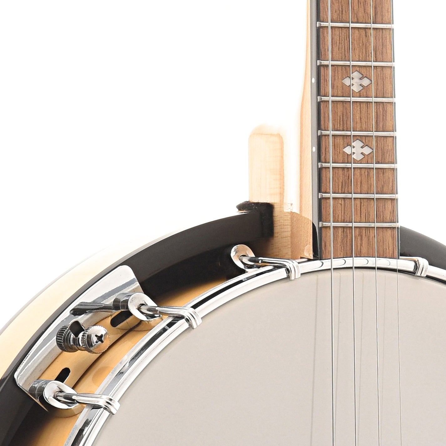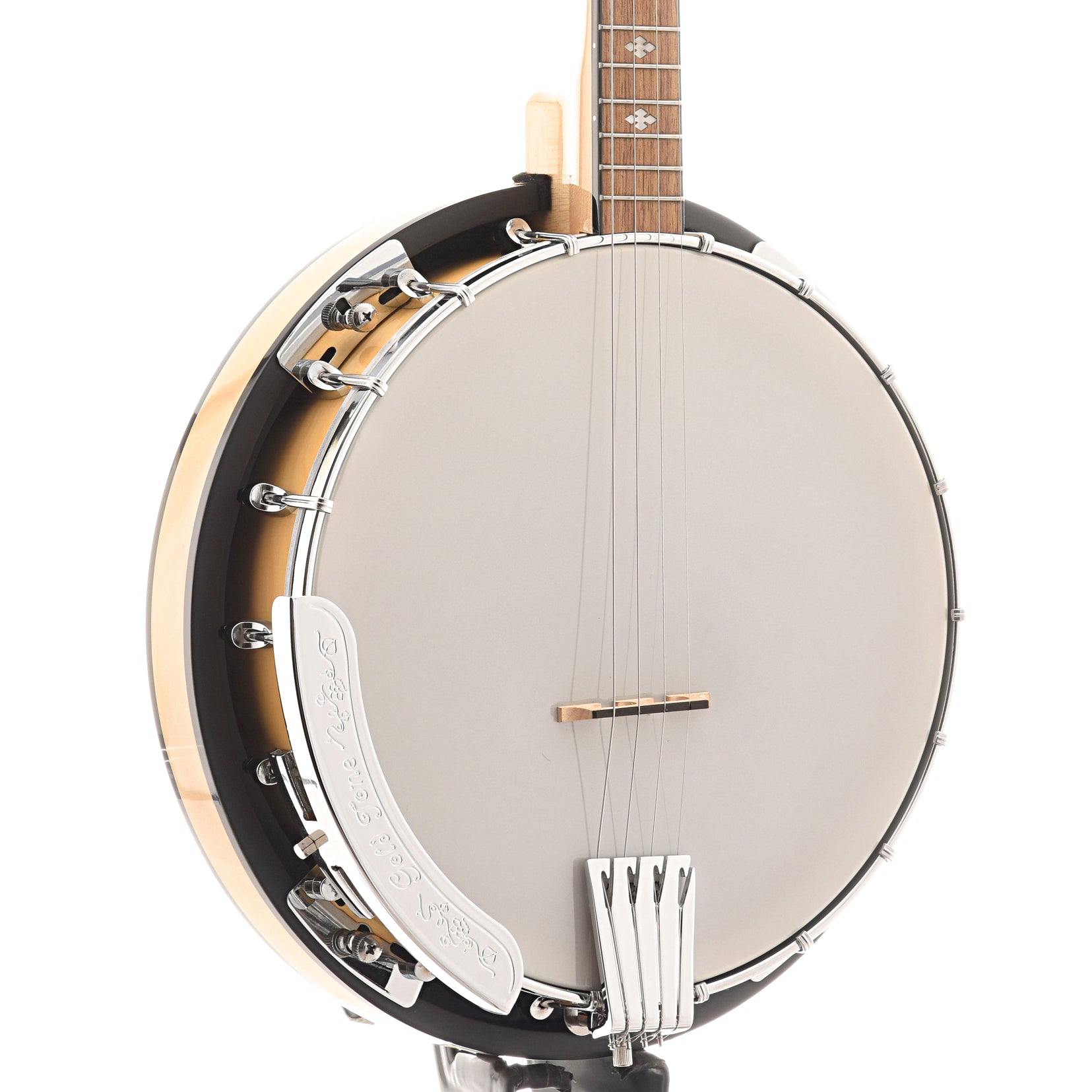 Cripple Creek series 4-string banjo with simple brass hoop tone ring & resonator. Natural satin-finish 19 fret neck (22 5/8" scale), tuned C-G-D-A from low to high, select hardwood fretboard (1 1/14" nut) with diamond inlays, smooth white head (frosted underside), guitar style tuning gears, flat armrest, chrome hardware.