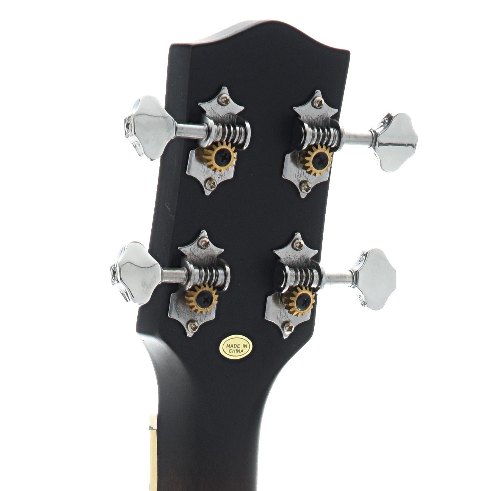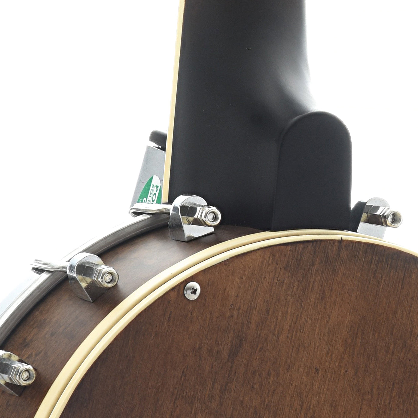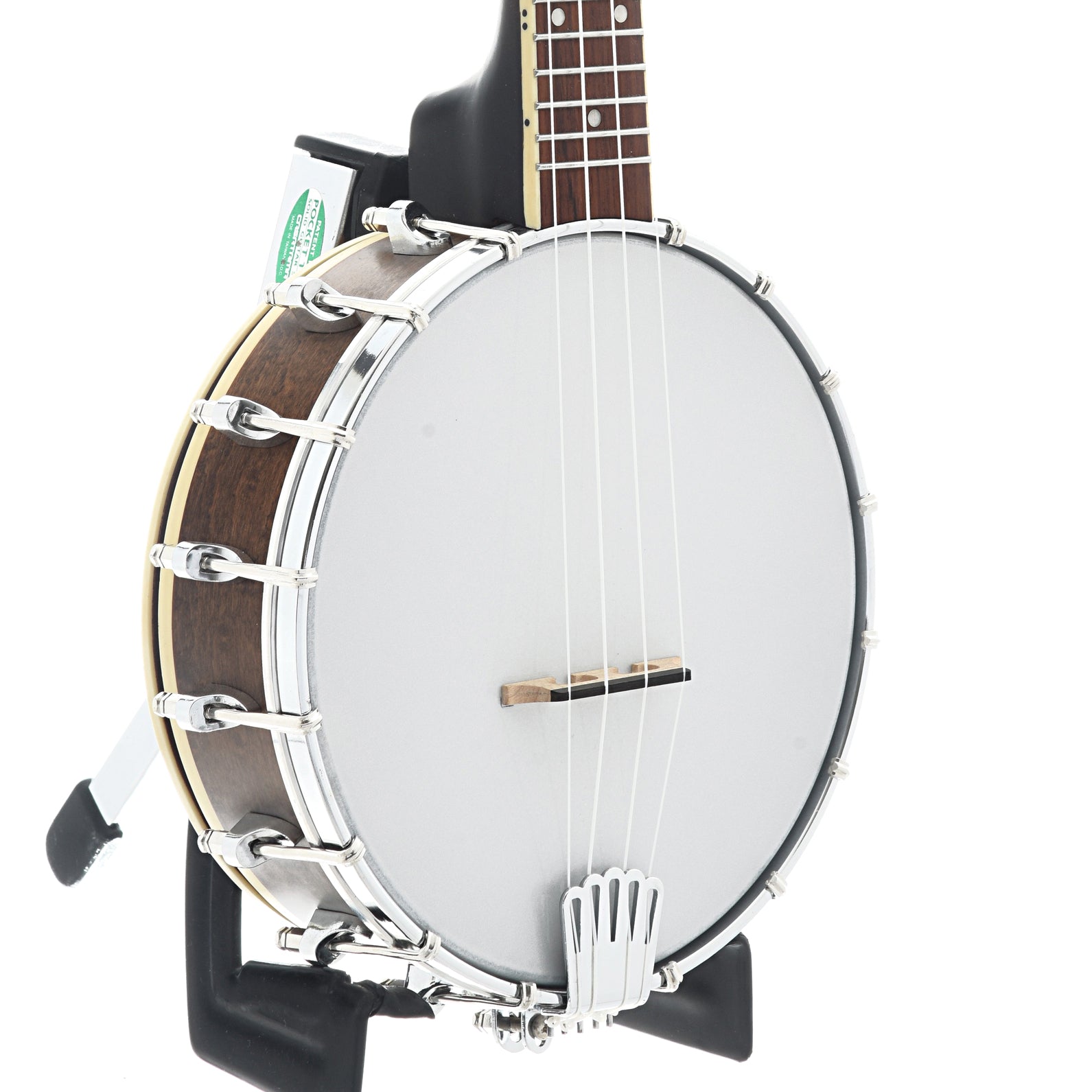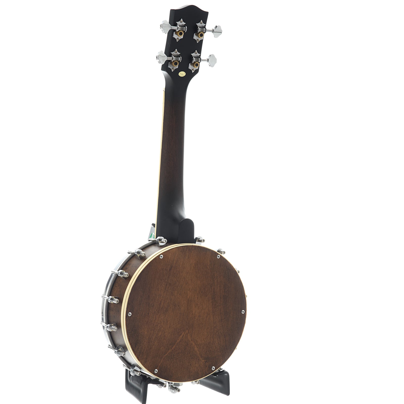 Banjo-uke, with 8" head, maple neck, rim, & small flat cream-bound resonator, vintage brown satin finish, rosewood fretboard (16 frets, soprano scale, 13-1/2") with dot position inlays and cream binding, guitar-style tuning pegs, chrome hardware, white Remo plastic head. Shaped hardshell case.