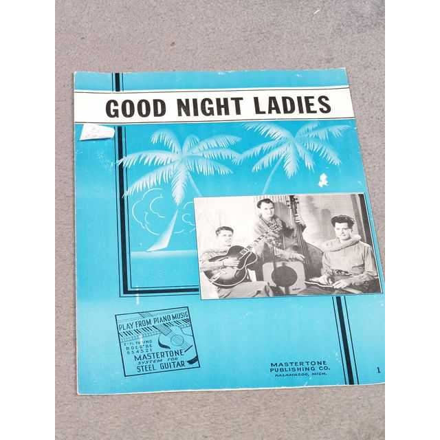 VGC (small 1/2" x 1/4" tear off of blue backround on front cover), sheet music, part of the Gibson "Mastertone System for Steel Guitar" series, copyright 1939, showing the Eastman trio on the front cover playing an L-5, steel guitar, standup bass, with amp, on the back cover is a pitch "YOU Can Play the STeel Guitar" with 6 more photos of various players and groups