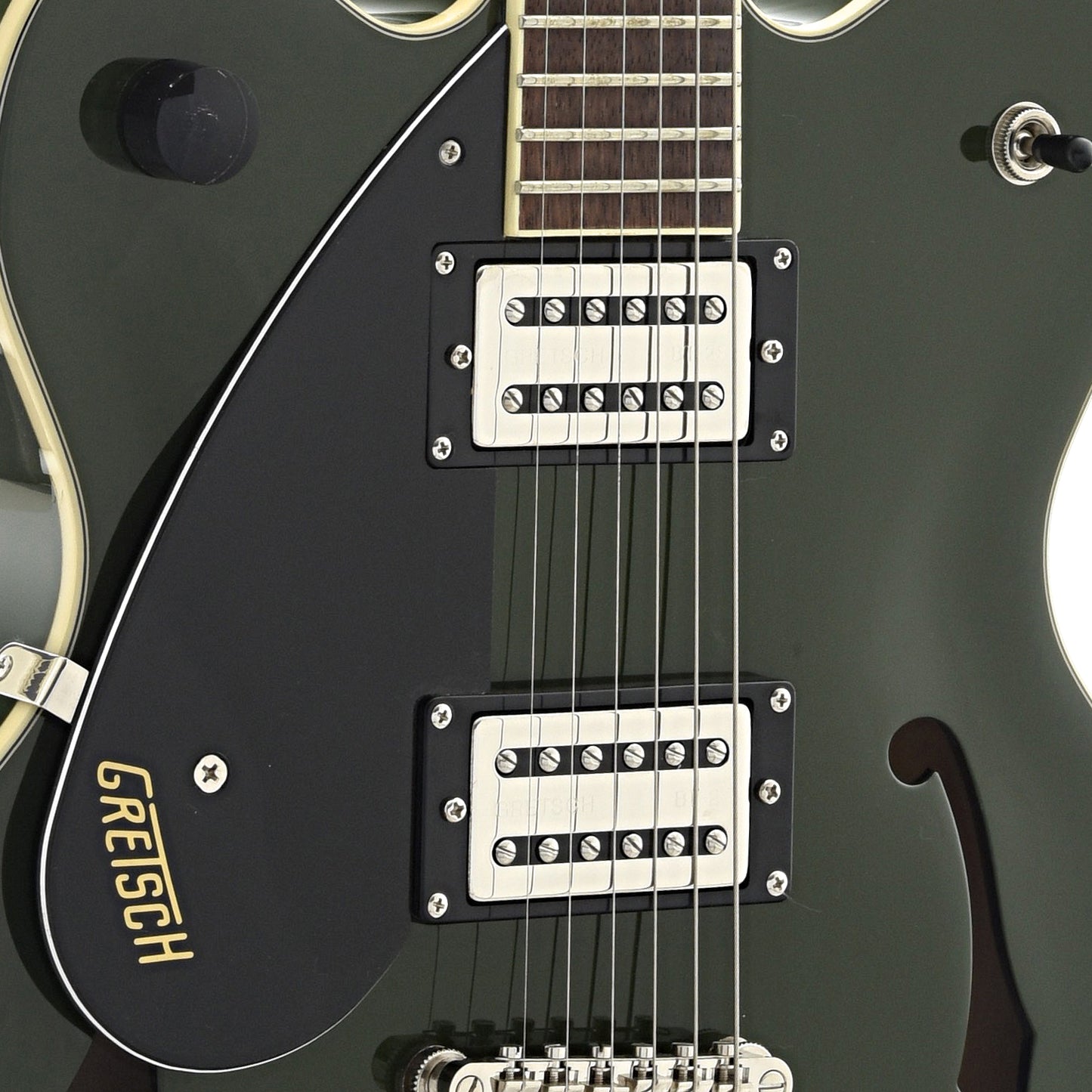 Brash and feedback-resistant, this sleek left-handed model is designed to deliver classic Gretsch style and supercharged tone. The Broad’Tron BT-2S humbucking pickup offers improved definition with tighter bass response for robust lows, pristine highs and a throaty midrange. A lightweight spruce center block runs the length of the body, reinforcing the top while reducing undesired feedback. The thin U-shaped neck features a fast-playing 12”-radius laurel fingerboard with elegant pearloid Big Block inlays and 22 medium jumbo frets. Black control knobs, nickel hardware, and enlarged f-holes add to the visual appeal. A great mix of timeless Gretsch aesthetics and modern features.