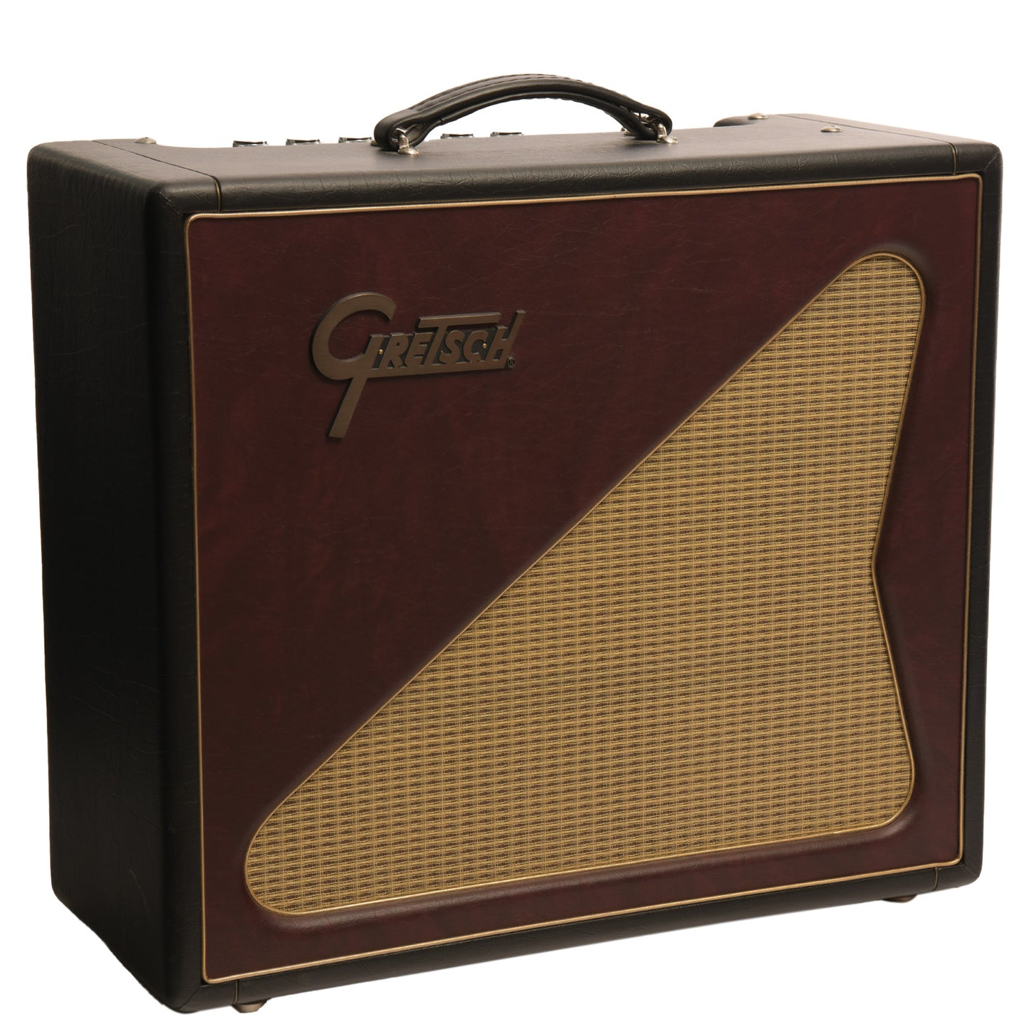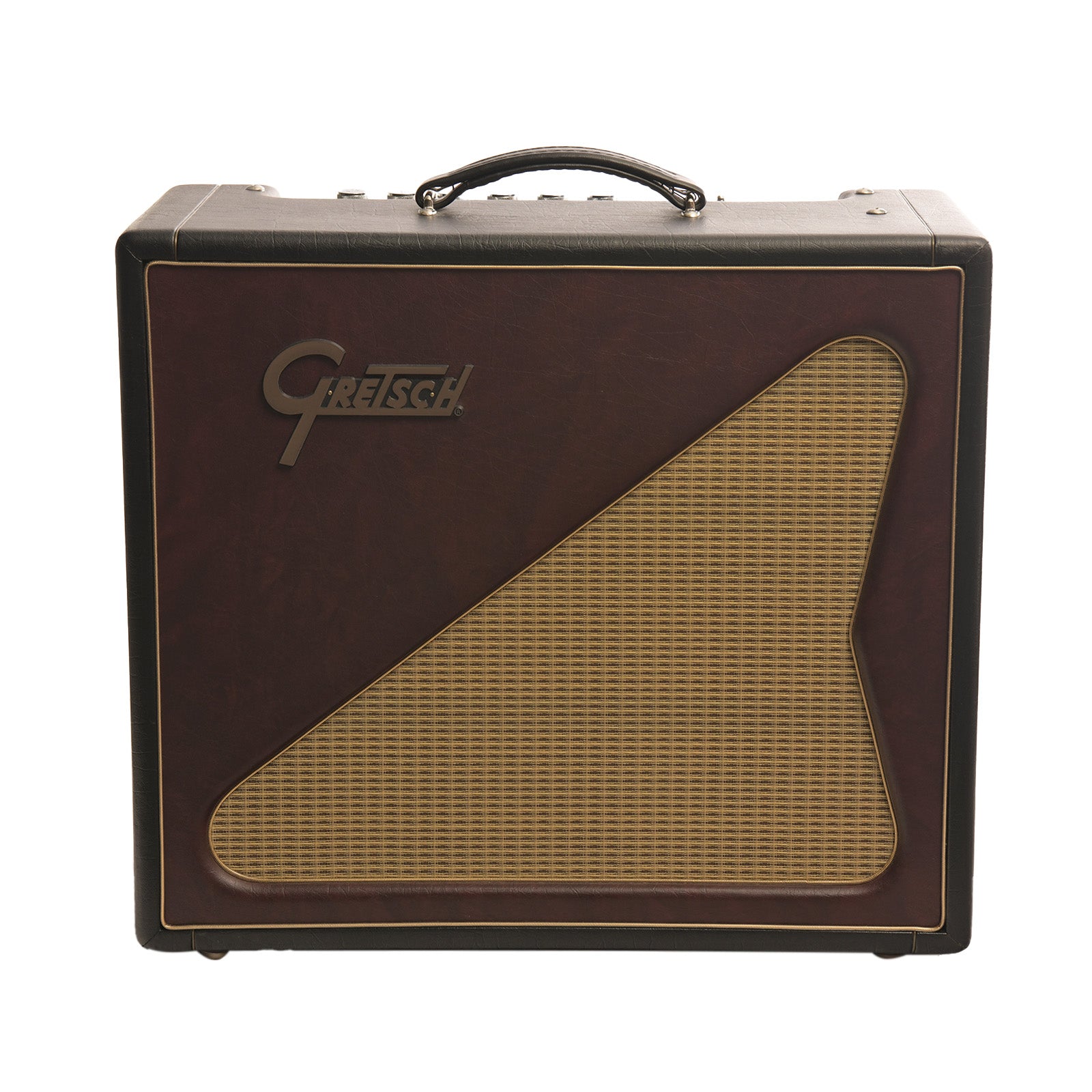 A very nice Retro looking combo, 1X12 (Eminence), 15 tube watts, Tremolo, Old school Gretsch 2-tone styling (black box, brown front), built for Gretsch by Victoria Amps in Chicago