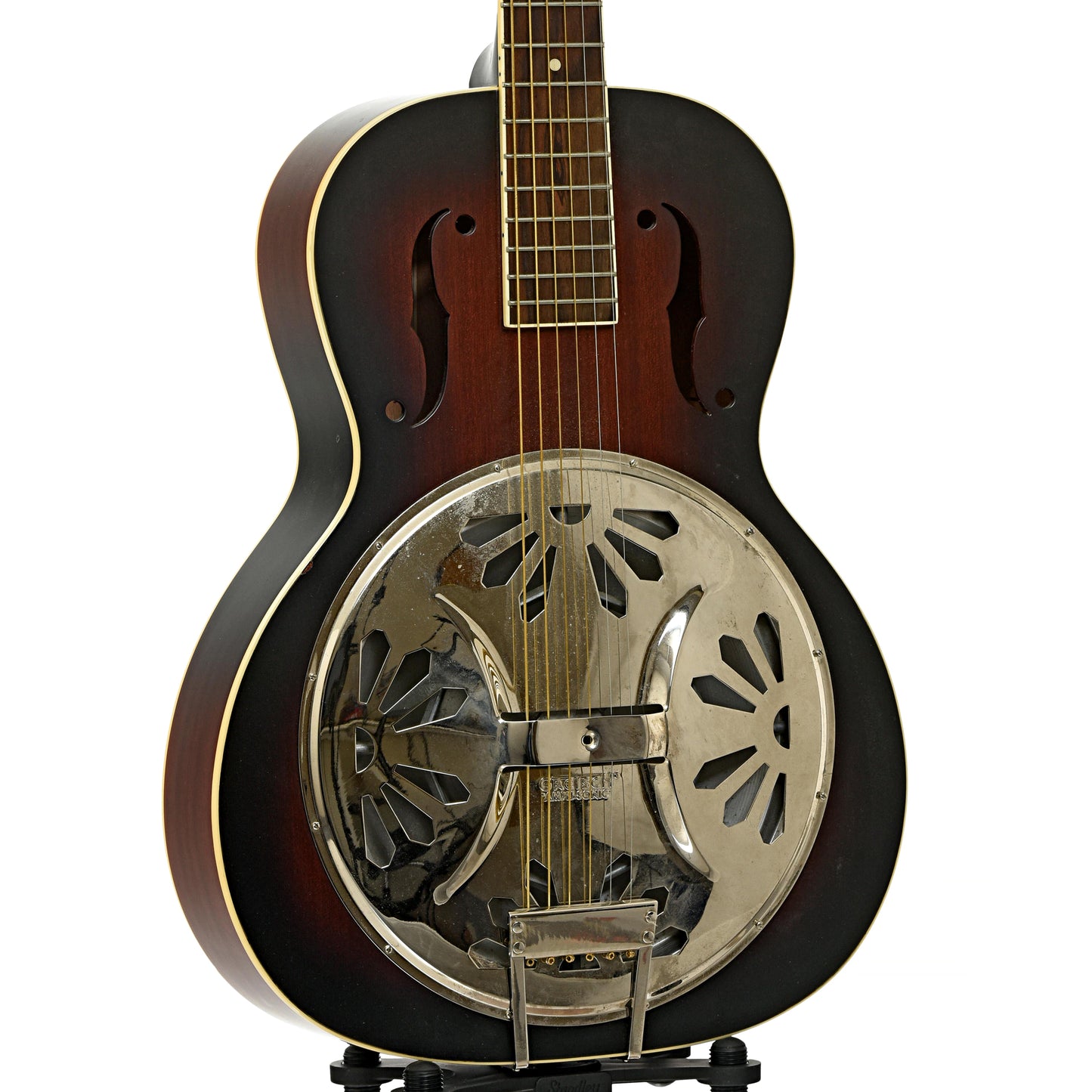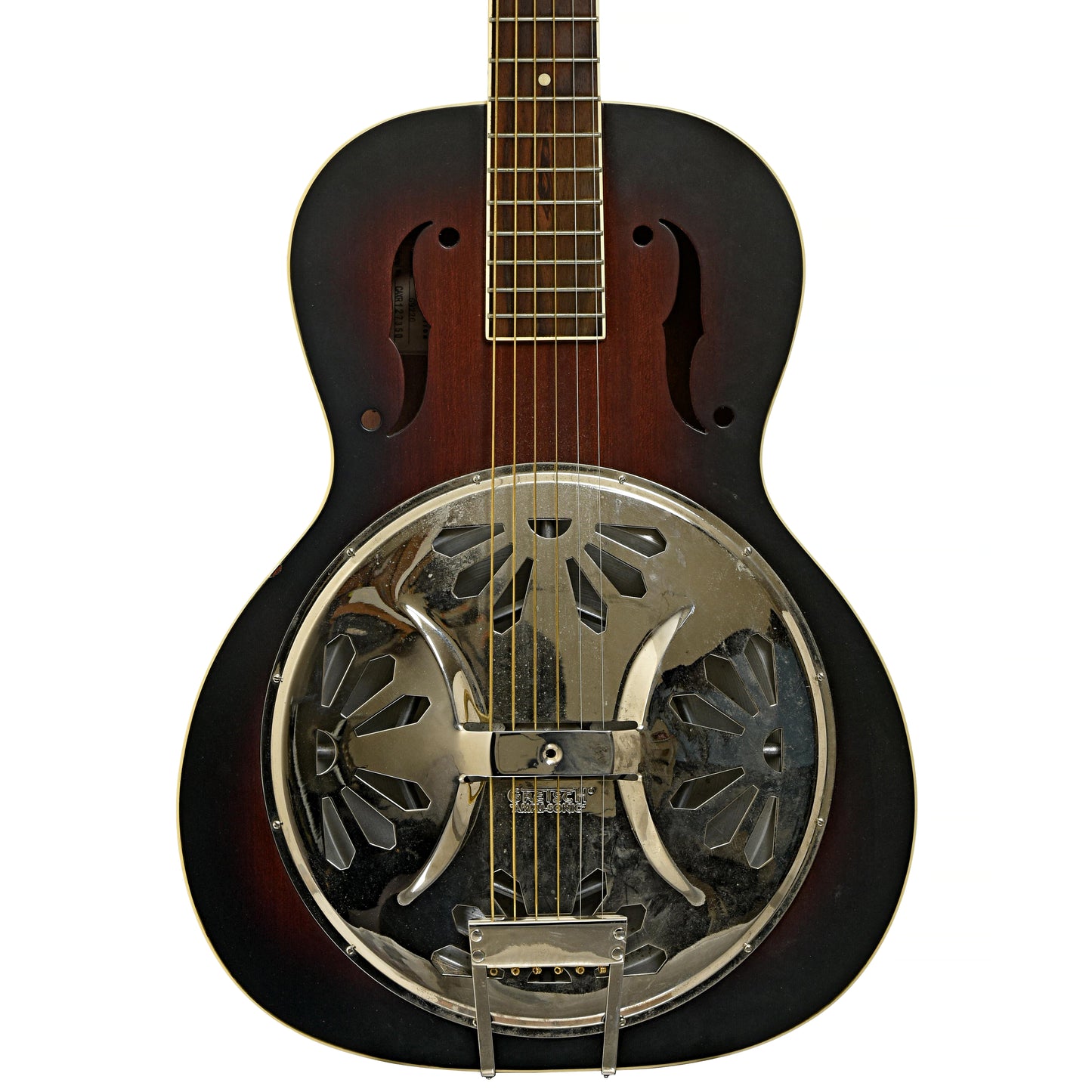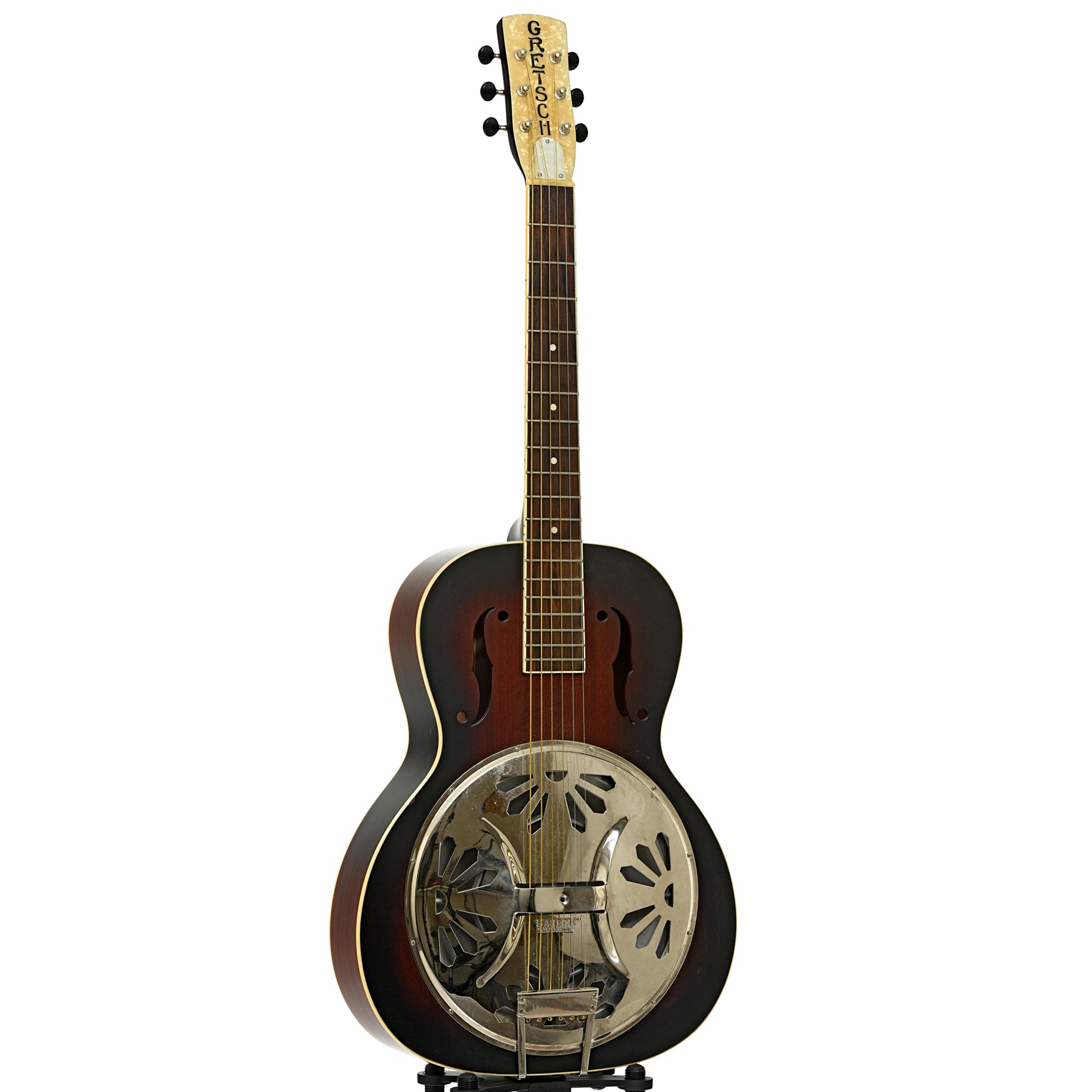 An affordable roundneck resonator by Gretsch, this Bobtail features mahogany body and neck, soundwell, 19 fret bound Padauk fretboard, spider bridge, Poinsettia cover-plate, Grover vintage-style open-gear tuners. Fishman FRGP1 pickup installed. Original hard shell case. Import.