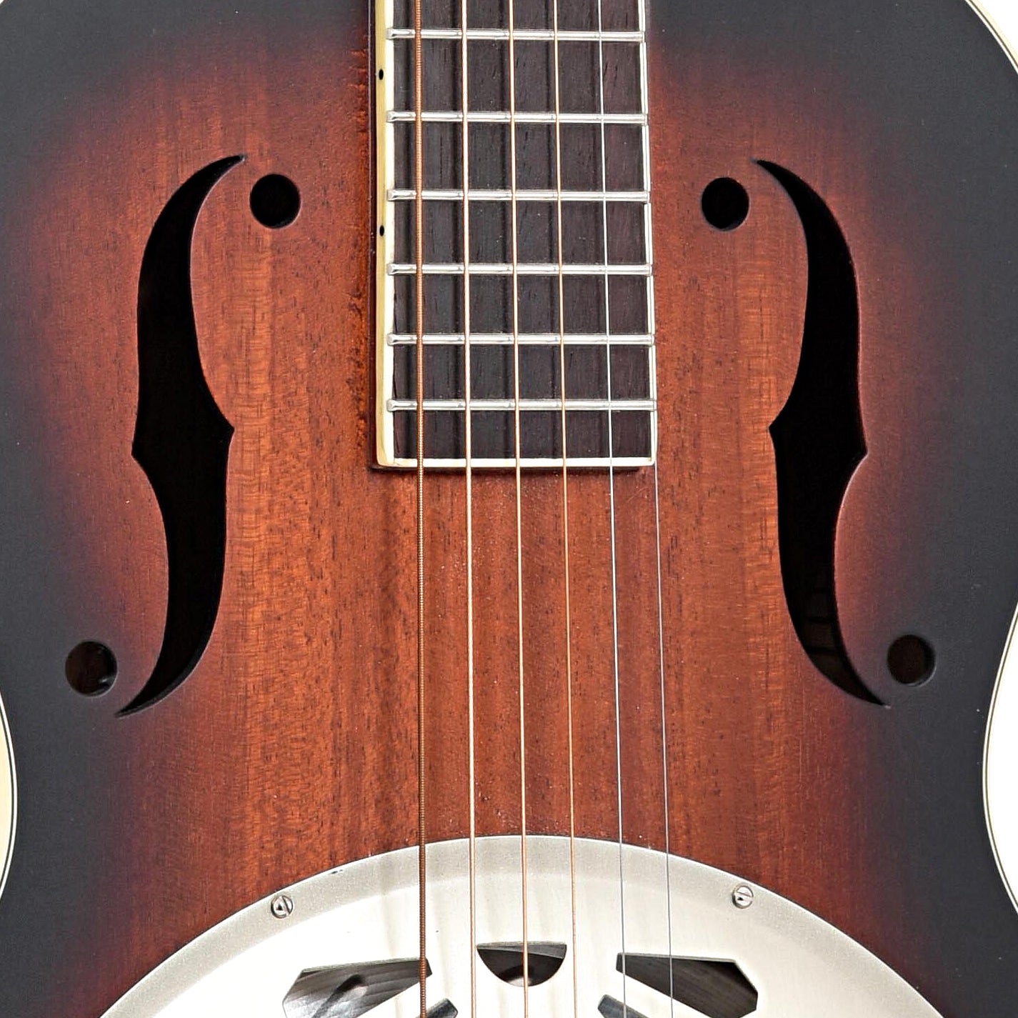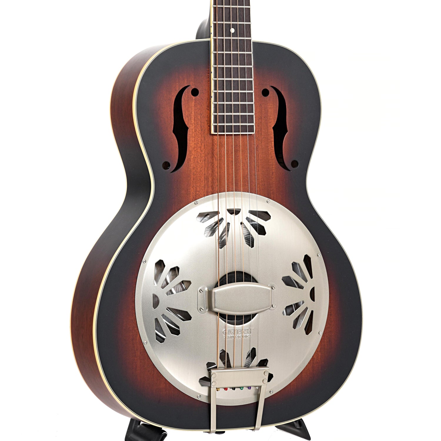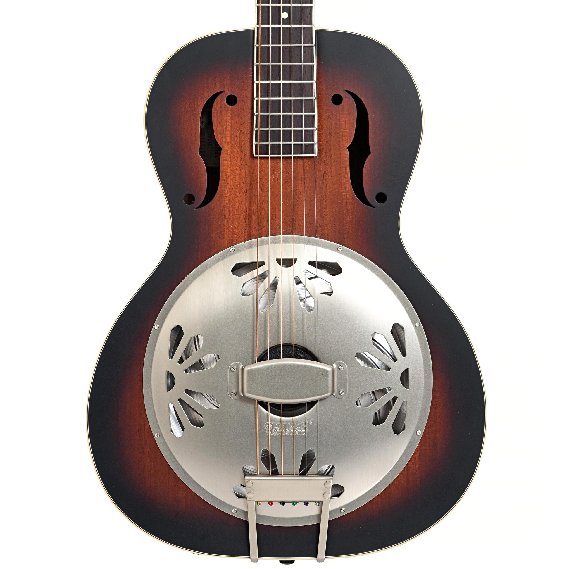 This is a cool entry-level round neck resonator guitar. It has an all mahogany body and neck, aluminum cone and a biscuit bridge. Has that resonator tone. Suitable for slide! (could use new saddle, strings, etc. plays okay - sold AS-IS)