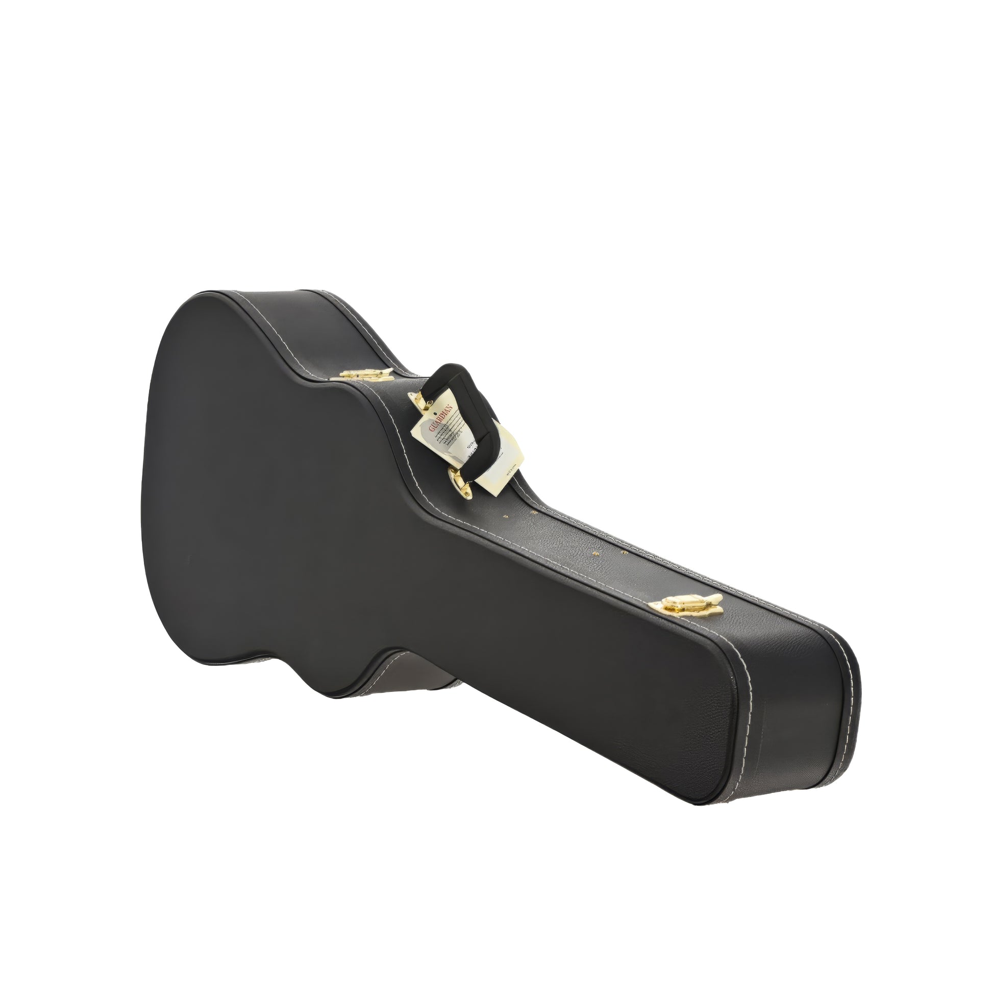 Sturdy 5-ply wooden hardshell case with black plush interior, 12mm padding, black leather-look exterior, single neck support, accessory box, four latches (one locking), plastic handle, gold-plated hardware.